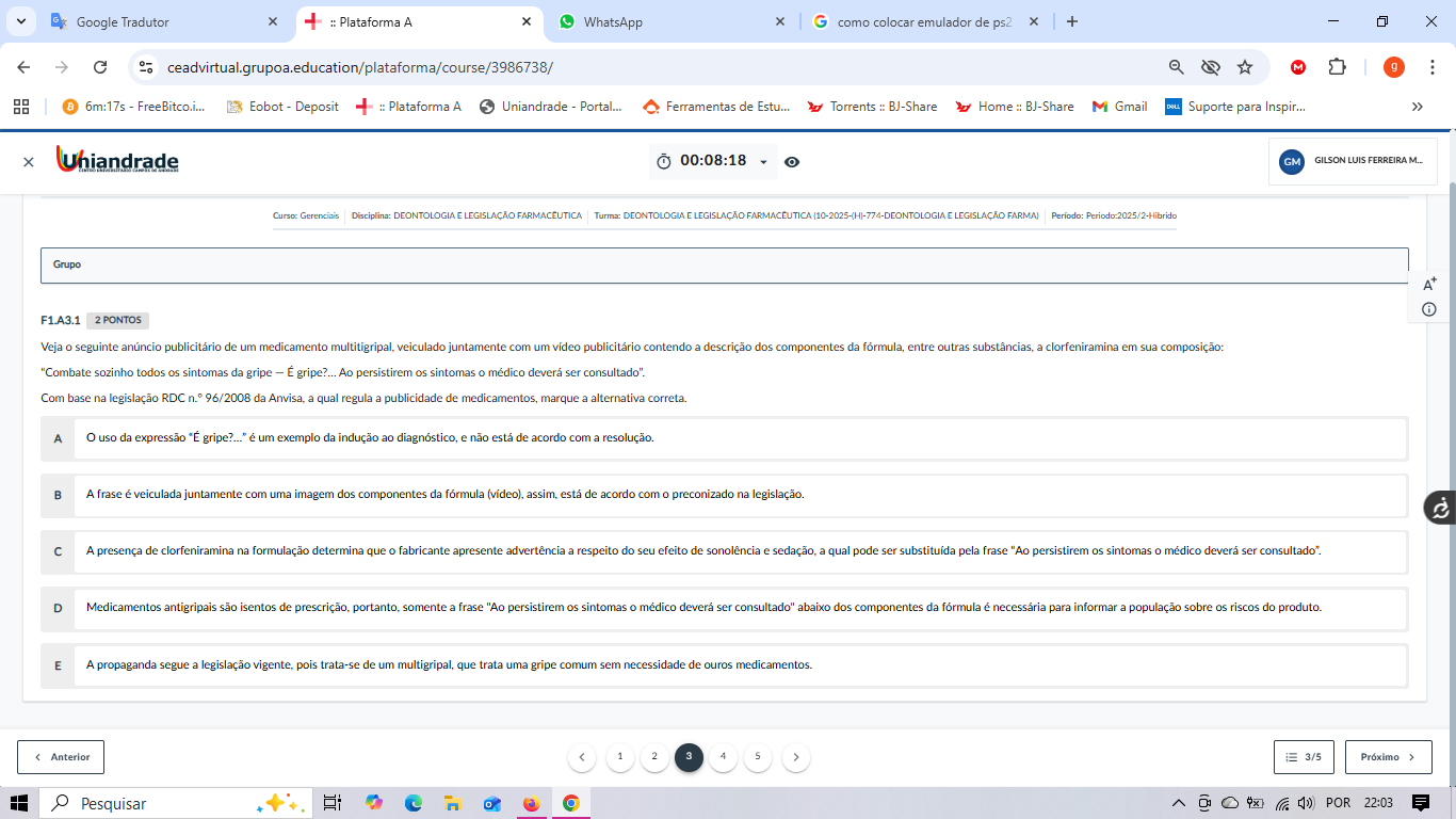 Google Tradutor X Plataforma A X WhatsApp como colocar emulador de ps2 + X g 00 6m:17s Eobot Deposit Plataforma A Uniandrade Portal... Ferramentas de Estu... Torrents BJ-Share Home BJ-Share Gmail Suporte para Inspir... Uniandrade 00:08:18 GM GILSON LUIS FERREIRA Curso: Gerenciais Disciplina: DEONTOLOGIA E LEGISLAÇÃO Turma: DEONTOLOGIA E LEGISLAÇÃO 10-2025-(H)-774-DEONTOLOGIA FARMA) Periodo:2025/2-Hibrido Grupo i F1.A3.1 2 PONTOS Veja seguinte anúncio publicitário de um medicamento veiculado juntamente com um video publicitário contendo a descrição dos componentes da entre outras a clorfeniramina em sua composição: "Combate sozinho todos os sintomas da gripe gripe?... Ao persistirem os sintomas médico deverá ser Com base na legislação RDC 96/2008 da a qual regula a publicidade de marque a alternativa A O uso da expressão "E gripe?..." é um exemplo da indução ao e não está de acordo com a resolução. B A frase é veiculada juntamente com uma imagem dos componentes da de acordo com preconizado na legislação. C A presença de clorfeniramina na formulação determina que fabricante apresente advertência a respeito do seu efeito de sonolência e sedação, a qual pode ser pela frase "Ao persistirem os sintomas médico ser D Medicamentos antigripais são isentos de prescrição, portanto, somente a frase "Ao persistirem os sintomas médico ser consultado" abaixo dos componentes da é necessária para informar a população sobre os riscos do produto. E A propaganda segue a legislação vigente, pois trata-se de um multigripal, que trata uma gripe comum sem necessidade de ouros medicamentos. Anterior 3/5 Pesquisar POR 22:03