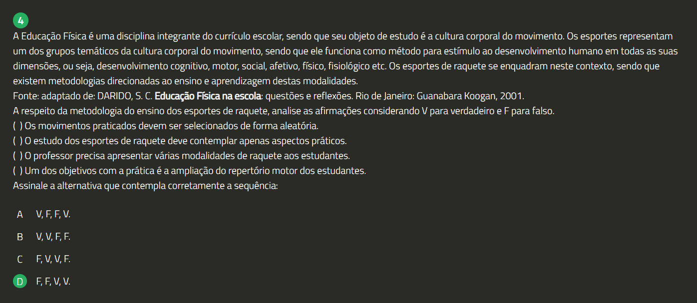 4 A Educação Física é uma disciplina integrante do currículo escolar, sendo que seu objeto de estudo é a cultura corporal do movimento. Os esportes representam um dos grupos temáticos da cultura corporal do movimento, sendo que ele funciona como método para estímulo ao desenvolvimento humano em todas as suas dimensões, ou seja, desenvolvimento cognitivo, motor, social, afetivo, físico, fisiológico etc. Os esportes de raquete se enquadram neste contexto, sendo que existem metodologias direcionadas ao ensino e aprendizagem destas modalidades. Fonte: adaptado de: DARIDO, S.C. Educação Física na escola: questões e reflexões. Rio de Janeiro: Guanabara Koogan, 2001. A respeito da metodologia do ensino dos esportes de raquete, analise as afirmações considerando V para verdadeiro e F para falso. Os movimentos praticados devem ser selecionados de forma aleatória. estudo dos esportes de raquete deve contemplar apenas aspectos práticos. 0 professor precisa apresentar várias modalidades de raquete aos estudantes. Um dos objetivos com a prática é a ampliação do repertório motor dos estudantes. Assinale a alternativa que contempla corretamente a sequência: A V,F,F,V. B F,V,V,F. D F,F,V,V.