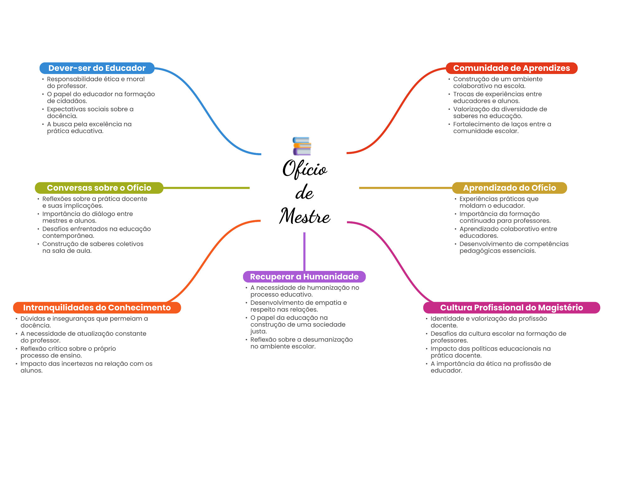 Dever-ser do Educador Comunidade de Aprendizes ética @ moral Construção de um ambiente do professor. colaborativo na escola. papel do educador na formação de experiências entre de cidadãos. Expectativas socials sobre a Valortzação da diversidade de saberes na educação. A busca pela excelência na de entre a educativa. comunidade escolar. Conversas sobre Ofício Aprendizado do Ofício Reflexões sobre a prática docente Experiências práticas que . o educador. do diálogo entre da formação mestres continuada para professores. enfrentados na educação Aprendizado colaborativo entre educadores. Construção de coletivos de competências na sala de pedagógicas Recuperar a Humanidade A necessidade de no processo educativo. Desenvolvimento de empatia Intranquilidades do Conhecimento respeito relações. Cultura Profissional do Magistério Dúvidas inseguranças que permeiam a papel da educação na Identidade valortzação da construção de uma sociedade A de atualização constante justa. da cultura escolar na formação de do professor. sobre a desumanização professores. critica sobre próprio no ambiente escolar. das na processo de ensino. impacto dos na relação com A importância da ética na de alunos. educador.