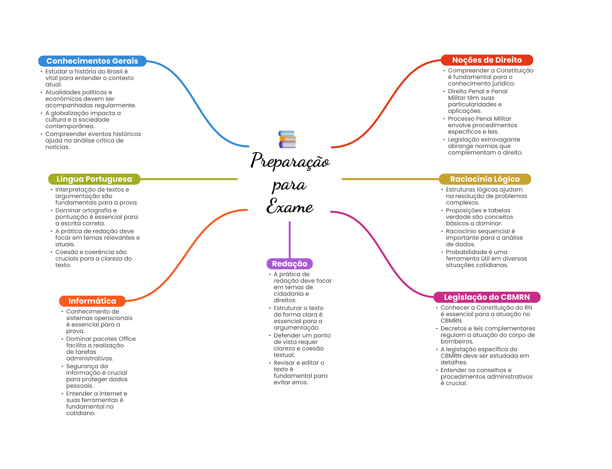 Conhecimentos Gerais Noções de Direito Estudar a história do Brasil Compreender a Constituição vital para entender contexto fundamental para atual. conhecimento jurídico. politicas . Direito Penal . Penal econômicas devem ser têm acompanhadas particularidades A a aplicações. cultura a sociedade Processo Penal envolve procedimentos Compreender eventos específicos ajuda na critica de extravagante noticias. abrange normas que Língua Portuguesa Raciocínio Lógico de textos e Estruturas lógicas ajudam argumentação são na resolução de para a prova. Dominar ortografia Proposições pontuação é essencial para verdade são a escrita correta. a dominar. A prática de redação deve sequencial focar em relevantes . importante para a de dados. e coerência são Probabilidade é uma para a do em texto. Redação situações cotidianas. A de redação deve focar em temas de cidadania Informática direitos. Legislação do CBMRN Estruturar taxto Conhecimento de Conhecer a Constituição do RN de forma clara sistemas para a atuação no essencial para a essencial para a CBMRN. argumentação. prova. Decretos complementares pacotes Office Defender um ponto regulam a atuação do corpo de de vista requer bombeiros. facilita a clareza . cossão de A legislação específica do administrativas. CBMRN deve em Revisar o da taxto informação crucial Entender para proteger dados fundamental para procedimentos administrativos erros. crucial. Entender a ferramentas no cotidiano.