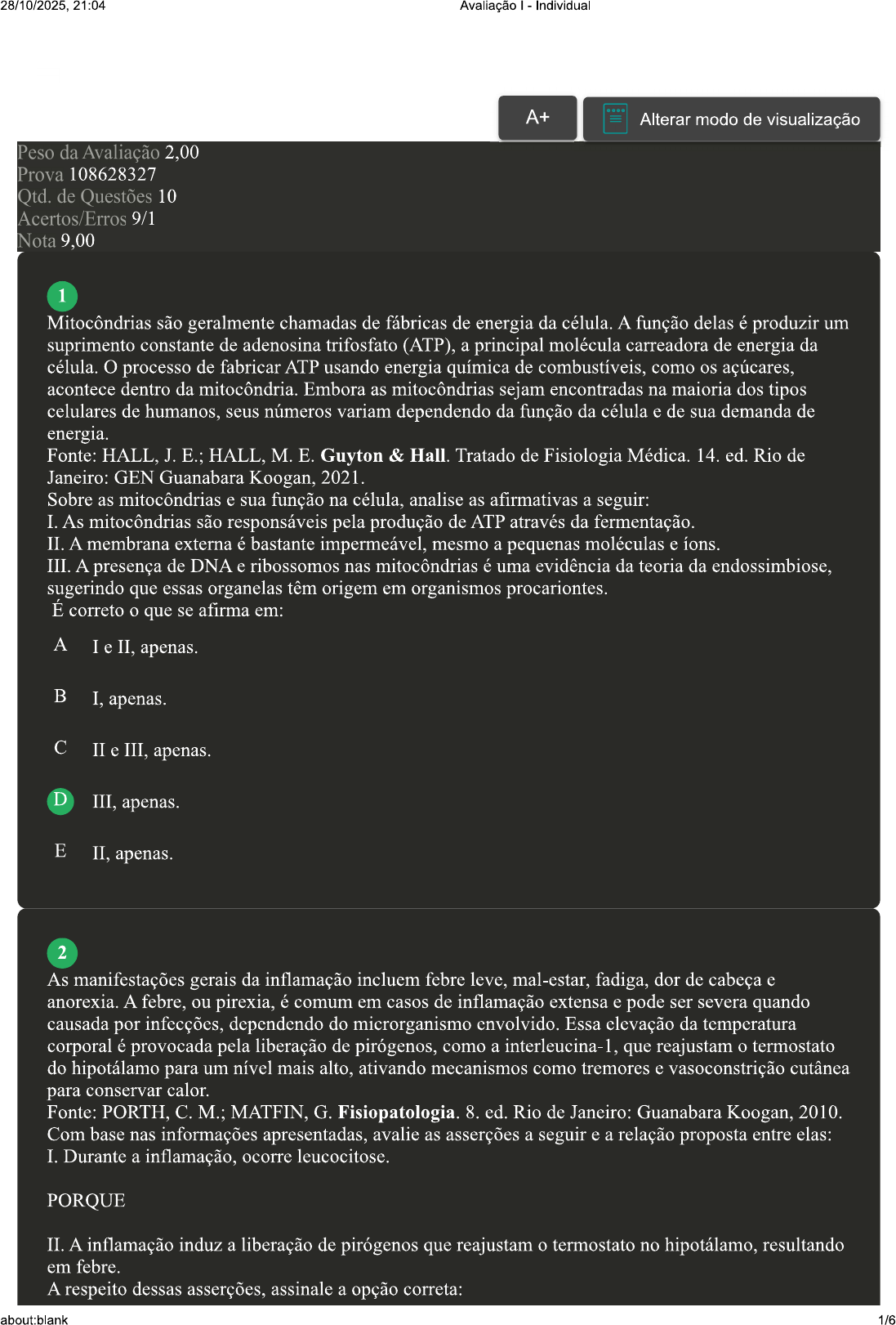 28/10/2025, 21:04 Avaliação - Individual A+ Alterar modo de visualização Peso da Avaliação 2,00 Prova 108628327 Qtd. de Questões 10 Acertos/Erros 9/1 Nota 9,00 1 Mitocôndrias são geralmente chamadas de fábricas de energia da célula. A função delas é produzir um suprimento constante de adenosina trifosfato (ATP), a principal molécula carreadora de energia da célula. O processo de fabricar ATP usando energia química de combustíveis, como os açúcares, acontece dentro da mitocôndria. Embora as mitocôndrias sejam encontradas na maioria dos tipos celulares de humanos, seus números variam dependendo da função da célula e de sua demanda de energia. Fonte: HALL, J. E.; HALL, M. E. Guyton & Hall. Tratado de Fisiologia Médica. 14. ed. Rio de Janeiro: GEN Guanabara Koogan, 2021. Sobre as mitocôndrias e sua função na célula, analise as afirmativas a seguir: I. As mitocôndrias são responsáveis pela produção de ATP através da fermentação. II. A membrana externa é bastante impermeável, mesmo a pequenas moléculas e íons. III. A presença de DNA e ribossomos nas mitocôndrias é uma evidência da teoria da endossimbiose, sugerindo que essas organelas têm origem em organismos procariontes. É correto o que se afirma em: A I e II, apenas. I, apenas. II e III, apenas. D III, apenas. E II, apenas. 2 As manifestações gerais da inflamação incluem febre leve, mal-estar, fadiga, dor de cabeça e anorexia. A febre, ou pirexia, é comum em casos de inflamação extensa e pode ser severa quando causada por infecções, dependendo do microrganismo envolvido. Essa elevação da temperatura corporal é provocada pela liberação de pirógenos, como a interleucina-1, que reajustam o termostato do hipotálamo para um nível mais alto, ativando mecanismos como tremores e vasoconstrição cutânea para conservar calor. Fonte: PORTH, M.; MATFIN, G. Fisiopatologia. 8. ed. Rio de Janeiro: Guanabara Koogan, 2010. Com base nas informações apresentadas, avalie as asserções a seguir e a relação proposta entre elas: I. Durante a inflamação, ocorre leucocitose. PORQUE II. A inflamação induz a liberação de pirógenos que reajustam o termostato no hipotálamo, resultando em febre. A respeito dessas asserções, assinale a opção correta: about:blank 1/628/10/2025, 21:04 Avaliação - Individual A A asserção I é uma proposição verdadeira e a II é uma proposição falsa. B As asserções I e II são falsas. As asserções I e II são verdadeiras, mas a II não é uma justificativa correta da I. D As asserções I e II são verdadeiras, e a II é uma justificativa correta da I. E A asserção I é uma proposição falsa e a II é uma proposição verdadeira. 3 processo de diferenciação celular ocorre quando uma célula relativamente indiferenciada se transforma em uma célula altamente especializada. As células possuem mecanismos pelos quais podem adaptar seu crescimento e diferenciação por meio da alteração das condições do organismo. percurso que leva uma célula desde o estado embrionário mais primitivo até sua completa especialização consiste em uma série de expressões gênicas controladas. Essa transformação envolve uma série de etapas, nas quais a célula passa por modificações em sua estrutura e função, tornando-se cada vez mais especializada. Ao longo desse processo, genes específicos são ativados ou desativados, resultando em alterações na produção de proteínas e, consequentemente, nas características celulares. Fonte: LEHNINGER, L.; NELSON, D. L.; COX, M. M.; KAY, Y. Princípios de bioquímica. 4. ed. São Paulo: Sarvier, 2006. Considerando o processo de diferenciação celular, qual é o mecanismo fundamental que determina a especialização de uma célula embrionária em um tipo celular específico? A A regulação gênica mediada por fatores ambientais externos ao embrião, na clivagem do ovo. B A exposição diferencial a fatores de crescimento durante a gastrulação. A segregação citoplasmática de moléculas determinantes durante a clivagem do ovo. D A interação entre diferentes células do embrião após a clivagem do ovo. E A comunicação intercelular mediada por junções gap durante a morfogênese, na clivage do ovo. 4 Os lisossomos são organelas vesiculares que se formam separando-se do complexo de Golgi e, depois, se dispersando pelo citoplasma. Os lisossomos constituem um sistema digestivo intracelular que permite que a célula digira estruturas celulares danificadas, partículas de alimentos que foram ingeridos pela célula, e materiais indesejados, tais como bactérias. lisossomo geralmente tem diâmetro de 250 a 750 nanômetros. É cercado por membrana de dupla camada lipídica e contém grande número de pequenos grânulos, de 5 a 8 nanômetros de diâmetro, que são agregados proteicos, com até 40 diferentes enzimas da classe das hidrolases (digestivas). Fonte: HALL, J. E.; HALL, M. Guyton & Hall. Tratado de Fisiologia Médica. 14. ed. Rio de Janeiro: GEN Guanabara Koogan, 2021. Sobre a função e os mecanismos de ação dos lisossomos, analise as afirmativas a seguir: I. pH dentro do lisossomo se torna alcalino durante a digestão, facilitando a atividade das hidrolases ácidas. about:blank 2/628/10/2025, 21:04 Avaliação - Individual II. Os lisossomos são responsáveis pela digestão de moléculas orgânicas e utilizam enzimas hidrolíticas que são ativadas em ambiente ácido. III. As células fagocíticas, como os leucócitos, utilizam a fagocitose para ingerir partículas grandes, que são então degradadas em lisossomos. IV. A autofagia é um processo que resulta na degradação de componentes celulares danificados, mas não está relacionada à eficiência energética das células. É correto o que se afirma em: A II e III, apenas. B III e IV, apenas. I, apenas. D I, II, III e IV. E II e IV, apenas. 5 A prevenção de doenças tornou-se uma prioridade no campo da saúde. As causas conhecidas e os 