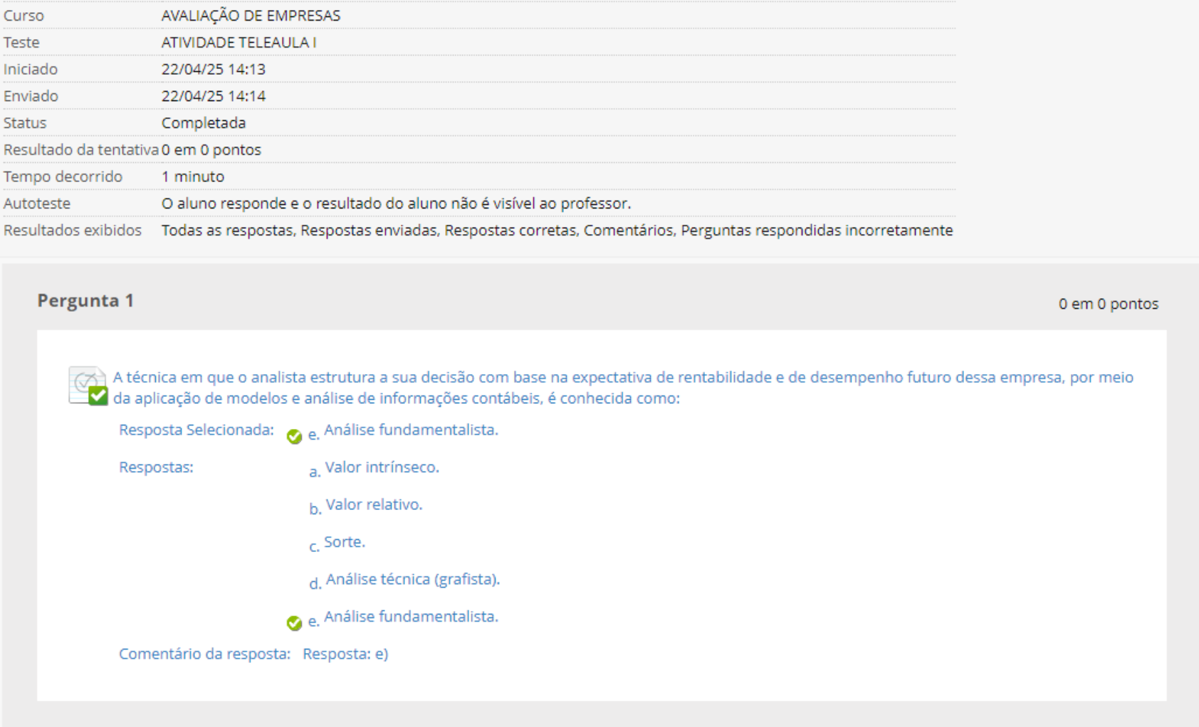 Curso AVALIAÇÃO DE EMPRESAS Teste ATIVIDADE TELEAULA Iniciado 22/04/25 14:13 Enviado 22/04/25 14:14 Status Completada Resultado da tentativa 0 em 0 pontos Tempo decorrido 1 minuto Autoteste aluno responde e resultado do aluno não é visível ao professor. Resultados exibidos Todas as respostas, Respostas enviadas, Respostas corretas, Comentários, Perguntas respondidas incorretamente Pergunta 1 0 em 0 pontos A técnica em que analista estrutura a sua decisão com base na expectativa de rentabilidade e de desempenho futuro dessa empresa, por meio da aplicação de modelos e análise de informações contábeis, é conhecida como: Resposta Selecionada: e. Análise Respostas: a. Valor intrínseco. b. Valor relativo. C. Sorte. d. Análise técnica (grafista). e. Análise fundamentalista. Comentário da resposta: Resposta: e)Pergunta 2 em 0 pontos Qual é Ke para uma empresa que apresenta um risco 30% maior do que o risco sistemático da carteira de mercado e que retorno da carteira de mercado é igual a 15,0%, admitindo-se uma taxa livre de risco de Resposta Selecionada: a. 18,0%. Respostas: a. 18,0%. b. C. 30,0%. d. 20,0%. e. 45,0%. Comentário da resposta: Resposta: a)Pergunta 3 0 em 0 pontos Qual é o objetivo de cada empresa ao determinar a sua estrutura ótima de capital por meio do gerenciamento do custo de suas fontes de financiamento? Resposta Selecionada: b. Aumentar valor econômico da empresa. Respostas: a. Aumentar 0 preço das ações. b. Aumentar 0 valor econômico da empresa. C. Aumentar a fama da empresa no mercado. d. Diminuir 0 risco de mercado da empresa. e. Diminuir risco de crédito da empresa. Comentário da resposta: Resposta: b)Pergunta 4 0 em 0 pontos Uma empresa cria valor quando o retorno da sua operação é suficiente para remunerar os credores e acionistas e, ainda, gerar uma rentabilidade excedente. Com base nessa afirmação, é correto afirmar que: Resposta Selecionada: e. ROI > WACC. Respostas: a. ROI > Ki. d. ROI > Ke. e. ROI > WACC. Comentário da resposta: Resposta: e)