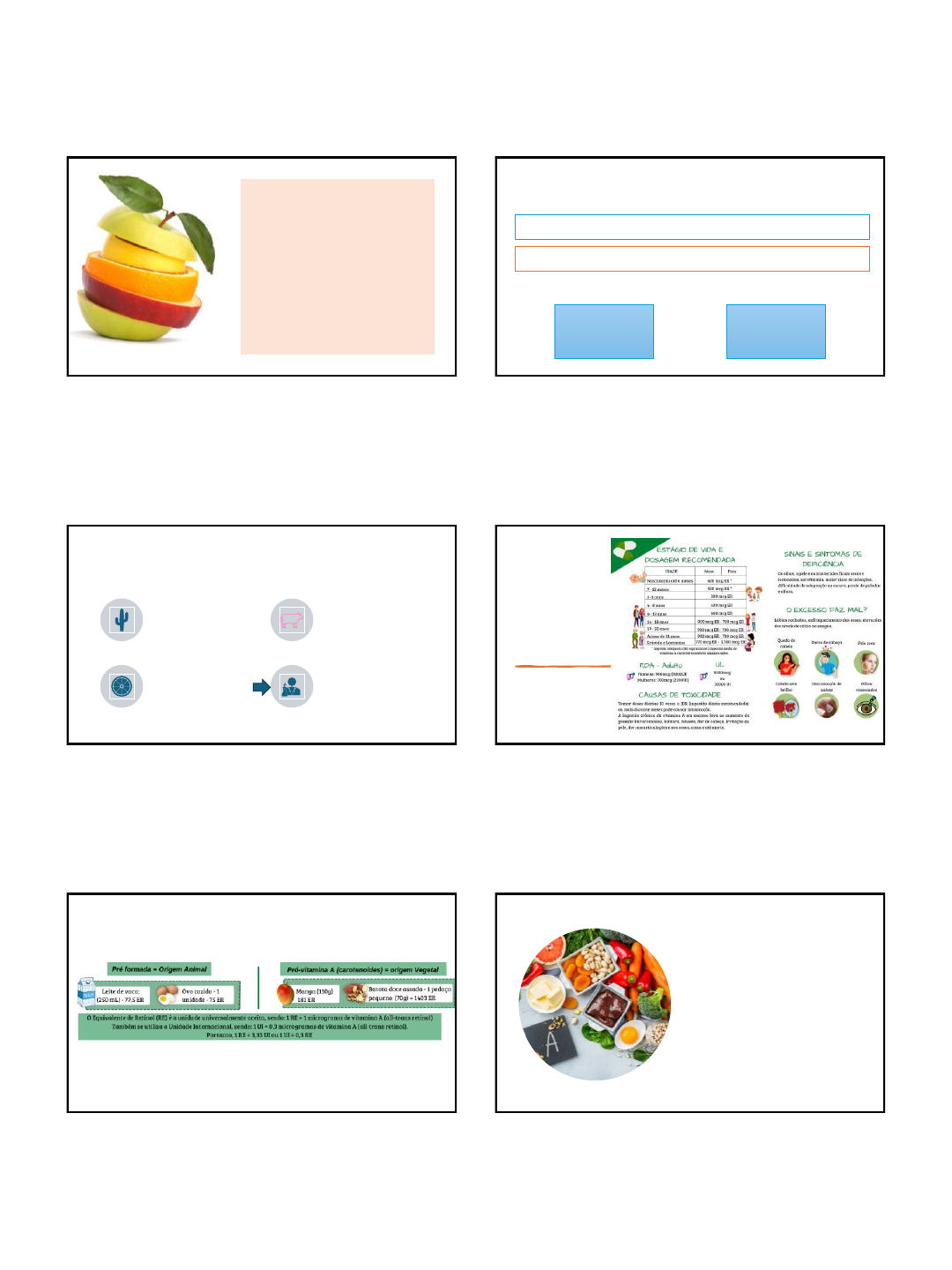 20/10/2025 1 Recomendações de micronutrientes Profª Drª Aline Veroneze Especificidades e recomendações para micronutrientes São compostos orgânicos diferentes de gorduras, carboidratos e proteínas, componentes naturais que normalmente estão presentes em pequenas quantidades nos alimentos; A sua ingestão torna-se necessária porque o organismo não consegue sintetizá-los em quantidade necessária para satisfazer as necessidades fisiológicas normais. Sua ausência ou deficiência pode causar alguma condição. Vitaminas lipossolúveis (solúveis em gordura) Vitaminas hidrossolúveis (solúveis em água) Vitamina A Existem duas fontes de vitamina A Origem animal: encontrada sob a forma de retinol, que dentro do organismo é oxidado em retinaldeído e em seguida oxidado em ácido retinóico; Origem vegetal: encontrada sob a forma de carotenoide, que é uma pró-vitamina, sendo sua forma mais ativa o betacaroteno. São compostos que podem ser convertidos em vitaminas ativas, em que seis betacarotenos são iguais a um retinol. Vitamina A Fontes Alimentares Fontes Alimentares • Em relação às fontes alimentares, a vitamina A pré-formada (retinol) é encontrada nos alimentos de origem animal, como fígado, rim, manteiga, gema de ovo, leite integral, queijos, creme de leite e óleo de fígado de peixes; • A pró-vitamina A (betacaroteno) é proveniente dos alimentos de origem vegetal, sendo encontrado em frutas e hortaliças de cor alaranjada, como cenoura, moranga, abóbora, manga e mamão, e vegetais de folhas verde- escuras, como mostarda, couve, agrião e almeirão. 1 2 3 4 5 6 20/10/2025 2 Vitamina D Vitamina D2: presente no tecido vegetal (utilizada na fortificação dos alimentos); Vitamina D3: origem animal, presente na pele de mamíferos. Ambas necessitam de raios solares para serem convertidas no rim para a forma ativa. D2-Ergocalciferol e D3-Colecalciferol. Vitamina D As substâncias calciferol (D2) e colecalciferol (D3) apresentam atividade de vitamina D, conhecida como vitamina anti-raquitismo; O colecalciferol (D3) é formado pela ação da luz solar, raios ultravioleta, sobre o 7- dehidrocolesterol da pele. Ambas as formas são esteróis, com as mesmas propriedades de solubilidade apresentada pelas gorduras. Fontes Alimentares • Poucos alimentos contêm quantidades significativas de vitamina D. As principais fontes são derivadas de alimentos de origem animal; • As principais fontes dietéticas de vitamina D são os alimentos do grupo de leite, queijo e iogurte; • Gema de ovo, fígado, leite integral, iogurte, queijo minas, cogumelo shitake, manteiga, atum, sardinha, truta, óleos de fígado de peixes (arenque, cavala, sardinha e atum), camarão. Vitamina D Vitamina E - Tocoferol A vitamina E é uma vitamina lipossolúvel, que apresenta características de solubilidade semelhantes às dos lipídios, e é geralmente encontrada na fração lipídica dos alimentos. Sua função principal mais conhecida é a atividade antioxidante. Vitamina E - Tocoferol 7 8 9 10 11 12 20/10/2025 3 Vitamina E Vitamina K • Principalmente dois compostos químicos apresentam atividade de vitamina K: filoquinona (vitamina K1) e a menaquinona (vitamina K2) - naturais. • K1 (filoquinona): de origem vegetal, presente em plantas verdes; • K2 (menaquinona): de origem animal e também formada a partir da ação bacteriana do trato gastrointestinal TGI; • K3 (menadiona): composto sintético mais potente biologicamente. Vitamina K Vitamina K Recomendações de nutrientes Profª Drª Aline Veroneze 13 14 15 16 17 18 20/10/2025 4 • Suprir demandas fisiológicas individuais, necessárias para promover a saúde e prevenir doenças/carências, ou seja, manter o indivíduo nutrido. Necessidade: • Suprir as necessidades da maior parte dos indivíduos saudáveis de uma população.Recomendação: Necessidade x Recomendação Exemplo Necessidade Nutricional → Ferro → 1,08mg/dia Recomendação Nutricional → Ferro → 8mg/dia • Fatores considerados na diferença: ➢ Perdas Basais – eliminação; ➢ Peso; ➢ Biodisponibilidade do nutriente; ➢ Facilitadores/Redutores da absorção; ➢ Perdas menstruais, no caso das mulheres. Necessidades Nutricionais • As necessidades de homens parecem ser maiores do que as de mulheres quando relacionadas por pessoa, mas quando as necessidades são expressas por peso corporal, os valores são similares; • Na menarca e menopausa aumenta a necessidade de ferro. Necessidades Nutricionais • As necessidades aumentam durante a gestação, à medida que o feto cresce, e durante a lactação, na proporção da quantidade de leite produzido. Necessidades Nutricionais • Com o avanço da idade, a massa magra e a atividade declinam e declinam as necessidades de energia. • PORÉM, isso não ocorre com as necessidades de nutrientes essenciais. Recomendações Nutricionais São determinadas como sendo a quantidade de energia e nutrientes que são necessárias para a maioria dos indivíduos de um grupo/população. “As quantidades de energia e de nutrientes que devem conter os alimentos consumidos para satisfazer as necessidades de quase todos os indivíduos de uma população sadia (média das necessidades de vários conjuntos de indivíduos + 2 desvios- padrão = 97,5% da população)”. 19 20 21 22 23 24 20/10/2025 5 Histórico 1835 Grã-Bretanha Primeiros sinais formais de um padrão dietético Oferta de suco de limão para os trabalhadores da marinha mercante Prevenção do escorbuto Histórico 1860 Grã-Bretanha Foi solicitado um parecer de um tipo de dieta para manter a saúde pelo menor custo 3000 kcal e 81g ptn/dia (~11%) 1865 Para trabalhador o valor de proteína subiu para 119g/dia – trabalhos braçais pesados Histórico 1937 Já tinham conhecimento de 7 vitaminas e 4 minerais 1939 → MARCO (Variabilidade Individual) Documento que compilou todos os achados e informou que 50% devem ser somados à necessidade média para cobrir a v
