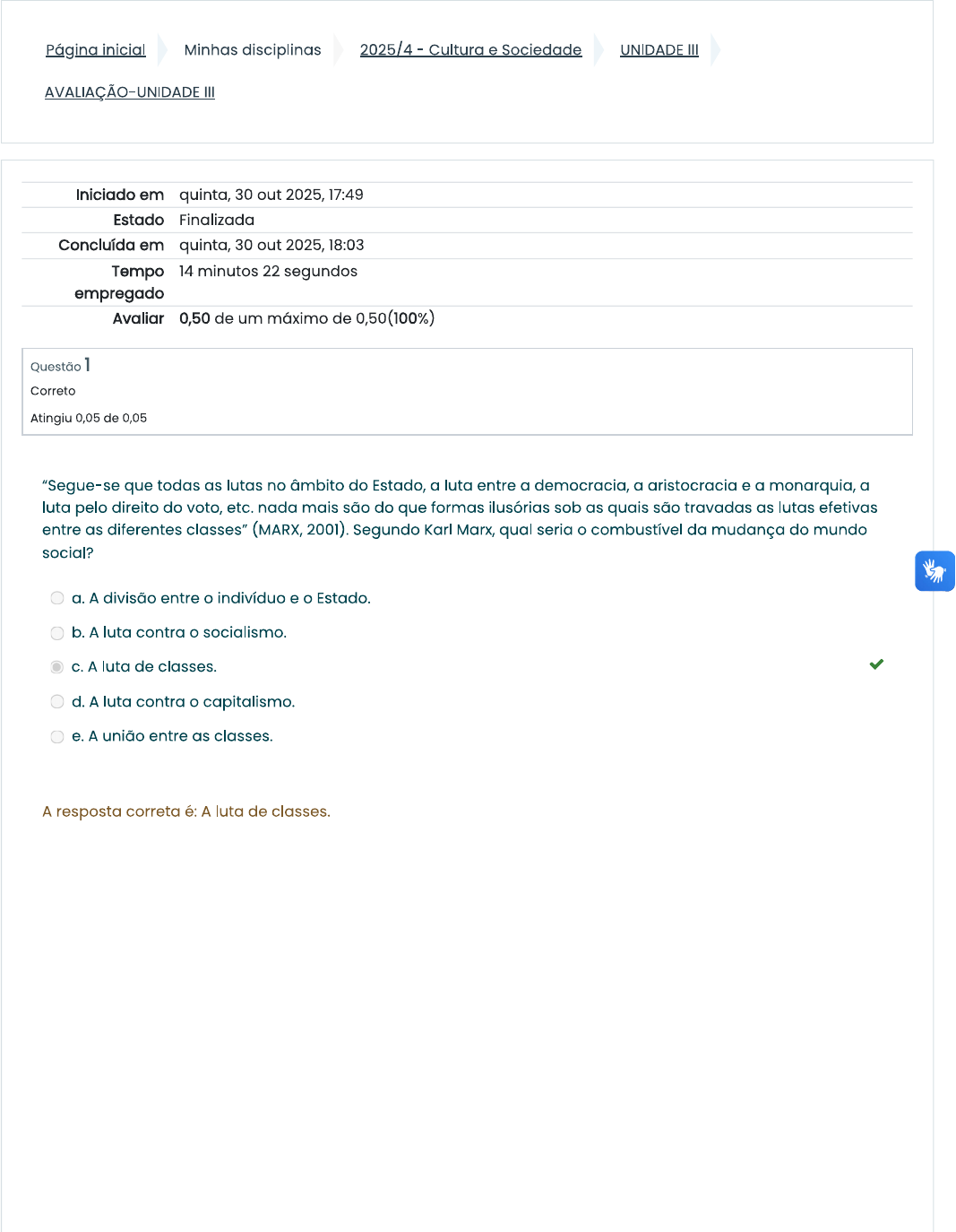 Página inicial Minhas disciplinas 2025/4 Cultura e Sociedade UNIDADE III AVALIAÇÃO-UNIDADE III Iniciado em quinta, 30 out 2025, 17:49 Estado Finalizada Concluída em quinta, 30 out 2025, 18:03 Tempo 14 minutos 22 segundos empregado Avaliar 0,50 de um máximo de 0,50(100%) Questão 1 Correto Atingiu 0,05 de 0,05 "Segue-se que todas as lutas no âmbito do Estado, a luta entre a democracia, a aristocracia e a monarquia, a luta pelo direito do voto, etc. nada mais são do que formas ilusórias sob as quais são travadas as lutas efetivas entre as diferentes classes" (MARX, 2001). Segundo Karl Marx, qual seria combustível da mudança do mundo social? a. A divisão entre indivíduo e Estado. b. A luta contra socialismo. C. luta de classes. d. A luta contra capitalismo. e. A união entre as classes. A resposta correta é: A luta de classes.Questão 2 Correto Atingiu 0,05 de 0,05 Segundo os pressupostos psicossociais da exclusão, a quem a culpabilização atribui sucesso e fracasso? a. Atribui às causalidades sociais. b. Atribui exclusivamente às pessoas particulares. C. Atribui às causalidades históricas e sociais. d. Atribui às causalidades históricas. e. Atribui-se ao liberalismo. A resposta correta é: Atribui exclusivamente às pessoas particulares. Questão 3 Correto Atingiu 0,05 de 0,05 Para Guareschi (2002), a exclusão social é um processo complexo e multifacetado, com dimensões materiais, políticas, relacionais e subjetivas. Não é uma coisa ou um estado, é um processo que envolve homem por inteiro e a sua relação com os outros. Não tem uma única forma e não é uma falha do sistema, devendo ser combatida como algo que perturba a ordem social; ao contrário, ele é produto do funcionamento do sistema. Conforme estudamos no capítulo intitulado "A Sociedade Capitalista e as Relações de Poder", alguns pressupostos psicossociais permitem a legitimação da exclusão. Um desses pressupostos é a: a. Catequização. b. Aculturação. C. Culpabilização. d. Democratização. e. Globalização. A resposta correta é: Culpabilização.Questão 4 Correto Atingiu 0,05 de 0,05 "O ser humano, como ser isolado e egoísta (dogmas do liberalismo), tem de competir para sobreviver, de um lado, e, de outro lado, para trazer progresso" (GUARESCHI, 2002). Com base no capítulo intitulado "A Sociedade Capitalista e as Relações de Poder", quais foram as consequências palpáveis do estabelecimento e funcionamento dessa relação de competitividade, criadas pelo liberalismo? a. Exclusão. b. Progresso. Ordem. d. Inclusão. e. Retrocesso. A resposta correta é: Exclusão. Questão 5 Correto Atingiu 0,05 de 0,05 Por que, segundo Marx, a divisão do trabalho ocupa espaço fundante e central na construção ideológica? a. Essa divisão implica fundamentalmente a combinação entre indivíduo e a coletividade, que, por sua vez, encontra no Estado um defensor dos interesses reais do indivíduo. b. Porque a divisão social do trabalho envolve a especialização das tarefas e das funções econômicas entre indivíduos. Isso permite que as pessoas desenvolvam suas habilidades de forma remunerada. C. Porque a divisão do trabalho determina de que maneira homem se organizará para viver em sociedade. d. divisão do trabalho pode ter efeitos significativos sobre a sociedade, incluindo igualdade, reconhecimento e distribuição de poder e influência. e. Porque a divisão do trabalho evita desigualdades sociais e econômicas. A resposta correta é: Porque a divisão do trabalho determina de que maneira homem se organizará para viver em sociedade.Questão 6 Correto Atingiu 0,05 de 0,05 Acerca da divisão de trabalho para Karl Marx, assinale a alternativa correta. a. Marx afirma que a divisão do trabalho ocupa espaço fundante e central na construção ideológica porque a sua existência determina de que maneira homem se organizará para viver em sociedade. b. Para Marx, trabalho não é só satisfação das próprias necessidades individuais e imediatas, mas é a expressão de um valor maior: nele se forma a consciência pessoal e social, se manifesta caráter público e universal do ser humano. Marx afirma que o trabalho deveria ser realizado por etapas a fim de que cada trabalhador fosse se aperfeiçoando e melhorando seu empenho ao longo da produção. d. Para Marx, as divisões do trabalho que os homens estabelecem em sociedade se perpetuam com tempo e espaço, sendo uma expressão do próprio convívio de homens e mulheres. e. Marx afirma que homem modifica a natureza por meio de seu trabalho, fazendo com que resultado de seu esforço se torne sua propriedade. A resposta correta é: Marx afirma que a divisão do trabalho ocupa espaço fundante e central na construção ideológica porque a sua existência determina de que maneira o homem se organizará para viver em sociedade. Questão 7 Correto Atingiu 0,05 de 0,05 Analise as afirmativas a seguir: I) As relações de poder que homens estabelecem em sociedade são fluidas e alteram-se de acordo com tempo e espaço, sendo uma expressão do próprio convívio de homens e mulheres. II) poder no capitalismo é uma questão de classe. III) Quando fala de trabalho, Marx fala sobre as relações que o homem estabelece com a natureza para garantir a sua sobrevivência. IV) Entender as dimensões ideológicas e profundas que perpassam as relações sociais e se manifestam de maneira política é entender que a política em uma sociedade capitalista é, essencialmente, uma questão de classe. Com base no capítulo intitulado "A Sociedade Capitalista e as Relações de Poder", é correto que se afirma em: a. Apenas II, III e IV estão corretas. b. Apenas I, e III estão corretas. C. Apenas e IV estão corretas. d. Todas as afirmativas estão corretas. e. Apenas e IV estão corretas. A resposta correta é: Todas as afirmativas estão corretas.Questão 8 Correto Atingiu 0,05 de 0,05 A quem remete a concepção moderna de dialética? a. Heráclito de 