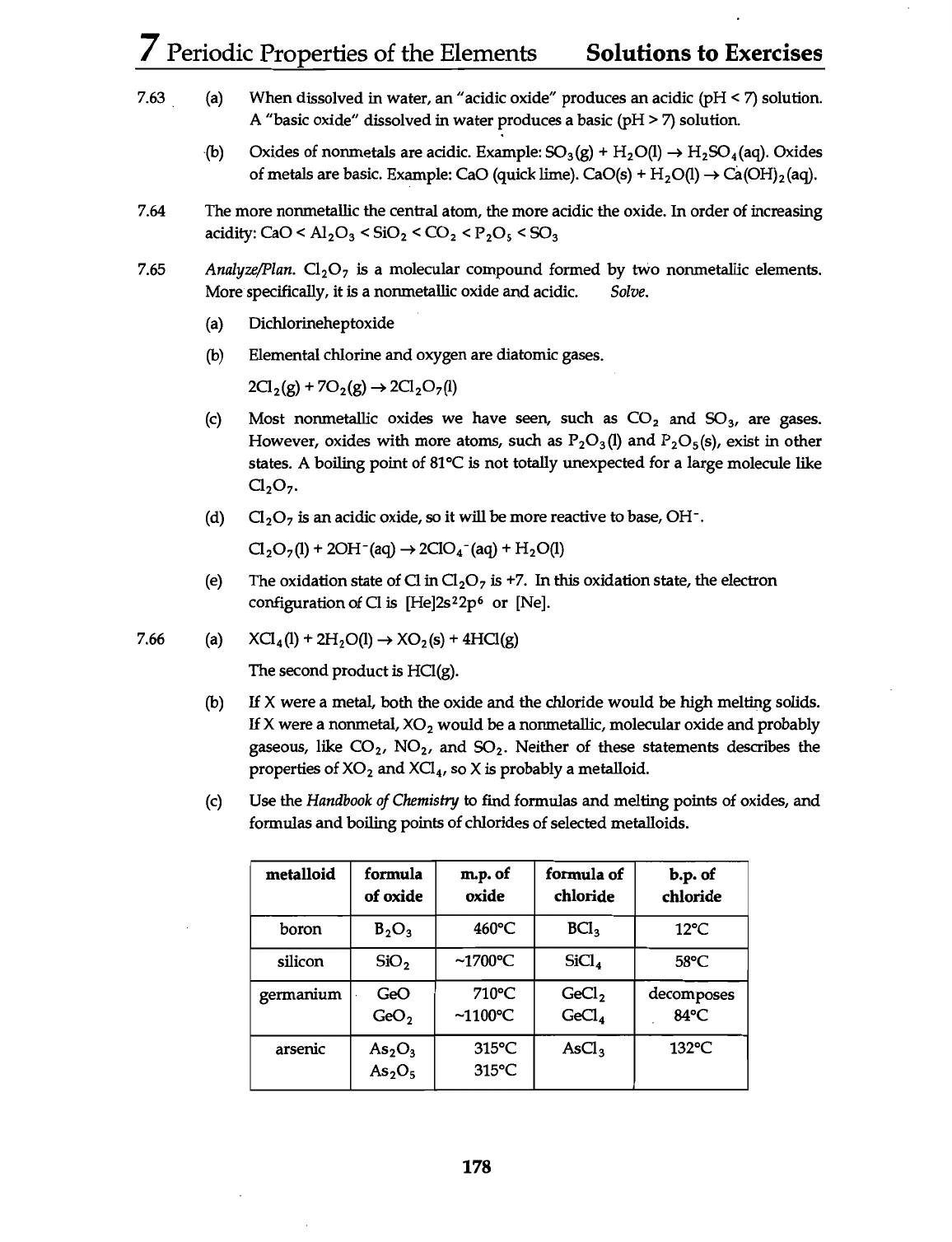 7 Periodic Properties of the Elements Solutions to Exercises 7.63 (a) When dissolved in water, an "acidic oxide" produces an acidic (pH 7) solution. (b) Oxides of nonmetals are acidic. Example: SO₃(g) + Oxides of metals are basic. Example: CaO (quick lime). CaO(s) + Ca(OH)₂(aq). 7.64 The more nonmetallic the central atom, the more acidic the oxide. In order of increasing acidity: CaO