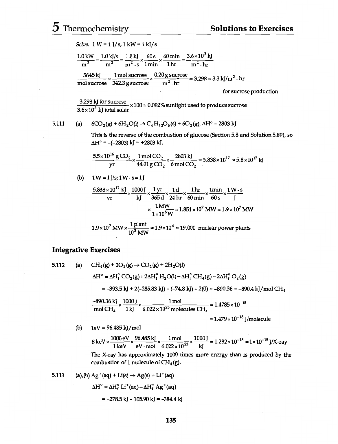 5 Thermochemistry Solutions to Exercises Solve. 1.0 kW = 1.0 kJ/s = 1.0kJ 60 min = 3.6x10³ kJ m² m² m² min 1hr m² hr 5645 kJ X 1 mol sucrose 0.20 sucrose = 3.298 = kJ/m - hr mol sucrose 342.3 g sucrose m² hr for sucrose production 3.298 kJ for sucrose X 100 = 0.092% sunlight used to produce sucrose 3.6x10³ kJ total solar 5.111 (a) C₆H₁₂O₆(s) + (g), = 2803 kJ This is the reverse of the combustion of glucose (Section 5.8 and Solution 5.89), so = -(-2803) kJ = +2803 kJ. 5.5 10¹⁶ yr X 1 mol CO₂ CO₂ X 6 mol kJ = 5.838 X 10¹⁷ = 5.8x10¹⁷ kJ (b) 5.838 X yr 10¹⁷ kJ 1000] kJ 365 1 yr d 24 1d hr 60 1hr min 1min 1W-s J 1MW 1.9x10⁷ MW 10³ 1 plant = = 19,000 nuclear power plants MW Integrative Exercises 5.112 (a) = -393.5 kJ + 2(-285.83 (-74.8 2(0) = -890.36 = -890.4 kJ/mol CH₄ -890.36 1 mol mol CH₄ 1kJ 6.022 molecules CH₄ = 10⁻¹⁸ = 1.479 X 10⁻¹⁸ J/molecule (b) 8 keV X 1000 1 keV 96.485 eV - mol 6.022 X kJ = = J/X-ray The X-ray has approximately 1000 times more energy than is produced by the combustion of 1 molecule of CH₄(g). 5.113 Ag(s) + = -278.5 kJ 105.90 135