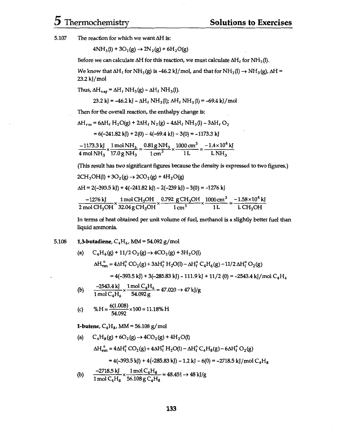 5 Thermochemistry Solutions to Exercises 5.107 The reaction for which we want is: + -> Before we can calculate for this reaction, we must calculate for We know that for NH₃(g) is -46.2kJ/mol, and that for NH₃(g), AH = 23.2kJ/mol Thus, 23.2 kJ = = Then for the overall reaction, the enthalpy change is: = H₂O(g) + N₂ - - O₂ = 6(-241.82 kJ) + 2(0) 4(-69.4 - 3(0) = -1173.3 kJ -1173.3kJ 1 mol 1000 cm³ - 1.4x 10⁴ kJ 4 mol X 17.0 1L LNH₃ (This result has two significant figures because the density is expressed to two figures.) AH = 2(-393.5 kJ) + 4(-241.82 - 2(-239 - 3(0) = -1276 kJ -1276kJ 0.792 g 1000 = - 2 mol 32.04 1L L CH₃OH In terms of heat obtained per unit volume of fuel, methanol is a slightly better fuel than liquid ammonia. 5.108 1,3-butadiene, (a) C₄H₆(g) + = CO₂(g) + - C₄H₆(g) - O₂(g) = 4(-393.5 kJ) + kJ) 111.9 + 11/2 (0) = -2543.4 kJ/mol (b) 1 mol C₄H₆ 54.092 C₄H₆ = 47.020 -> 47kJ/g (c) (a) + = 4(-393.5 kJ) + - 6(0) = -2718.5 kJ/mol C₄H₈ (b) -2718.5 1 mol C₄H₈ = 48.451 -> C₄H₈ 56.108 133