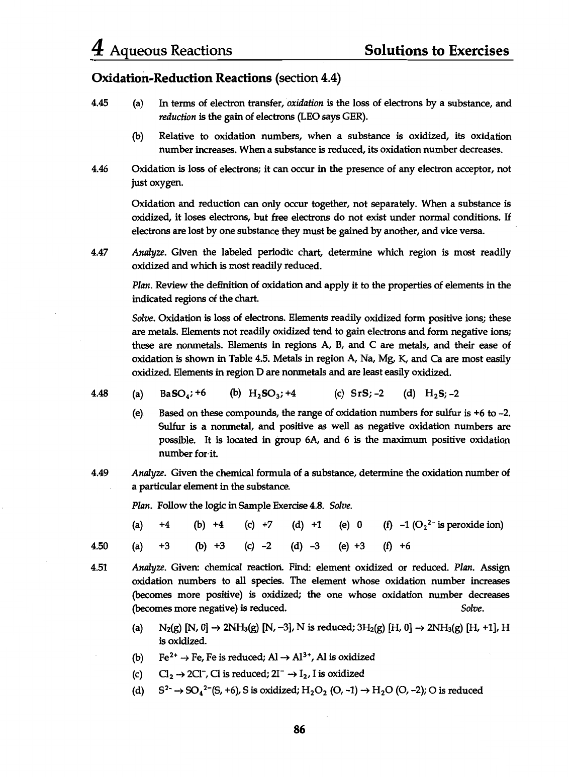4 Aqueous Reactions Solutions to Exercises Oxidation-Reduction Reactions (section 4.4) 4.45 (a) In terms of electron transfer, oxidation is the loss of electrons by a substance, and reduction is the gain of electrons (LEO says GER). (b) Relative to oxidation numbers, when a substance is oxidized, its oxidation number increases. When a substance is reduced, its oxidation number decreases. 4.46 Oxidation is loss of electrons; it can occur in the presence of any electron acceptor, not just oxygen. Oxidation and reduction can only occur together, not separately. When a substance is oxidized, it loses electrons, but free electrons do not exist under normal conditions. If electrons are lost by one substance they must be gained by another, and vice versa. 4.47 Analyze. Given the labeled periodic chart, determine which region is most readily oxidized and which is most readily reduced. Plan. Review the definition of oxidation and apply it to the properties of elements in the indicated regions of the chart. Solve. Oxidation is loss of electrons. Elements readily oxidized form positive ions; these are metals. Elements not readily oxidized tend to gain electrons and form negative ions; these are nonmetals. Elements in regions A, B, and C are metals, and their ease of oxidation is shown in Table 4.5. Metals in region A, Na, Mg, K, and Ca are most easily oxidized. Elements in region D are nonmetals and are least easily oxidized. 4.48 (a) BaSO₄; +6 (b) (c) SrS;-2 (d) (e) Based on these compounds, the range of oxidation numbers for sulfur is +6 to -2. Sulfur is a nonmetal, and positive as well as negative oxidation numbers are possible. It is located in group 6A, and 6 is the maximum positive oxidation number for it. 4.49 Analyze. Given the chemical formula of a substance, determine the oxidation number of a particular element in the substance. Plan. Follow the logic in Sample Exercise 4.8. Solve. (a) +4 (b) +4 (c) +7 (d) +1 (e) 0 (f) -1 is peroxide ion) 4.50 (a) +3 (b) +3 (c) -2 (d) -3 (e) +3 (f) +6 4.51 Analyze. Given: chemical reaction. Find: element oxidized or reduced. Plan. Assign oxidation numbers to all species. The element whose oxidation number increases (becomes more positive) is oxidized; the one whose oxidation number decreases (becomes more negative) is reduced. Solve. (a) N₂(g) [N, 0] 2NH₃(g) [N, -3], N is reduced; 3H₂(g) [H, 0] 2NH₃(g) [H, +1], H is oxidized. (b) Fe, Fe is reduced; Al Al is oxidized (c) Cl₂ Cl is reduced; 2I⁻ I₂, I is oxidized (d) (S, +6), S is oxidized; (O, -1) (O, -2); o is reduced 86
