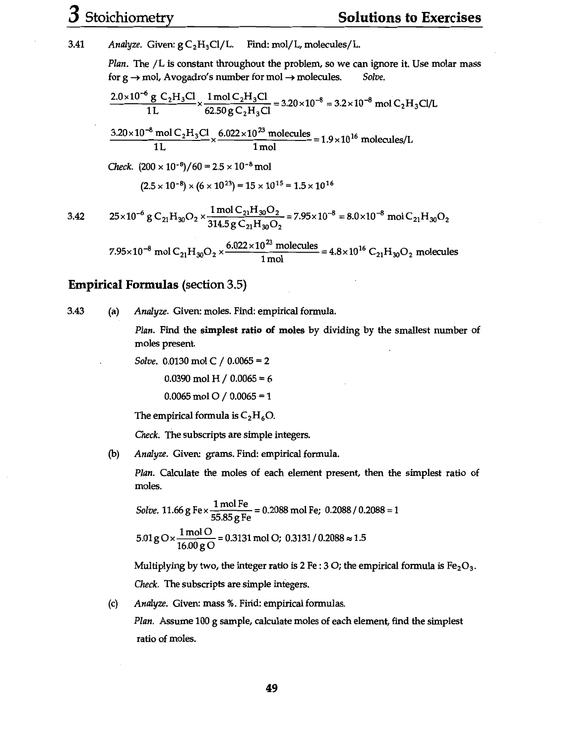 3 Stoichiometry Solutions to Exercises 3.41 Analyze. Given: g Find: mol/L, molecules/L. Plan. The /L is constant throughout the problem, so we can ignore it. Use molar mass for g mol, Avogadro's number for mol -> molecules. Solve. 2.0 10⁻⁶ 1L g C₂H₃Cl X 1 mol C₂H₃Cl = = X mol 3.20x10⁻⁸ mol molecules molecules/L 1L Check. (200 X = mol 3.42 7.95x10⁻⁸ mol molecules =4.8x10¹⁶ C₂₁H₃₀O₂ molecules 1 mol Empirical Formulas (section 3.5) 3.43 (a) Analyze. Given: moles. Find: empirical formula. Plan. Find the simplest ratio of moles by dividing by the smallest number of moles present. Solve. 0.0130 mol C / 0.0065 = 2 0.0390 mol H / 0.0065 = 6 0.0065 mol = 1 The empirical formula is C₂H₆O. Check. The subscripts are simple integers. (b) Analyze. Given: grams. Find: empirical formula. Plan. Calculate the moles of each element present, then the simplest ratio of moles. Solve. 11.66 g Fex 1 mol Fe = 0.2088 mol Fe; 0.2088 / 0.2088 = 1 5.01gOx 1molO = 0.3131 mol O; 0.3131 / 0.2088 ≈ 1.5 Multiplying by two, the integer ratio is 2 Fe : 3 O; the empirical formula is Fe₂O₃. Check. The subscripts are simple integers. (c) Analyze. Given: mass %. Find: empirical formulas. Plan. Assume 100 g sample, calculate moles of each element, find the simplest ratio of moles. 49