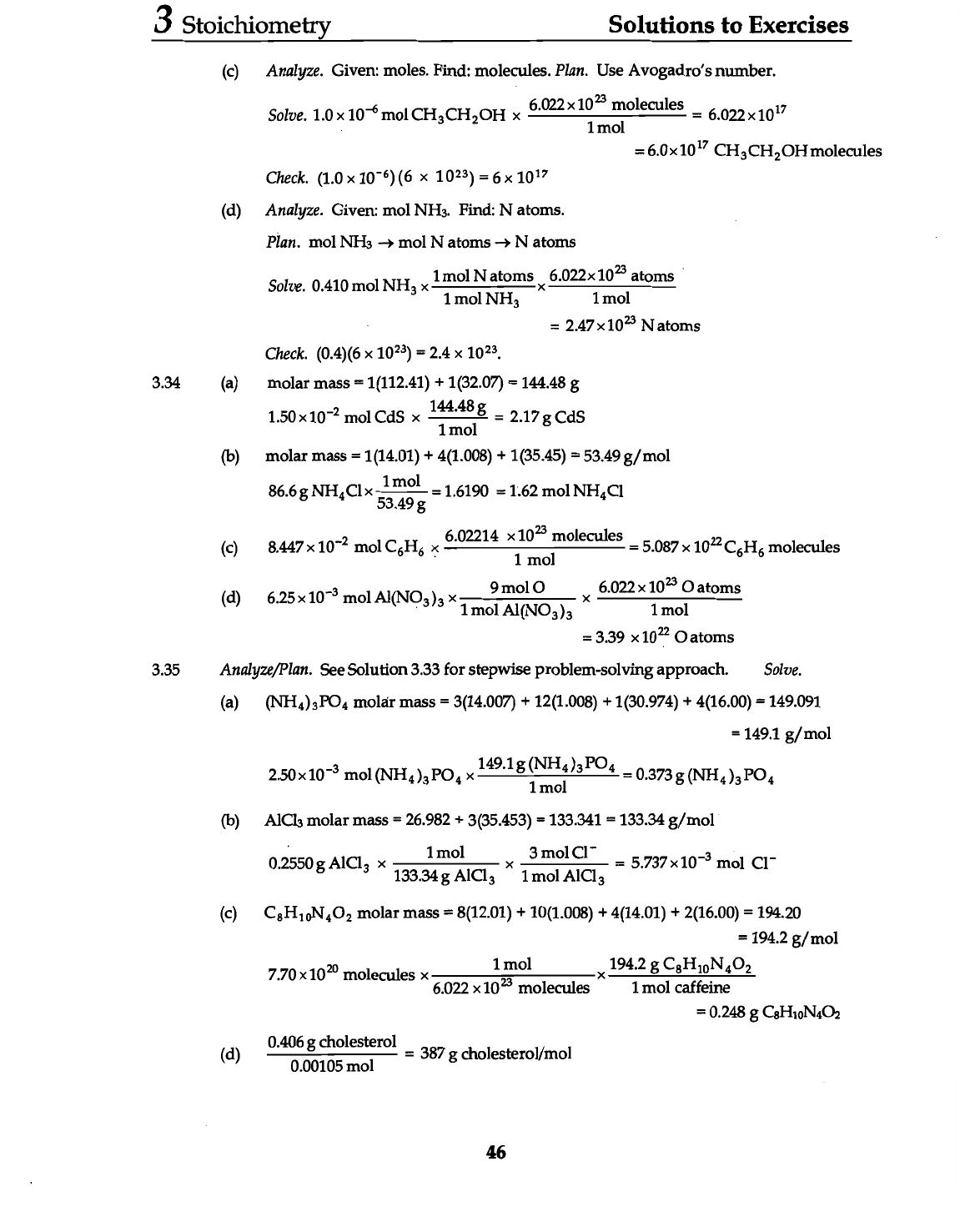 3 Stoichiometry Solutions to Exercises (c) Analyze. Given: moles. Find: molecules. Plan. Use Avogadro's number. Solve. 1.0x10⁻⁶ mol 6.022 X 10²³ molecules = 6.022x10¹⁷ 1 mol CH₃CH₂OH molecules Check. (6 X = 6 10¹⁷ (d) Analyze. Given: mol Find: N atoms. Plan. mol NH₃ mol N atoms N atoms Solve. 0.410 mol NH₃ X 1 mol N atoms 6.022x10²³ 1 mol atoms 1 mol NH₃ = N atoms Check. 3.34 (a) molar mass = 1(112.41) + 1(32.07) = 144.48 g 1.50x10⁻² mol CdS 144.48 mol = 2.17 CdS 1 (b) molar mass = 1(14.01) + 4(1.008) + 1(35.45) = 53.49 g/mol 86.6 g 53.49g = 1.6190 = 1.62 mol (c) 8.447 X 10⁻² mol C₆H₆ 6.02214 X 10²³ molecules = 5.087 C₆H₆ molecules 1 mol (d) 6.25x10⁻³ mol 1 mol 9molO X 6.022 10²³ 1 mol atoms = 3.39 10²² atoms 3.35 Analyze/Plan. See Solution 3.33 for stepwise problem-solving approach. Solve. (a) (NH₄)₃PO₄ molar mass = 3(14.007) + 12(1.008) + 1(30.974) + 4(16.00) = 149.091 = 149.1 g/mol 1 mol (b) molar mass = 26.982 + 3(35.453) = 133.341 = 133.34 X 133.34 X 1 3 mol mol Cl⁻ = 5.737 mol 1 mol (c) C₈H₁₀N₄O₂ molar mass = 8(12.01) + 10(1.008) + 4(14.01) + 2(16.00) = 194.20 = 1 mol 7.70 molecules molecules 1 mol caffeine 0.406 g cholesterol (d) = 387 g cholesterol/mol 0.00105 mol 46