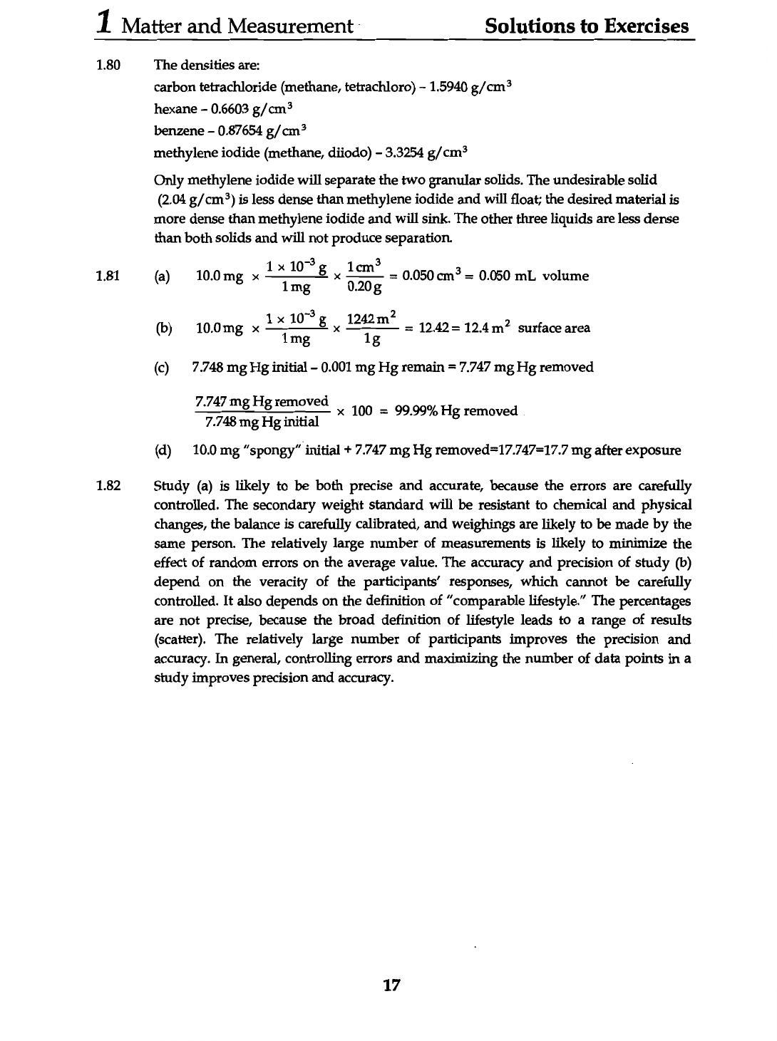 1 Matter and Measurement Solutions to Exercises 1.80 The densities are: carbon tetrachloride (methane, tetrachloro) - 1.5940 g/cm³ hexane - 0.6603 g/cm³ benzene - 0.87654 methylene iodide (methane, diiodo) - 3.3254 g/cm³ Only methylene iodide will separate the two granular solids. The undesirable solid (2.04 g/cm³) is less dense than methylene iodide and will float; the desired material is more dense than methylene iodide and will sink. The other three liquids are less dense than both solids and will not produce separation. 1.81 (a) 10.0 mg X 1 1 10⁻³ mg g X 0.20 = 0.050 3 = 0.050 mL volume (b) 10.0 mg X 1 1 10⁻³ mg g X 1242 = 12.42 = 12.4 2 surface area (c) 7.748 mg Hg initial - 0.001 mg Hg remain = 7.747 mg Hg removed 7.747 mg Hg removed X 100 = 99.99% Hg removed 7.748 mg Hg initial (d) 10.0 mg "spongy" initial + 7.747 mg Hg removed=17.747=17.7 mg after exposure 1.82 Study (a) is likely to be both precise and accurate, because the errors are carefully controlled. The secondary weight standard will be resistant to chemical and physical changes, the balance is carefully calibrated, and weighings are likely to be made by the same person. The relatively large number of measurements is likely to minimize the effect of random errors on the average value. The accuracy and precision of study (b) depend on the veracity of the participants' responses, which cannot be carefully controlled. It also depends on the definition of "comparable lifestyle." The percentages are not precise, because the broad definition of lifestyle leads to a range of results (scatter). The relatively large number of participants improves the precision and accuracy. In general, controlling errors and maximizing the number of data points in a study improves precision and accuracy. 17