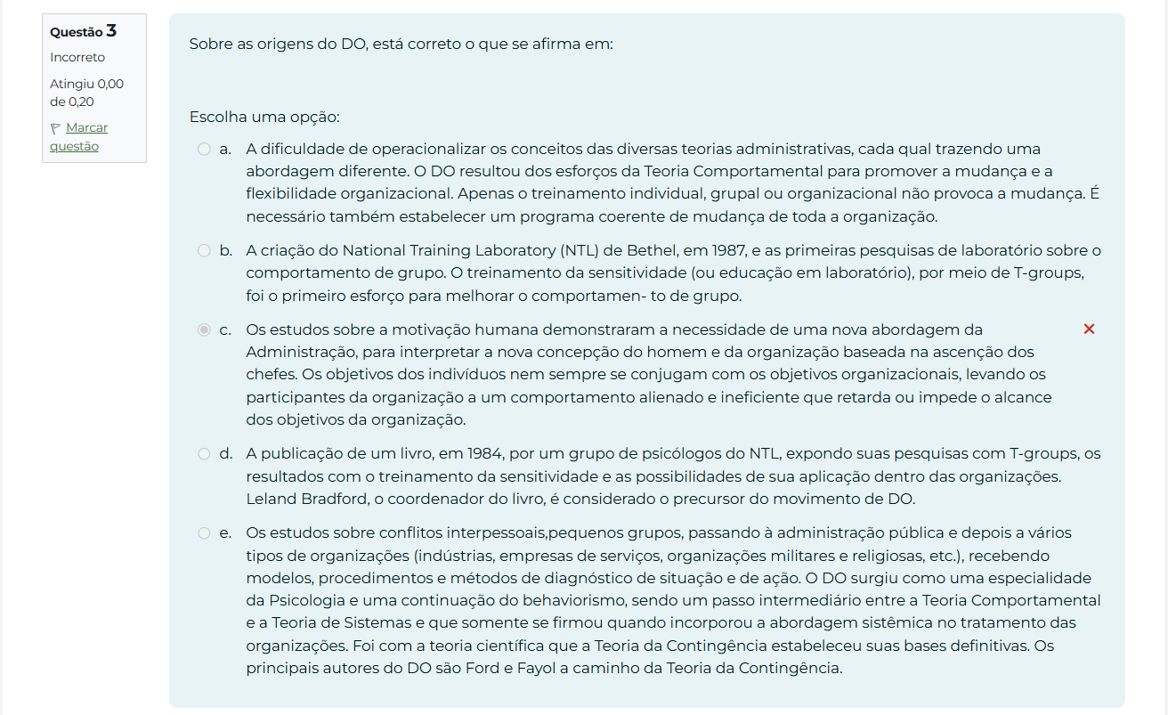Questão 3 Sobre as origens do DO, está correto O que se afirma em: Incorreto Atingiu 0,00 de 0,20 Escolha uma opção: Marcar a. A dificuldade de operacionalizar OS conceitos das diversas teorias administrativas, cada qual trazendo uma abordagem diferente. DO resultou dos esforços da Teoria Comportamental para promover a mudança e a flexibilidade organizacional. Apenas O treinamento individual, grupal ou organizacional não provoca a mudança. É necessário também estabelecer um programa coerente de mudança de toda a organização. b. A criação do National Training Laboratory (NTL) de Bethel, em 1987, e as primeiras pesquisas de laboratório sobre O comportamento de grupo. treinamento da sensitividade (ou educação em laboratório), por meio de T-groups, foi O primeiro esforço para melhorar comportamen- to de grupo. C. Os estudos sobre a motivação humana demonstraram a necessidade de uma nova abordagem da Administração, para interpretar a nova concepção do homem e da organização baseada na ascenção dos chefes. Os objetivos dos indivíduos nem sempre se conjugam com objetivos organizacionais, levando participantes da organização a um comportamento alienado e ineficiente que retarda ou impede O alcance dos objetivos da organização. d. A publicação de um livro, em 1984, por um grupo de psicólogos do NTL, expondo suas pesquisas com T-groups, resultados com O treinamento da sensitividade e as possibilidades de sua aplicação dentro das organizações. Leland Bradford, O coordenador do livro, é considerado O precursor do movimento de DO. e. Os estudos sobre conflitos interpessoais,pequenos grupos, passando à administração pública e depois a vários tipos de organizações (indústrias, empresas de serviços, organizações militares e religiosas, etc.), recebendo modelos, procedimentos e métodos de diagnóstico de situação e de ação. DO surgiu como uma especialidade da Psicologia e uma continuação do behaviorismo, sendo um passo intermediário entre a Teoria Comportamental e a Teoria de Sistemas e que somente se firmou quando incorporou a abordagem sistêmica no tratamento das organizações. Foi com a teoria científica que a Teoria da Contingência estabeleceu suas bases definitivas. Os principais autores do DO são Ford e Fayol a caminho da Teoria da Contingência.