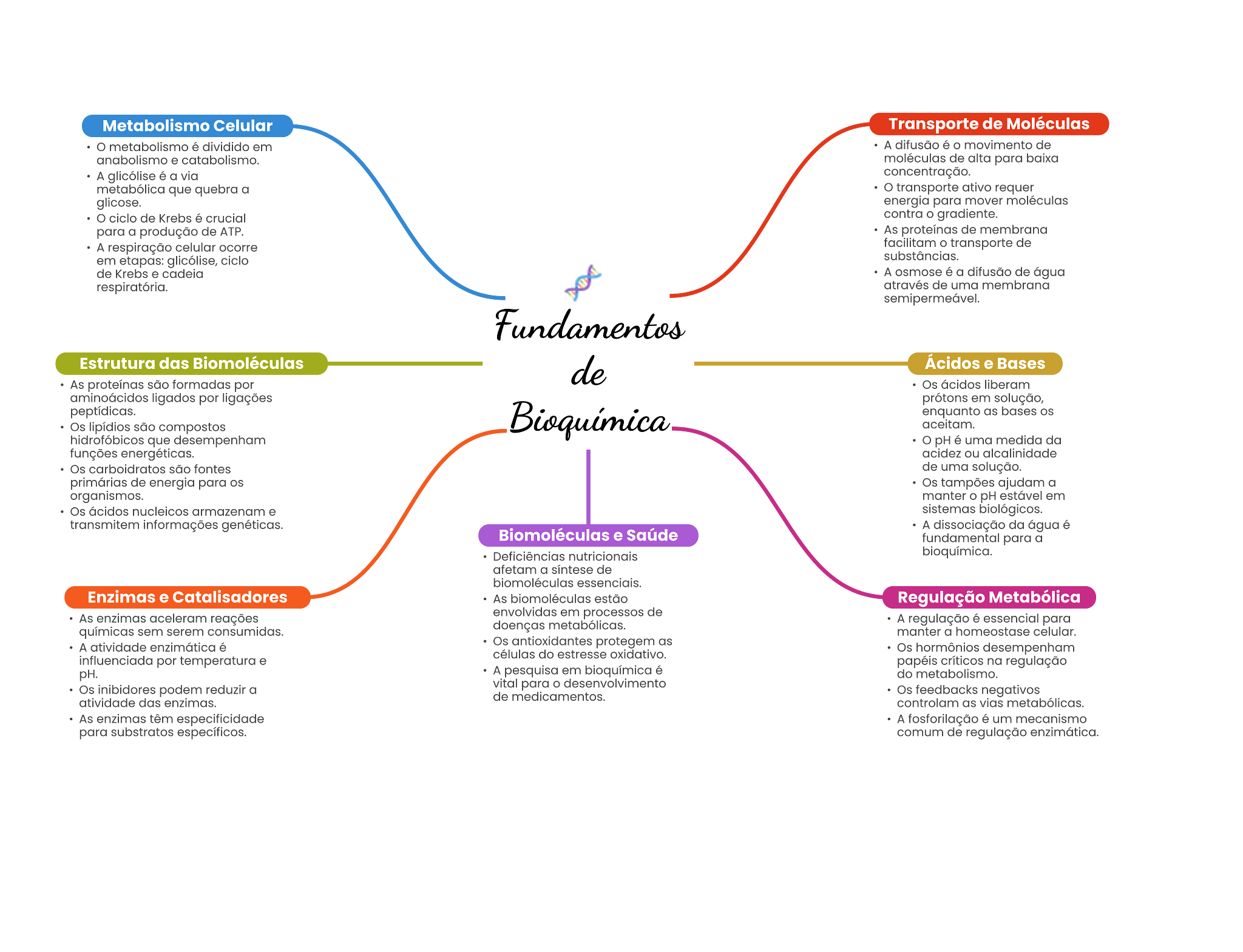 Metabolismo Celular Transporte de Moléculas dividido em A difusão o movimento de . catabolismo. de alta para A a via concentração. metabólica que quebra a transporte ativo requer glicose. para mover ciclo de é crucial contra para a produção de ATP. As proteinas de membrana A respiração celular ocorre facilitam o transporte de em ciolo substâncias. de Krebs . cadela A a difusão de água respiratória. de uma membrana Estrutura das Biomoléculas Ácidos e Bases As são formadas por ácidos liberam aminoácidos ligados por ligações em solução, enquanto as bases Os compostos aceitam. hidrofóbicos que desempenham pH uma medida da funções energéticas. acidez ou Os são fontes de uma solução. de energia para Os tampões ajudam a organismos. manter pH estável em Os ácidos e sistemas informações A dissociação da água é Biomoléculas e Saúde fundamental para a Deficiências afetam a sintese de essenciale. Enzimas e Catalisadores biomoléculas estão Regulação Metabólica enzimas reações envolvidas em processos de sem serem consumidas. doenças metabólicas. A regulação essencial para manter a homeostase celular. A atividade enzimática é Os protegem as influenciada por temperatura do estresse oxidativo. desempenham na regulação pH. A em do Os inibidores podem reduzir a vital para desenvolvimento de medicamentos. Os feedbacks negativos atividade das controlam as vias As têm especificidade A um para substratos específicos. comum de regulação enzimática.