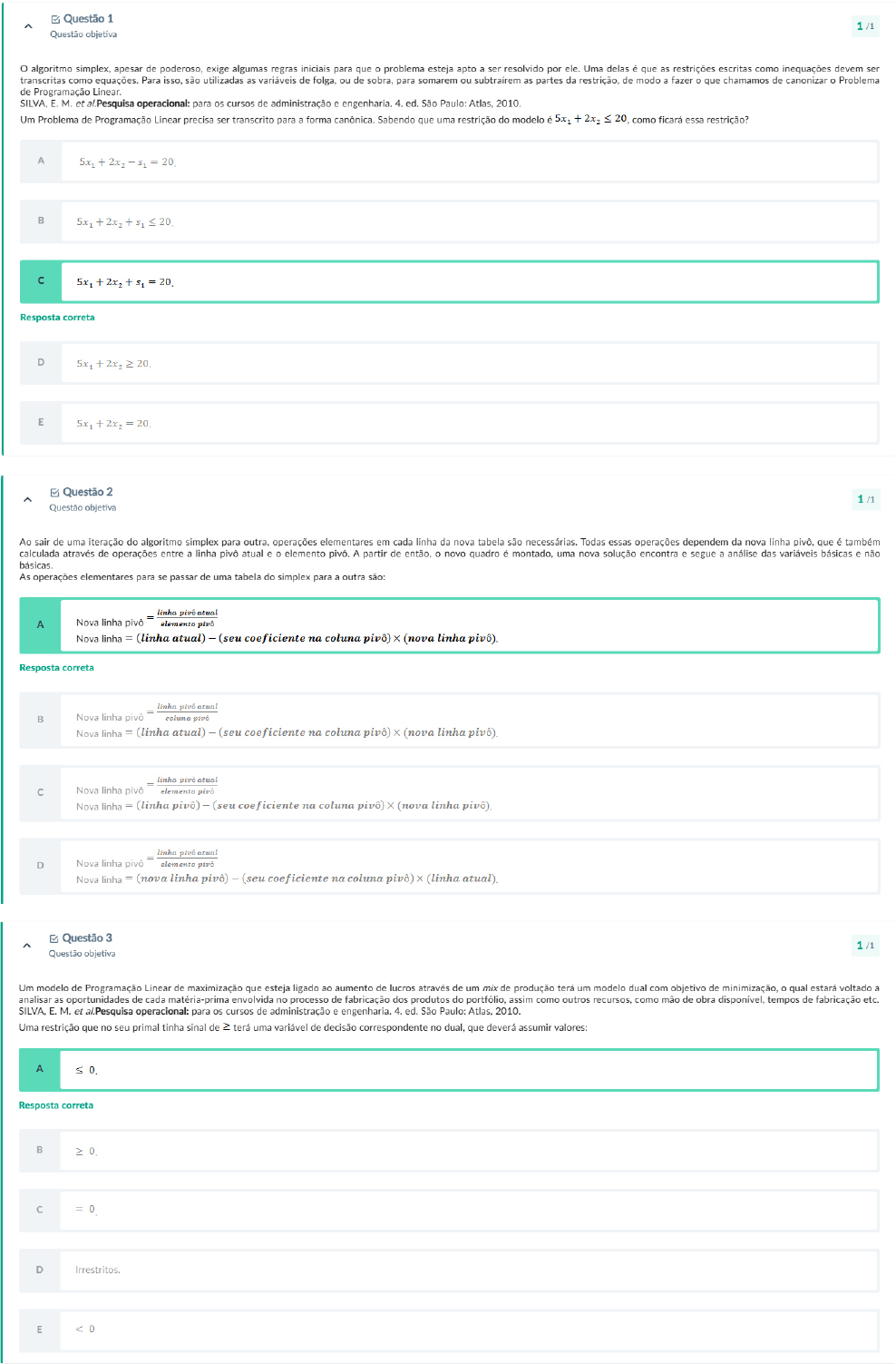 Questão 1 1 Questão objetiva o algoritmo simplex, apesar de poderoso, exige algumas regras iniciais para que problema esteja apto a ser resolvido por ele. Uma delas é que as restrições escritas como inequações devem ser transcritas como equações. Para isso, são utilizadas as variáveis de folga, ou de sobra, para somarem ou subtraírem as partes da restrição, de modo a fazer que chamamos de canonizar Problema de Programação Linear. SILVA, E.M. et operacional: para cursos de administração e engenharia. 4. ed. São Paulo: Atlas, 2010. Um Problema de Programação Linear precisa ser transcrito para a forma canônica. Sabendo que uma restrição do modelo é 5x1 + ≤ como ficará essa restrição? A 5x1 S1 20 c 5x1 + + = Resposta correta D 5x1 + ≥ E 5x1 20. Questão 2 1/1 Questão objetiva Ao sair de uma iteração do algoritmo simplex para outra, operações elementares em cada linha da nova tabela são necessárias. Todas essas operações dependem da nova linha que é também calculada através de operações entre a linha atual e elemento pivô. A partir de então, novo quadro é montado, uma nova solução encontra e segue a análise das variáveis básicas e não básicas. As operações elementares para se passar de uma tabela do simplex para a outra são: linha pivo atual A Nova linha elemento pivo Nova linha = (linha atual) (seu coeficiente na coluna pivô) (nova linha pivô). Resposta correta linha pivo atual Nova linha pivô coluna Nova linha = (linha atual) (seu coeficiente na coluna pivô) (nova linha linha pivo atual Nova linha elemento Nova linha = (linha pivô) (seu coeficiente na coluna pivô) (nova linha pivô). linha atual D Nova linha elemento Nova linha = (nova linha pivô) (seu coeficiente na coluna pivô) (linha Questão 3 1/1 Questão objetiva Um modelo de Programação Linear de maximização que esteja ligado ao aumento de lucros através de um mix de produção terá um modelo dual com objetivo de minimização, qual estará voltado a analisar as oportunidades de cada matéria-prima envolvida no processo de fabricação dos produtos do portfólio, assim como outros recursos, como mão de obra disponível, tempos de fabricação etc. SILVA, E.M. et operacional: para os cursos de administração e engenharia. 4. ed. São Paulo: Atlas, 2010. Uma restrição que no seu primal tinha sinal de terá uma variável de decisão correspondente no dual, que deverá assumir valores: A Resposta correta B ≥ 0 D Irrestritos. EQuestão 4 1/1 Questão objetiva Para a modelagem de um Problema de Programação Linear e sua solução, garantindo que mesmo representa sistema real, algumas regras devem ser respeitadas, que vão de acordo com premissas da álgebra básica, uma vez que problemas de Pesquisa Operacional lançam mão de técnicas da matemática aplicada e a PL está diretamente relacionada a modelos de álgebra linear. SILVA, E. M. et operacional: para os cursos de administração e engenharia. 4. ed. São Paulo: Atlas, 2010. Considerando (1) para Proporcionalidade, (2) para Aditividade e (3) para Certeza, enumere as propriedades a seguir e assinale a opção correta: ( ) Os coeficientes do problema devem ser constantes conhecidas. ( ) A contribuição de cada variável de decisão é proporcional à variável, tanto na função objetivo quanto nas restrições. ( ) As contribuições de cada variável na função objetivo são individuais. A Resposta correta D E Questão 5 1/1 Questão objetiva Para transportar algoritmo simplex de um quadro ao outro, ou seja, alterar a iteração, são necessárias operações fundamentais e essas operações dependem tanto de informações do quadro atual, quanto de questões que serão cruciais para quadro da iteração seguinte. A partir desse conjunto de informações, seguem as contas e a criação da tabela do algoritmo. É denominado (a) como encontro entre a linha que sai e a coluna da variável que entra na base. Por ele, dividimos todos os elementos da linha atual para compor a nova tabela simplex. Estamos falando... A Da tabela pivô. Do simplex pivô. Da linha D Da coluna pivô. E Do elemento Resposta corretaQuestão 6 1/1 Questão objetiva Um Problema de Programação Linear precisa ser bem estruturado, tanto em termo das variáveis de decisão, quanto das restrições. Esses pilares são fundamentais para estruturação do modelo, que deve representar exatamente a realidade. Qualquer limitação ou oportunidade possíveis que não sejam representadas matematicamente, comprometem significativamente na solução do PPL. SILVA, E. M. et operacional: para os cursos de administração e engenharia. 4. ed. São Paulo: Atlas, 2010. Qual motivo da necessidade de adoção das restrições de não-negatividade em modelos primal? A Para delimitar a área de soluções viáveis no primeiro quadrante, facilitando a resolução do modelo. Para delimitar a área de soluções viáveis no quarto quadrante, facilitando a resolução do modelo. É uma adaptação realizada para que modelo possa ser resolvido através do algoritmo simplex. D A tomada de decisão pode decidir entre não fabricar ou fabricar algo, porém não se pode fabricar negativamente. Resposta correta E Essa necessidade é opcional em modelos de mix de produção. Questão 7 1/1 Questão objetiva A canonização de um Problema de Programação Linear é necessária para remover as restrições escritas como inequações e passa-las para a forma de equações. Para isso, utilizamos que chamamos de variáveis de folga. Em alguns casos, são somadas ao lado esquerdo da restrição, em outros, são subtraídas, com intuito de transformar os sinais de maior que ou igual e menor que ou igual apenas em igualdades. SILVA, E. M. et operacional: para os cursos de administração e engenharia. 4. ed. São Paulo: Atlas, 2010. Um PPL precisa ser resolvido através do algoritmo simplex para isso, deve ser reescrito na forma canonizada. Se uma das restrições do mode