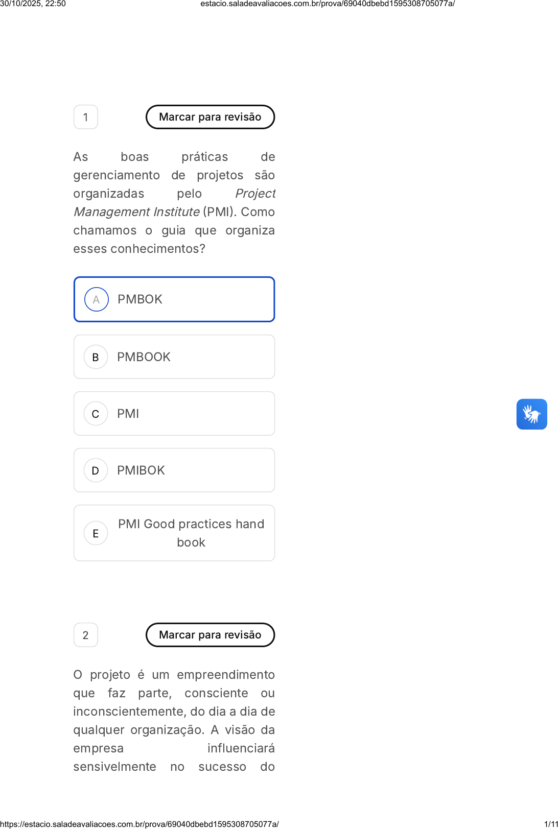 A B C D E 1 Marcar para revisão As boas práticas de gerenciamento de projetos são organizadas pelo Project Management Institute (PMI). Como chamamos o guia que organiza esses conhecimentos? PMBOK PMBOOK PMI PMIBOK PMI Good practices hand book 2 Marcar para revisão O projeto é um empreendimento que faz parte, consciente ou inconscientemente, do dia a dia de qualquer organização. A visão da empresa influenciará sensivelmente no sucesso do 30/10/2025, 22:50 estacio.saladeavaliacoes.com.br/prova/69040dbebd1595308705077a/ https://estacio.saladeavaliacoes.com.br/prova/69040dbebd1595308705077a/ 1/11 A B C projeto. Acerca desse tema, assinale a alternativa correta. É temporário, pois é dividido em começo, meio e fim, com datas que determinam sua duração. Poderá começar sem um objetivo específico e, ao longo de seu desenvolvimento, a equipe definirá o que se pretende com ele. Não poderá coexistir com nenhum outro projeto, pois perderá o foco nas execuções e consequentemente sua eficácia. 30/10/2025, 22:50 estacio.saladeavaliacoes.com.br/prova/69040dbebd1595308705077a/ https://estacio.saladeavaliacoes.com.br/prova/69040dbebd1595308705077a/ 2/11 D E A B C D E Uma característica interessante sobre projeto é que ele não possui restrição de recursos, o que aumenta a qualidade de sua execução. Para que haja a execução de um bom projeto, é necessário que ele nunca seja inédito, ou seja, quanto mais mudanças ocorrerem, mais desafiadora se tornará a gestão do projeto. 3 Marcar para revisão Qual item abaixo não é um valor do Extreme Programming? Metáforas Respeito Simplicidade Feedback Coragem 30/10/2025, 22:50 estacio.saladeavaliacoes.com.br/prova/69040dbebd1595308705077a/ https://estacio.saladeavaliacoes.com.br/prova/69040dbebd1595308705077a/ 3/11 A B C D E 4 Marcar para revisão Em relação ao “Triângulo de Talentos” delineado pelo Guia PMBOK, qual dos seguintes é um conjunto fundamental de habilidades? Conhecimento em automação e robótica Conhecimento, habilidades e comportamentos relativos a domínios específicos de Gerenciamento de Projetos, programas e portfólios Experiência em gestão financeira e orçamentária Capacidade de implementar processos de TI e segurança Habilidades avançadas em linguagens de programação 5 Marcar para revisão Na área da Qualidade, há conceitos importantes tais como 30/10/2025, 22:50 estacio.saladeavaliacoes.com.br/prova/69040dbebd1595308705077a/ https://estacio.saladeavaliacoes.com.br/prova/69040dbebd1595308705077a/ 4/11 A B C Não Conformidade, Ação Preventiva e Ação Corretiva. Nesse contexto, é CORRETO dizer que: as Não conformidades, em geral, são apontadas indevidamente com base em uma interpretação equivocada por parte do Cliente. a Não Conformidade é exatamente o não atendimento a um requisito estabelecido por especificação, norma, regulamento ou outro que regule a atividade. as ações preventivas tratam de problemas reais, que podem trazer prejuízo ao projeto, por isto é importante identificar as suas causas raízes. 00 hora : 15 min : 47 seg Ocultar Questão 9 de 10 Respondidas (10) Em branco (0) Finalizar prova 1 2 3 4 5 6 7 8 9 10 Prova AV Gestão e Viabilidade De Projetos… 30/10/2025, 22:50 estacio.saladeavaliacoes.com.br/prova/69040dbebd1595308705077a/ https://estacio.saladeavaliacoes.com.br/prova/69040dbebd1595308705077a/ 5/11 D E A B C uma Não Conformidade deve ser sempre tratada por meio de uma Ação Corretiva pois assim será eliminado o Risco de que venha a se materializar. Ações Corretivas e Preventivas só devem ser aplicadas caso haja a reprovação de um item pelo Cliente. Do contrário, não há necessidade, pois erros fazem parte da rotina de execução. 6 Marcar para revisão (FUNDATEC/2023 - Adaptada) O PMBOK é um guia de boas práticas, diretrizes e definições relacionadas à gestão de projetos. Segundo o Guia PMBOK 5ª Edição, são grupos de processos do gerenciamento de projetos, EXCETO: Iniciação. Planejamento. Execução. 30/10/2025, 22:50 estacio.saladeavaliacoes.com.br/prova/69040dbebd1595308705077a/ https://estacio.saladeavaliacoes.com.br/prova/69040dbebd1595308705077a/ 6/11 D E A B C D E Gestão. Encerramento. 7 Marcar para revisão Ao adicionarmos um membro em um time de desenvolvimento de 7 pessoas teremos quantos canais de comunicação? 28 56 16 15 30 8 Marcar para revisão O PMI desempenha um papel vital na promoção e desenvolvimento da profissão de gerenciamento de projetos em todo o mundo. Quais são os valores fundamentais definidos no Código 30/10/2025, 22:50 estacio.saladeavaliacoes.com.br/prova/69040dbebd1595308705077a/ https://estacio.saladeavaliacoes.com.br/prova/69040dbebd1595308705077a/ 7/11 A B C D E de Ética e Conduta Profissional do PMI? Respeito, justiça, eficiência e clareza Eficiência, honestidade, disciplina e respeito Honestidade, disciplina, eficiência e justiça Responsabilidade, respeito, justiça e honestidade Disciplina, eficiência, respeito e clareza 9 Marcar para revisão Na área da Qualidade, há diversas ferramentas e técnicas utilizadas para comparação, gerar sugestões, investigar causas de problemas e outras aplicações. Com base no que foi apresentado, é CORRETO dizer que: 30/10/2025, 22:50 estacio.saladeavaliacoes.com.br/prova/69040dbebd1595308705077a/ https://estacio.saladeavaliacoes.com.br/prova/69040dbebd1595308705077a/ 8/11 A B C A Folha de Verificação é utilizada para apoiar a verificação de modo estruturado, garantindo assim que nada foi esquecido. O Diagrama 5W1H que utiliza uma planilha onde devemos responder: O que? / Por que? / Quem / Onde / Quando e Como é utilizado para identificar as causas raízes dos problemas. Por meio do Diagrama de Pareto consigo identificar as causas raízes pois decomponho em causas primárias, secundárias e terciárias. 30/10/2025, 22:50 estacio.saladeavaliacoes.com.br/prova/69040dbebd1595308705077a/ https://estacio.saladeavaliacoes.com.br/prova/69