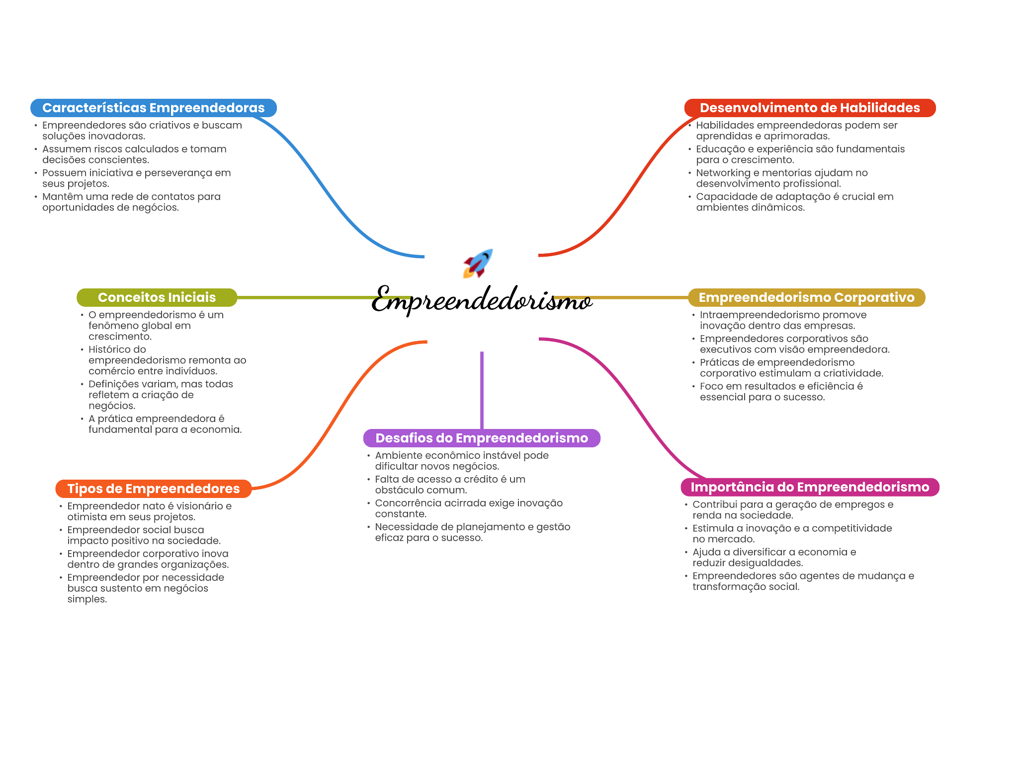 Características Empreendedoras Desenvolvimento de Habilidades Empreendedores criativos Habilidades empreendedoras podem ser soluções inovadoras. aprendidas aprimoradas. Assumem riscos calculados tomam Educação experiência são fundamentale decisões conscientes. para crescimento. Possuem perseverança em Networking mentorias ajudam no seus projetos. uma rede de contatos para Capacidade de adaptação crucial em oportunidades de ambientes Conceitos Iniciais Empreendedorismo Corporativo é um promove fenômeno global em inovação dentro das empresas. crescimento. Empreendedores corporativos do executivos com visão remonta Práticas de entre corporativo a Definições variam, mas todas Foco em resultados eficiência é refletern a criação de essencial para sucesso. A prática empreendedora é fundamental para a economia. Desafios do Empreendedorismo Ambiente sconômico pode novos Falta de acesso a crédito é um Tipos de Empreendedores comum. Importância do Empreendedorismo Empreendedor nato visionário Concorrência acimada exige Contribut para a de empregos otimista em seus projetos. constante. renda na sociedade. Empreendedor social busca Necessidade de e gestão a inovação . a positivo na sociedade. eficaz para sucesso. no meroado. carporativo Inova Ajuda a diversificar economia dentro de organizações. reduzir Empreendedor por Empreendedores são agentes de mudança busca sustento em transformação social. simples.