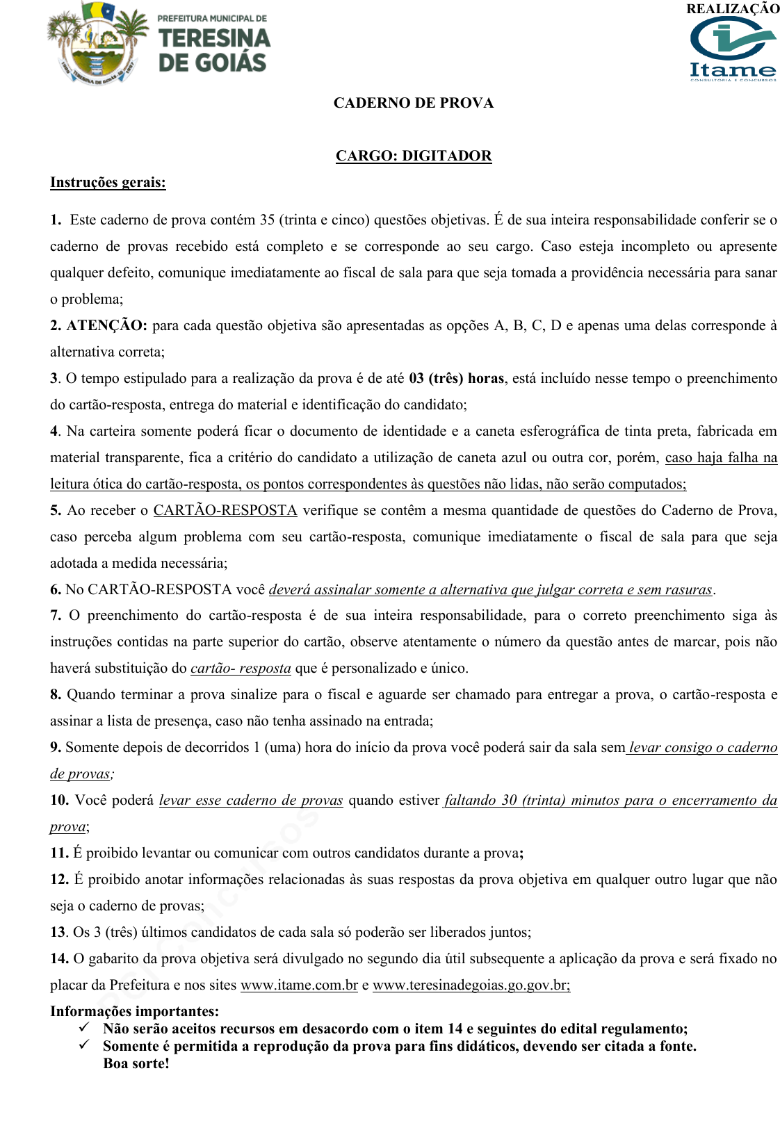 pcimarkpci MDAwMDowMDAwOjAwMDA6MDAwMDowMDAwOmZmZmY6YjNiZjpkN2E3:RnJpLCAzMSBPY3QgMjAyNSAwMDozMjo1NiAtMDMwMA== www.pciconcursos.com.br REALIZAÇÃO CADERNO DE PROVA CARGO: DIGITADOR Instruções gerais: 1. Este caderno de prova contém 35 (trinta e cinco) questões objetivas. É de sua inteira responsabilidade conferir se o caderno de provas recebido está completo e se corresponde ao seu cargo. Caso esteja incompleto ou apresente qualquer defeito, comunique imediatamente ao fiscal de sala para que seja tomada a providência necessária para sanar o problema; 2. ATENÇÃO: para cada questão objetiva são apresentadas as opções A, B, C, D e apenas uma delas corresponde à alternativa correta; 3. O tempo estipulado para a realização da prova é de até 03 (três) horas, está incluído nesse tempo o preenchimento do cartão-resposta, entrega do material e identificação do candidato; 4. Na carteira somente poderá ficar o documento de identidade e a caneta esferográfica de tinta preta, fabricada em material transparente, fica a critério do candidato a utilização de caneta azul ou outra cor, porém, caso haja falha na leitura ótica do cartão-resposta, os pontos correspondentes às questões não lidas, não serão computados; 5. Ao receber o CARTÃO-RESPOSTA verifique se contêm a mesma quantidade de questões do Caderno de Prova, caso perceba algum problema com seu cartão-resposta, comunique imediatamente o fiscal de sala para que seja adotada a medida necessária; 6. No CARTÃO-RESPOSTA você deverá assinalar somente a alternativa que julgar correta e sem rasuras. 7. O preenchimento do cartão-resposta é de sua inteira responsabilidade, para o correto preenchimento siga às instruções contidas na parte superior do cartão, observe atentamente o número da questão antes de marcar, pois não haverá substituição do cartão- resposta que é personalizado e único. 8. Quando terminar a prova sinalize para o fiscal e aguarde ser chamado para entregar a prova, o cartão-resposta e assinar a lista de presença, caso não tenha assinado na entrada; 9. Somente depois de decorridos 1 (uma) hora do início da prova você poderá sair da sala sem levar consigo o caderno de provas; 10. Você poderá levar esse caderno de provas quando estiver faltando 30 (trinta) minutos para o encerramento da prova; 11. É proibido levantar ou comunicar com outros candidatos durante a prova; 12. É proibido anotar informações relacionadas às suas respostas da prova objetiva em qualquer outro lugar que não seja o caderno de provas; 13. Os 3 (três) últimos candidatos de cada sala só poderão ser liberados juntos; 14. O gabarito da prova objetiva será divulgado no segundo dia útil subsequente a aplicação da prova e será fixado no placar da Prefeitura e nos sites www.itame.com.br e www.teresinadegoias.go.gov.br; Informações importantes: ✓ Não serão aceitos recursos em desacordo com o item 14 e seguintes do edital regulamento; ✓ Somente é permitida a reprodução da prova para fins didáticos, devendo ser citada a fonte. Boa sorte! pcimarkpci MDAwMDowMDAwOjAwMDA6MDAwMDowMDAwOmZmZmY6YjNiZjpkN2E3:RnJpLCAzMSBPY3QgMjAyNSAwMDozMjo1NiAtMDMwMA== www.pciconcursos.com.brTeresina de Goiás - GO / Digitador 1 Leia o texto a seguir e responda o que se pede: O Galo O Dr. Marcolino apeou-se, entrou na palhoça, examinou o enfermo, auscultou-o, martelou-lhe o corpo inteiro com o nó do dedo grande e explicou a moléstia com palavras difíceis que aquela pobre gente não entendeu. Depois, abriu o saco de viagem que levava à garupa do animal, tirou alguns vidros, de cujo conteúdo derramou algumas gotas num copo d'água, e disse doutoralmente: - Aqui fica esta poção para ser tomada de três em três horas. - Ah! seu doutor, nós aqui não podemos contar as horas, porque não temos relógio! - Regulem-se pelo sol. O sol é um excelente relógio quando não chove e o tempo está seguro. - Não sei disso, seu doutor, não entendo do relógio do sol... - Nesse caso não sei como... Ah!... Este ah!, com que o doutor interrompeu o que ia dizendo, foi produzido pela presença de um galo que passava no terreiro, majestosamente. - Ali está um relógio, continuou o doutor: aquele galo. Todas as vezes que ele cantar, dê-lhe uma colher do remédio. E adeus! Não será nada: Depois de amanhã voltarei para ver o doente. Foi-se o médico, e daí a dois dias voltou ao trote do seu jumento. Quem o recebeu foi o marido: - Que é isto?... já de pé... - Sim, senhor: estou completamente bom, não tenho mais nada. E não sei como agradecer... Mas a mulher interveio com ar magoado: - Sim, ele não tem mais nada, mas o pobre galo morreu. - Morreu? Por quê?. - Não sei, doutor... ele bebeu todo o remédio. - Quem?... o galo?... - Sim, senhor; todas as vezes que ele cantava, eu, segundo a recomendação do doutor, abria-lhe o bico, e derramava-lhe uma colher da droga pela goela abaixo! Que pena! Era um galo tão bonito! Texto adaptado da obra de: AZEVEDO, Artur. O Galo. Disponível em: Biblioteca Virtual de Literatura. Acesso em: 28 jun. 2024. 1. Na oração: A roceira agradeceu a Providência que enviava o doutor”, a palavra Providência é escrita com inicial maiúscula porque: (A) Trata-se de um substantivo próprio, que remete ao nome de um personagem da narrativa. (B) Trata-se de um substantivo abstrato que deve, segundo a regra gramatical, ser escrito com letra maiúscula. (C) Trata-se de uma referência a uma divindade, por isso o substantivo deve ser escrito com inicial maiúscula. (D) Trata-se de um substantivo próprio, que remete ao nome de um lugar na narrativa. 2. Pode-se dizer que a confusão da mulher quanto à maneira de dar o remédio ao marido surge a partir de um problema de coesão referencial: anáfora, produzido pela colocação incorreta de um pronome, cujo uso deixa a esposa confusa e ela não consegue saber que referente o pronome retoma. Esse uso inadequado do pronome pode ser encontrado n