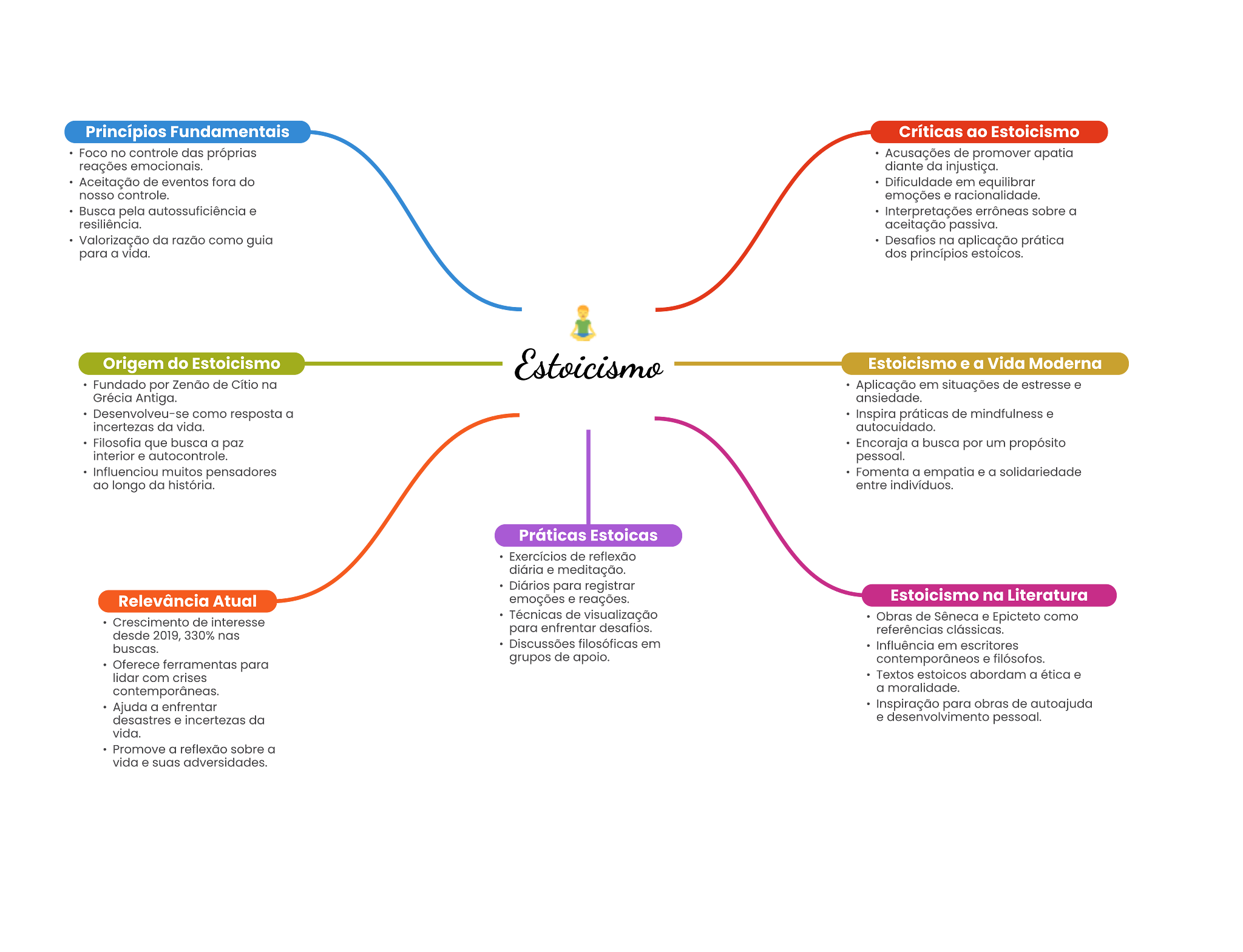 Princípios Fundamentais Críticas ao Estoicismo Foco no Acusações de promover apatia diante da Aceitação de eventos fora do em equilibrar nosso controle. emoções racionalidade. Busca pela Interpretações sobre a passiva. da razão como guia na aplicação para a vida. dos Origem do Estoicismo Estoicismo e a Vida Moderna Fundado por Zendo de na Aplicação em situações de estresse Grécia Antiga. Desenvolveu-se como a práticas de da vida. autocuídado. que busca a paz Encoraja a busca por um propósito interior autocontrole. a empatia . a ao longo da entre Práticas Estoicas Exercícios de reflexão diária meditação. Diários para Relevância Atual emoções Estoicismo na Literatura Crescimento de de Obras de Sêneca Epicteto como desde 2019, 330% para referências buscas. Discussões em escritores Oferece ferramentas para grupos de apolo. com Textos estolcos abordam a ética a moralidade. Ajuda a enfrentor Inspiração para obras de autoajuda . da . pessoal. vida. Promove a reflexão sobre a vida adversidades.
