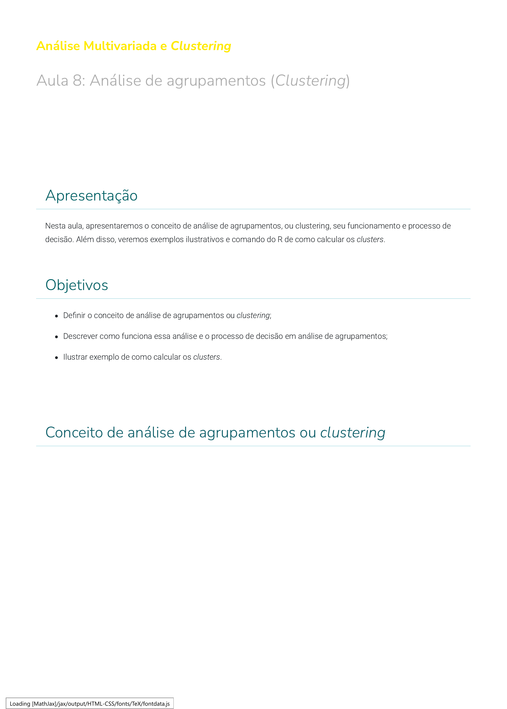 Nesta aula, apresentaremos o conceito de análise de agrupamentos, ou clustering, seu funcionamento e processo de