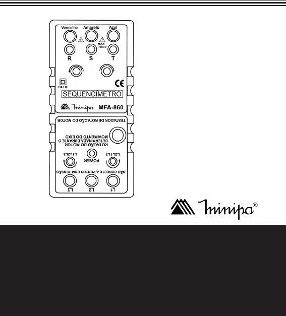 1 SEQUENCÍMETRO MANUAL DE INSTRUÇÕES Instructions Manual Manual de Instrucciones * Imagem meramente ilustrativa./Only illustrative image./ Imagen meramente ilustrativa. Sequence Meter Secuencímetro MFA-860 1 SUMÁRIO 1) INFORMAÇÕES DE SEGURANÇA 2 2) CARACTERÍSTICAS 4 3) ESPECIFICAÇÕES GERAIS 5 4) ACESSÓRIOS 5 5) DESCRIÇÃO DO PAINEL FRONTAL 6 A. Painel Frontal 6 6) OPERAÇÃO 7 A. Sequencímetro 7 B. Teste do Sentido de Rotação do Motor 8 7) MANUTENÇÃO 10 A. Troca de Bateria 10 B. Troca de Fusível 11 C. Limpeza e Armazenamento 11 8) GARANTIA 12 A. Cadastro do Certificado de Garantia 13 2 1) INFORMAÇÕES DE SEGURANÇA • Leia atentamente as informações deste Manual de Instruções antes de utilizar o instrumento. • Nunca efetue medidas com o instrumento nos seguintes casos: o sequencímetro ou as pontas de prova apresentarem defeitos; as pontas de prova ou suas mãos estiverem úmidas; após o armazenamento ou acondicionamento do instrumento em condições anormais; ou com o instrumento aberto. • Ao efetuar as medidas, mantenha suas mãos na parte isolada das pontas de prova e evite estar em contato com o potencial terra, ou seja, mantenha seu corpo isolado usando, por exemplo calçados com solados de borracha. • Nunca ultrapasse os limites de medidas do instrumento. • Nunca conecte os terminais de entrada do teste do sentido de rotação do motor a pontos energizados. • Siga as condições ambientais de operação: - Classe III de instalação, Norma de Poluição tipo 2. - Máxima altitude de medida é de 2000 metros. - Temperatura Ambiente de 0°C ~ 40°C, RHRecoloque o gabinete e parafuse-o novamente. Figura 3 11 B. Troca de Fusível Será necessário quando os indicadores R e T não detectarem a conexão, mesmo quando as conexões R-S-T forem alteradas. Retire o parafuso do gabinete inferior e remova o fusível. Troque o fusível somente por outro com as mesmas especifica- ções (200mA/250V). C. Limpeza e Armazenamento Para evitar choque elétrico ou danos ao instrumento, não jogue água dentro do instrumento. Periodicamente limpe o instrumento com um algodão e detergen- te. Não use nenhum tipo de solvente ou abrasivo. Quando for armazenar o instrumento por períodos maiores que 60 dias, retire a bateria. 12 8) GARANTIA O instrumento foi cuidadosamente ajustado e inspecionado. Se apresentar problemas durante o uso normal, será reparado de acordo com os termos da garantia. GARANTIA SÉRIE Nº MODELO MFA-860 1- Este certificado é válido por 12 (doze) meses a partir da data da aquisição. 2- Será reparado gratuitamente nos seguintes casos: A) Defeitos de fabricação ou danos que se verificar, por uso correto do aparelho no prazo acima estipulado. B) Os serviços de reparação serão efetuados somente no departamento de assistência técnica por nós autorizado. C) Aquisição for feita em um posto de venda credenciado da Minipa. 3- A garantia perde a validade nos seguintes casos: A) Mau uso, alterado, negligenciado ou danificado por aci- dente ou condições anormais de operação ou manuseio. B) O aparelho foi violado por técnico não autorizado. 4- Esta garantia não abrange fusíveis, pilhas, baterias e aces- sórios tais como pontas de prova, bolsa para transporte, termopar, etc. 5- Caso o instrumento contenha software, a Minipa garante que o software funcionará realmente de acordo com suas especificações funcionais por 90 dias. A Minipa não garante que o software não contenha algum erro, ou de que venha a funcionar sem interrupção. 6- A Minipa não assume despesas de frete e riscos de transporte. 7- A garantia só será válida mediante o cadastro deste certificado devidamente preenchido e sem rasuras. Nome: Endereço: Cidade: Estado: Fone: Nota Fiscal N°: Data: N° Série: Nome do Revendedor: 13 A. Cadastro do Certificado de Garantia O cadastro pode ser feito através de um dos meios a seguir: - Correio: Envie uma cópia do certificado de garantia devidamente preenchido pelo correio para o endereço. Minipa do Brasil Ltda. At: Serviço de Atendimento ao Cliente Av. Carlos Liviero, 59 - Vila Liviero CEP: 04186-100 - São Paulo - SP - Fax: Envie uma cópia do certificado de garantia devidamente preenchido através do fax 0xx11-5078-1885. - e-mail: Envie os dados de cadastro do certificado de garantia através do endereço sac@minipa.com.br. - Site: Cadastre o certificado de garantia através do endereço http://www.minipa.com.br/sac. IMPORTANTE Os termos da garantia só serão válidos para produtos cujos certificados forem devidamente cadastrados. Caso contrário será exigido uma cópia da nota fiscal de compra do produto. Manual sujeito a alterações sem aviso prévio. Revisão: 05 Data Emissão: 21/09/2011 14 MINIPA DO BRASIL LTDA. Av. Carlos Liviero, 59 - Vila Liviero 04186-100 - São Paulo - SP - Brasil MINIPA ELECTRONICS USA INC. 10899 - Kinghurst # 220 Houston - Texas - 77099 - USA 1) INFORMAÇÕES DE SEGURANÇA 2) CARACTERÍSTICAS 3) ESPECIFICAÇÕES GERAIS 4) ACESSÓRIOS 5) DESCRIÇÃO DO PAINEL FRONTAL A. Painel Frontal 6) OPERAÇÃO A. Sequencímetro B. Teste do Sentido de Rotação do Motor 7) MANUTENÇÃO A. Troca de Bateria B. Troca de Fusível C. Limpeza e Armazenamento 8) GARANTIA A. Cadastro do Certificado de Garantia