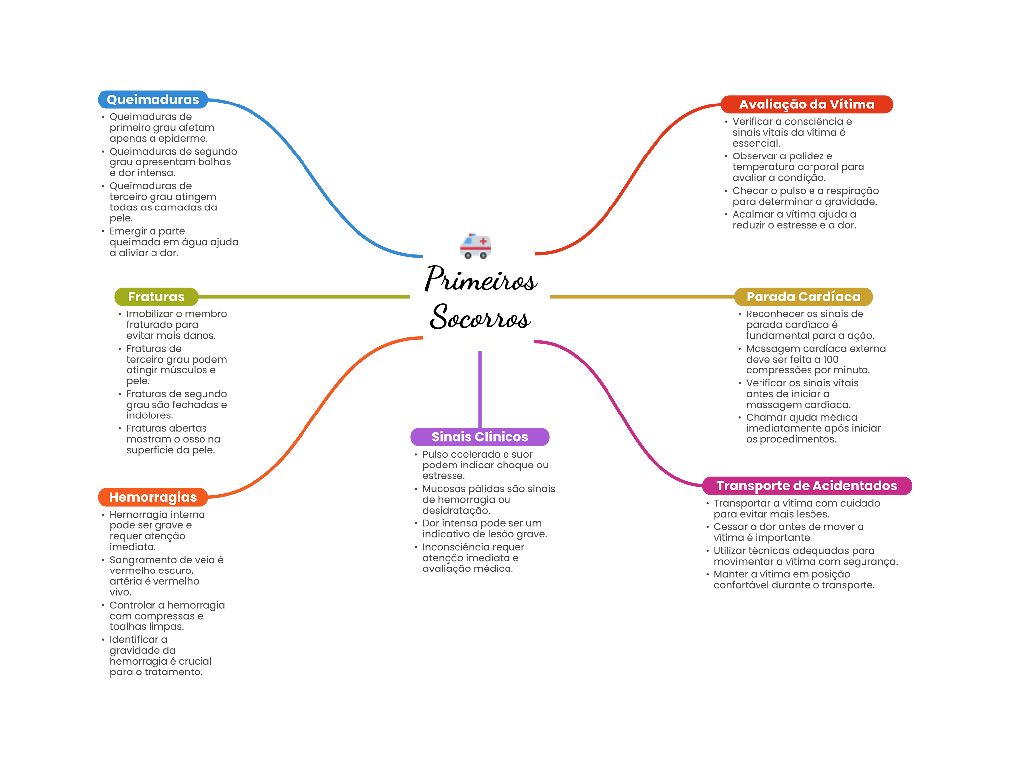 Queimaduras Avaliação da Vítima Quelmaduras de Verificar a consciência primeiro grau afetam vitale da vitima a essencial. Quelmaduras de segundo grau apresentam bolhas a . e der temperatura corporal para a condição. de terceiro grau Checar o pulso a respiração todas as camadas da para determinar a gravidade. a vitima ajuda a reduzir a dor. Emergir a parte quelmada em água ajuda a aliviar a dor. Fraturas Parada Cardíaca membro de fraturado para parada 6 fundamental para a ação. de Massagem cardíaca externa terceiro grou podem deve ser feita a 100 atingir músculos compressões por minuto. Verificar vitale Fraturas de segundo de a grau são fechadas massagem indolores. . Chamar ajuda médica Fraturas abertas imediatamente mostram o na Sinais Clínicos procedimentos. superficie da pele. Pulso acelerado suor podem Indicar choque ou Transporte de Acidentados Hemorragias de hemorragia ou Transportar a vitima com Hemorragia para pode grave Dor pode ser um a dor antes de mover a requer atenção indicativo de lesão grave. vitima importante. requer Utilizar técnicas adequadas para Sangramento de atenção . movimentor a vitima com vermelho escuro, médica. Manter a vitima em posição artéria é vermelho confortável durante transports. vivo. Controlar a hemorragia com compressas a gravidade da hemorragia é crucial para tratamento.