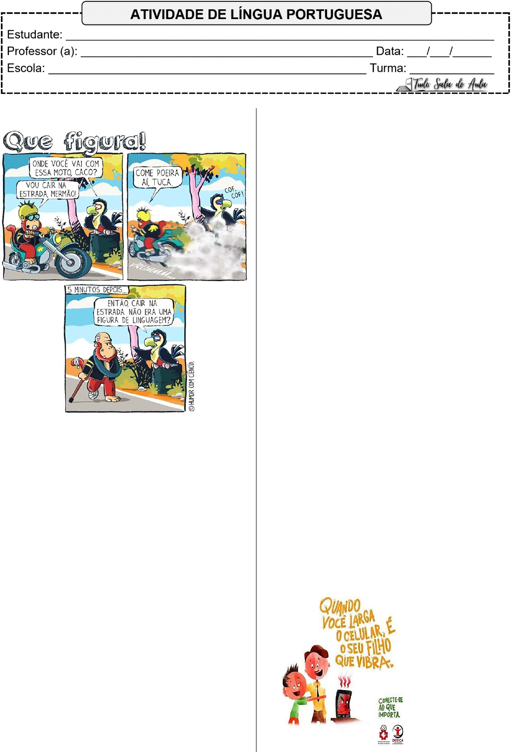 Leia e responda. Fonte: www.humorcomciencia.com/ 1. As f iguras de linguagem são recursos criativos que utilizamos para dar mais expressividade ao que falamos ou escrevemos. Assim sendo, de acordo com a tirinha acima, responda às perguntas a seguir. a) Qual fala na tirinha foi empregada na linguagem f igurada? ___________________________________________ ___________________________________________ b) O que essa fala signif ica no contexto da tirinha? ___________________________________________ ___________________________________________ ___________________________________________ c) O que levou a ave a questionar o motociclista se o que ele havia dito anteriormente não se tratava de uma f igura de linguagem? ___________________________________________ ___________________________________________ ___________________________________________ 2. As f iguras de palavras são empregadas para tornar os textos mais expressivos, explorando o uso das palavras e seus signif icados. Desse modo, leia as f rases a seguir e indique qual f igura de palavra foi empregada predominantemente: metáfora, metonímia, comparação, catacrese ou sinestesia. a) A vida é uma nuvem que voa. (Machado de Assis) __________________________________________ b) Meu amor é como uma f lor que desabrocha na primavera. (Vinícius de Moraes) __________________________________________ c) O doce som da f lauta encantava a todos. (Cecília Meireles) __________________________________________ d) Os olhos são o espelho da alma. (William Shakespeare) __________________________________________ e) Ele devorou dois pratos. __________________________________________ f ) O céu da boca está sensível. __________________________________________ g) Minha alma é como um pássaro escapando da prisão. (Fernando Pessoa) __________________________________________ h) O silêncio branco da manhã cobriu a cidade. (Guimarães Rosa) __________________________________________ i) Ler Machado de Assis é viajar pelo Brasil do século XIX. __________________________________________ 3. Identif ique a alternativa onde a f igura de linguagem, indicada entre parênteses, foi corretamente identif icada. a) Ela é tão brilhante quanto uma estrela. (Sinestesia) b) A sala estava em um silêncio absoluto. (Personif icação) c) O vento cantava suavemente entre as árvores. (Metáfora) d) Ele é um verdadeiro leão no trabalho. (Catacrese) 4. Leia e responda. Qual f igura de linguagem foi utilizada no texto visando a expressividade da propaganda? Justifique sua resposta. _________________ _________________ _________________ _________________ _________________ _________________ _________________ _________________ https://www.tudosaladeaula.com/ 5. Leia a propaganda e responda. A f igura de linguagem utilizada no texto por meio da repetição alternada das palavras é denominada: a) metáfora. b) ironia. c) hipérbole. d) antítese. 6. As f iguras de pensamento são utilizadas para aprimorar a expressividade e a estética dos textos, através da utilização de ideias e pensamentos. Desse modo, leia as f rases a seguir e classif ique-as de acordo com a f igura de linguagem utilizada: hipérbole, eufemismo, ironia, personif icação, antítese ou gradação. a) Começou serena, depois tornou-se inquieta, e chegou ao auge do desespero. ___________________________________________ b) Que ótimo, mais um dia chuvoso para arruinar nossos planos! ___________________________________________ c) Era o melhor dos tempos, era o pior dos tempos. (Charles Dickens) ___________________________________________ d) O sol sorriu para nós durante todo o dia. ___________________________________________ e) As árvores dançavam ao vento durante a tempestade. ___________________________________________ f ) Ele começou tímido, tornou-se conf iante e, por f im, se apresentou como um verdadeiro líder. ___________________________________________ g) Eu já te disse um milhão de vezes para não deixar a luz acesa! ___________________________________________ h) Ele está descansando no sono eterno. ___________________________________________ 7. Leia e responda. Na tirinha, a expressão "cabeças de gado" é utilizada para representar o todo (boi). Essa troca de signif icados, onde uma parte é usada para representar o todo, é conhecida como: a) metonímia. b) metáfora. c) comparação. d) catacrese. 8. Associe as colunas conforme o tipo de f igura de linguagem empregado na construção do signif icado das f rases a seguir. (1) Eufemismo (2) Hipérbole (3) Comparação (4) Ironia (5) Personif icação (6) Gradação (7) Apóstrofe (8) Pleonasmo (9) Antítese a. ( ) As estrelas sorriam no céu. b. ( ) Fomos do básico ao avançado em um ano. c. ( ) Que bela bagunça você fez! d. ( ) Ó mar, por que levaste meu amor? e. ( ) Vi com meus próprios olhos o que aconteceu. f . ( ) Era tudo tão claro e escuro ao mesmo tempo. g. ( ) Ela partiu para um mundo melhor. h. ( ) Preciso sair, pois estou morrendo de fome. i. ( ) Ele é forte como um touro. j. ( ) É tão inteligente que não acerta nada. k. ( ) Quase morri de estudar. l. ( ) Saia logo pra fora desse quarto! m.( ) O jardim olhava as crianças sem dizer nada. 9. As f iguras de sintaxe são empregadas para tornar os textos mais bonitos ou expressivos através da construção gramatical das f rases e orações. Assim sendo, observe as f rases a seguir e identif ique se elas contêm polissíndeto, zeugma, hipérbato, pleonasmo ou silepse. a) Vivemos na bonita e agitada São Paulo. ___________________________________________ b) Dos seus olhos brotaram lágrimas de tristeza. ___________________________________________ c) Fiz a introdução, ela a conclusão. ___________________________________________ d) E ria, e cantava, e dançava, e pulava de alegria. ___________________________________________ e) Eu vi com meus próprios olhos o acidente. ___________________________________________ 10. Leia a tirinha e circule as onomatopeias exis