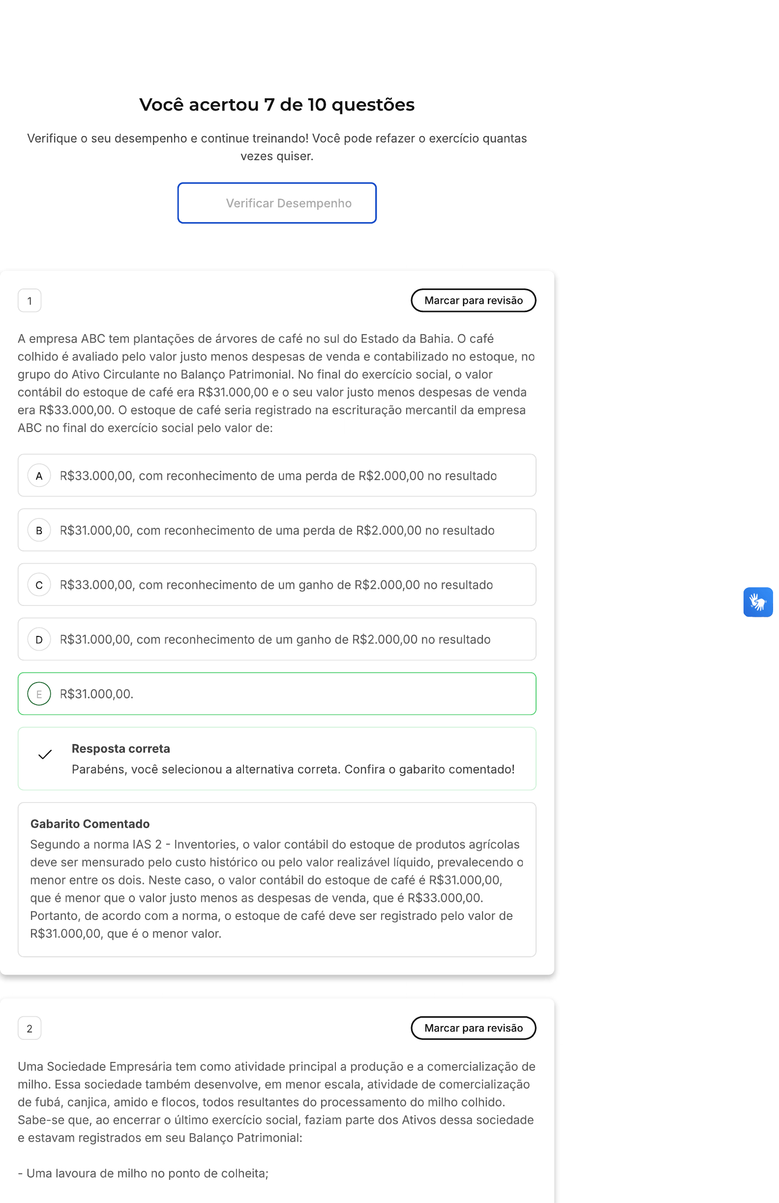 Você acertou 7 de 10 questões Verifique o seu desempenho e continue treinando! Você pode refazer o exercício quantas vezes quiser. Verificar Desempenho 1 Marcar para revisão A empresa ABC tem plantações de árvores de café no sul do Estado da Bahia. O café colhido é avaliado pelo valor justo menos despesas de venda e contabilizado no estoque, no grupo do Ativo Circulante no Balanço Patrimonial. No final do exercício social, o valor contábil do estoque de café era R$31.000,00 e o seu valor justo menos despesas de venda era R$33.000,00. estoque de café seria registrado na escrituração mercantil da empresa ABC no final do exercício social pelo valor de: A R$33.000,00, com reconhecimento de uma perda de R$2.000,00 no resultado R$31.000,00, com reconhecimento de uma perda de R$2.000,00 no resultado c R$33.000,00, com reconhecimento de um ganho de R$2.000,00 no resultado D R$31.000,00, com reconhecimento de um ganho de R$2.000,00 no resultado E R$31.000,00. Resposta correta Parabéns, você selecionou a alternativa correta. Confira gabarito comentado! Gabarito Comentado Segundo a norma IAS 2 Inventories, o valor contábil do estoque de produtos agrícolas deve ser mensurado pelo custo histórico ou pelo valor realizável líquido, prevalecendo o menor entre os dois. Neste caso, o valor contábil do estoque de café é R$31.000,00, que é menor que o valor justo menos as despesas de venda, que é R$33.000,00. Portanto, de acordo com a norma, o estoque de café deve ser registrado pelo valor de R$31.000,00, que é o menor valor. 2 Marcar para revisão Uma Sociedade Empresária tem como atividade principal a produção e a comercialização de milho. Essa sociedade também desenvolve, em menor escala, atividade de comercialização de fubá, canjica, amido e flocos, todos resultantes do processamento do milho colhido. Sabe-se que, ao encerrar o último exercício social, faziam parte dos Ativos dessa sociedade e estavam registrados em seu Balanço Patrimonial: Uma lavoura de milho no ponto de colheita;120 toneladas de milho (em grãos) colhidas na última safra e armazenadas em silos da Sociedade Empresária; Produtos, resultantes do processamento do milho colhido, armazenados no galpão da Sociedade Empresária. Considerando-se apenas as informações apresentadas e a NBC TG 29 (R2) Ativo biológico e produto agrícola, assinale a alternativa correta sobre esses Ativos da Sociedade Empresária A A lavoura de milho é uma Planta Portadora. A lavoura de milho é um Imobilizado em Andamento Os produtos resultantes do processamento do milho colhido são classificados como Estoques D milho em grãos é classificado como Ativo Biológico Os produtos resultantes do processamento do milho colhido são classificados E como Ativos Biológicos Resposta correta Parabéns, você selecionou a alternativa correta. Confira o gabarito comentado! Gabarito Comentado Conforme a norma NBC TG 29 (R2) Ativo biológico e produto agrícola, os produtos que são resultantes do processamento do milho colhido, como fubá, canjica, amido e flocos, são classificados como Estoques. Isso ocorre porque, após a colheita, o produto agrícola deixa de ser considerado um ativo biológico e passa a ser reconhecido como estoque, conforme a norma IAS 2 Inventories. Portanto, a alternativa correta é a "Os produtos resultantes do processamento do milho colhido são classificados como Estoques". 3 Marcar para revisão Sobre o que pode ser incluso nos custos de empréstimos, de acordo com a IAS 23 Borrowing Costs, analise as afirmativas abaixo e atribua valores de Verdadeiro (V) e Falso (F). () Juros de empréstimos obtidos de curto e longo prazos e de saldo bancário negativo. Amortização de descontos ou prêmios relacionados com empréstimos obtidos. () Juros extras por atraso em pagamento de parcela de empréstimos obtidos. A F,V,F F,F,V c V,V,F D V,V,V E F,F,FX Resposta incorreta Opa! A alternativa correta é a letra Confira o gabarito comentado! Gabarito Comentado Os custos de empréstimos incluem juros e outros custos que a entidade incorre em conexão com o empréstimo de recursos. Assim, juros extras por atraso em pagamento de parcela de empréstimos obtidos integram o custo do ativo qualificável. 4 Marcar para revisão Para realizar o teste de recuperabilidade de um ativo, deve-se estimar o seu valor em uso. No cálculo do valor em uso do ativo, deve-se considerar, entre outros elementos, a estimativa dos fluxos de caixa futuros que a entidade espera obter com esse ativo. Em relação aos fatores que devem ser incluídos nas estimativas de fluxos de caixa futuros, analise as afirmativas a seguir. I. Projeções de entradas de caixa advindas do uso contínuo do ativo. II. Saídas de caixa que se referem a obrigações que já foram reconhecidas contabilmente. III. Entradas de caixa advindas de ativos que geram outras entradas de caixa que são, em grande parte, independentes das entradas de caixa do ativo sob revisão. IV. Projeções de saídas de caixa que são necessariamente incorridas para gerar as entradas de caixa advindas do uso contínuo do ativo e que podem ser diretamente atribuídas ou alocadas, em base consistente e razoável, ao ativo. As estimativas de fluxos de caixa futuros devem incluir o que se afirma em: A le B le III le IV D e III E III e IV Resposta correta Parabéns, você selecionou a alternativa correta. Confira o gabarito comentado! Gabarito Comentado Para estimar corretamente os fluxos de caixa futuros de um ativo, é necessário considerar tanto as projeções de entradas de caixa advindas do uso contínuo do ativo (afirmação I) quanto as projeções de saídas de caixa que são necessariamente incorridas para gerar essas entradas e que podem ser diretamente atribuídas ao ativo (afirmação IV). Esses dois fatores são essenciais para uma avaliação precisa do valor em uso do ativo. Portanto, a alternativa correta é a C, que inclui as afirmações e IV. 5 Marcar para revisã