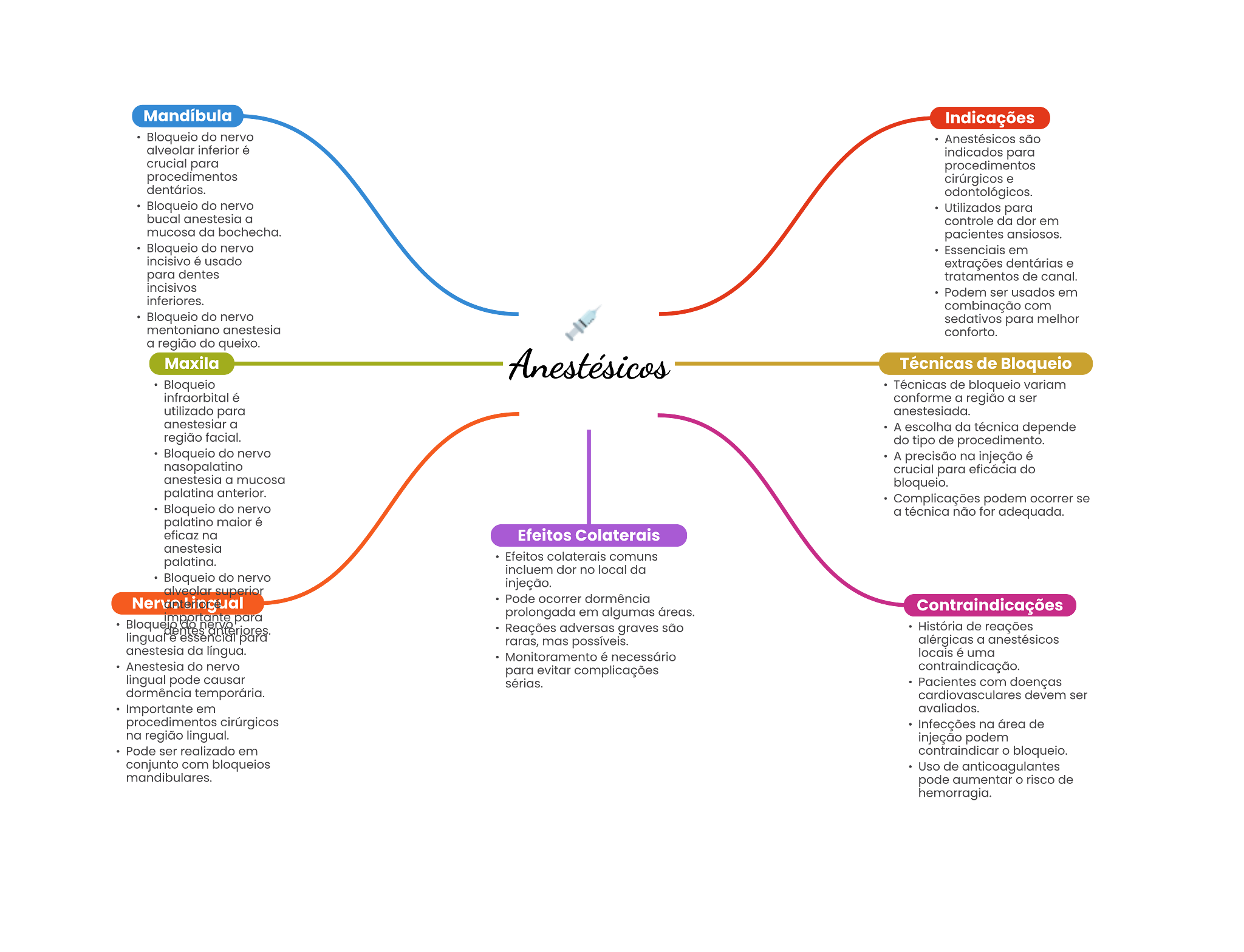 Mandíbula Indicações do nervo Inferior indicados para crucial para procedimentos procedimentos cirúrgicos . odontológicos. do nervo Utilizados para bucal a controle da dor em mucosa da bochecha. do nervo Essenciale em usado extrações dentárias e para tratamentos de Podem ser usados em inferiores. combinação com do narvo sedativos para melhor mentoniano conforto. a região do Maxila Técnicas de Bloqueio Técnicas de variam é a a ser utilizado para a A escolha da depende facial. do tipo de procedimento. do nervo A precisão na é crucial para do a mucosa palatina anterior. Complicações podem ocorrer se do nervo a técnica não for adequada. palatino malor na Efeitos Colaterais palatina. Efeitos comune dor no local da do nervo Pode ocorrer dormência prolongada em algumas Contraindicações adverage graves História de mas a da Monitoramento necessário locals é uma do nervo para complicações lingual pode causar Pacientes com dormência em procedimentos cirúrgicos Infecções na área de na região lingual. podem Pode ser em contraindicar conjunto com Uso de pode risco de hemorragia.