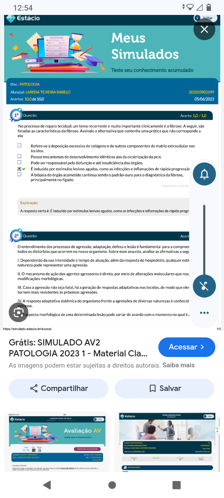 12:54 Estácio Voltar X Meus Simulados Teste seu conhecimento acumulado Disc.: PATOLOGIA Aluno(a): LARISSA TEIXEIRA RABELO 202203902199 Acertos: 10,0 de 10.0 05/06/2023 Questão Acerto: 1,0 / 1,0 No processo de reparo tecidual, um tema recorrente e muito importante clinicamente é a fibrose. A seguir, são listadas as características da fibrose. Assinale a alternativa que contenha uma prática que não corresponde a ela: Refere-se à deposição excessiva de e de outros componentes da matriz extracelular nos tecidos. Possui mecanismos de desenvolvimento idênticos aos da cicatrização da pele. Pode ser responsável pela disfunção e insuficiencia dos É induzida por estímulos lesivos agudos, como as infecções e inflamações de rápida progressão A do órgão acometido continua sendo padrão-ouro para diagnóstico da fibrose, principalmente no figado. Respondido em 05/06/ Explicação: A resposta certa induzida por lesivos agudos, como as infecções e inflamações de rápida progr Questão Acert O entendimento dos processos de agressão, adaptação, defesa e lesão é fundamental para a compreer todos os distúrbios que ocorrem no nosso organismo. Sobre esse assunto, analise as afirmativas a segu I. Dependendo da sua intensidade e tempo de atuação, da resposta do hospedeiro, qualquer natureza pode representar uma agressão. II. O mecanismo de ação dos agentes agressores é direto, por meio de alterações moleculares que resu modificações morfológicas. III. Caso a agressão não seja fatal, há a geração de respostas adaptativas nos tecidos, de modo que eles tornem mais resistentes às agressões. IV. A resposta adaptativa sistêmica do organismo frente a agressões de diversas naturezas é conhecid estresse. aspecto morfológico de uma determinada lesão pode variar de acordo com momento no qual é https://simulado.estacio.br/alunos/ 1/5 SIMULADO AV2 Acessar > PATOLOGIA 2023 1 - Material Cla... As imagens podem estar sujeitas a direitos autorais. Saiba mais Compartilhar Salvar Estácio Estácio Avaliação AV