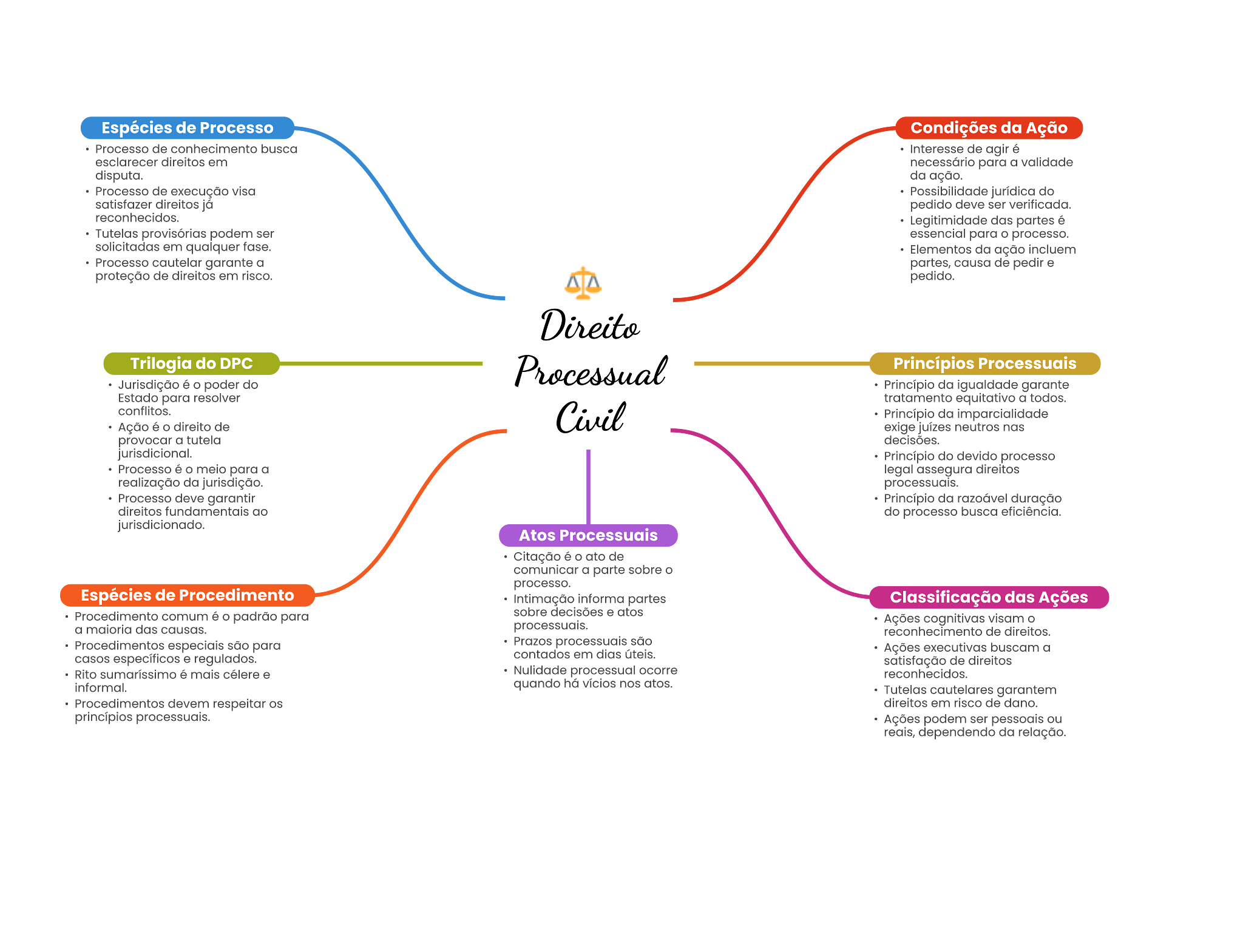 Espécies de Processo Condições da Ação Processo de conhecimento busca de agir em para a validade da ação. Processo de execução visa Possibilidade jurídica do direitos deve ser verificada. reconhecidos. Legitimidade das partes Tutelas provisórias podem ser para o processo. solicitadas em qualquer Elementos da ação Processo cautelar garante a causa de . proteção de direitos em risoo. pedido. Trilogia do DPC Princípios Processuais Jurisdição é o poder do da garante Estado para resolver tratamento equitativo a todos. da Ação é o direito de exige neutros nas provocar a tutela decisões. jurisdicional. do devido processo Processo para a legal assegura direitos realização da Processo deve garantir da duração direitos do processo busca eficiência. jurisdicionado. Atos Processuais Citação é ato de comunicar a parte sobre processo. Espécies de Procedimento partes Classificação das Ações Procedimento comum é padrão para sobre atos a maloria causas. processuals. visam reconhecimento de direitos. Procedimentos são para processuals contados em Ações buscam a regulados. de direitos Rito é male célere processual ocorre reconhecidos. quando há nos atos. Tutelas garantem Procedimentos respeitar direitos em risco de dano. processuals. Ações podem ser ou dependendo da relação.