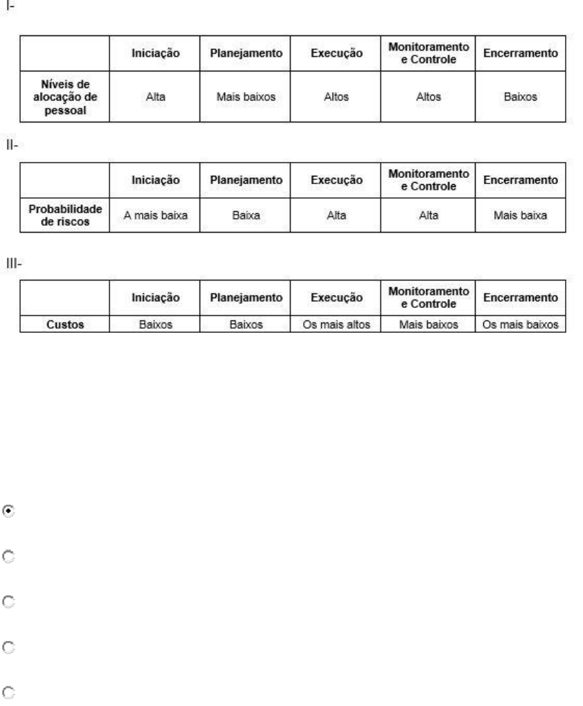 Gestão de Projetos U1S1 - Atividade Diagnóstica No que diz respeito aos grupos de processo podemos caracterizar: Estão CORRETAS somente as afirmações: Escolha uma: a. II e III. b. Somente a III. c. I, II e III. d. Somente a II. e. I e III. Questão 2 Correto Marcar questão Texto da questão Projetos e atividades rotineiras não podem ser confundidos, pois possuem características diferentes. Qual das alternativas a seguir pode ser vista como uma atividade rotineira? Escolha uma: a. Manter o funcionamento de uma máquina. b. O desenvolvimento de um novo produto. c. O desenvolvimento de um novo sistema de controle de qualidade. d. A construção de um website. e. A construção de uma casa. Questão 3 Correto Marcar questão Texto da questão Um projeto possui características e objetivos determinados. Qual das características a seguir está relacionada com um projeto? Escolha uma: a. A data inicial de um projeto é flexível. b. Ao definir um projeto deve-se estabelecer um objetivo principal, relacionado à consecução de determinadas metas e cuja execução pode ser indefinida no tempo. c. Um projeto deve criar produto, serviço ou até mesmo um resultado único. d. As atividades rotineiras de um trabalho podem ser projetos. e. Em um projeto, os objetivos não precisam estar claramente definidos. U1S1 - Atividade de Aprendizagem Na gestão de projetos, existem 5 grupos de processos que devem ser cumpridos. Quais são esses processos? Escolha uma: a. Iniciação, planejamento, execução, controle e encerramento. b. Escopo; RH; comunicação; riscos e aquisições. c. Problema; objetivo; execução; riscos e encerramento. d. Qualidade; tempo; risco; aquisições e volume de vendas. e. Marketing; finanças; comunicação; logística e produção. Questão 2 Correto Marcar questão Texto da questão De acordo com as características de um projeto, analise os itens a seguir: I. São empreendimentos independentes. II. Possuem propósito e objetivos específicos. III. Têm duração limitada, com início e fim bem definidos. IV. Entregam um resultado semelhante a um produto ou serviço disponível no mercado. V. Possuem recursos destinados ao projeto, incluindo pessoas e financeiros. Estão corretos, os itens: Escolha uma: a. I, II, III e V. b. I, II, III, IV e V. c. II, III e V. d. III, IV e V. e. II, III, IV e V. Questão 3 Correto Marcar questão Texto da questão A gestão de projetos é a utilização de “uma boa base para definir e planejar todo o trabalho a ser realizado, conduzir a execução das atividades (colocando o plano em prática), verificar e controlar o desempenho da execução e garantir que as características especificadas e contratadas sejam entregues” (KEELING, 2012, p. 5). Quais áreas de conhecimento devem ser geridas em um projeto? Escolha uma: a. Risco, custo, marketing e comunicação. b. Volume de vendas, marketing, tempo e integração. c. Aquisições, comunicação, marketing e RH. d. Qualidade, tempo, risco e aquisições. e. Escopo, volume de vendas, RH e aquisições. U1S2 - Atividade Diagnóstica Quando dizemos que um projeto obteve sucesso na dimensão “impacto no cliente”, o que isso significa? Escolha uma: a. Isso significa que o projeto trouxe um aumento do lucro para a empresa. b. Isso significa que projeto foi finalizado dentro do orçamento previsto. c. Isso significa que o cliente recebeu o produto do projeto antes do combinado. d. Isso significa que o projeto cumpriu as metas estipuladas. e. Isso significa que o produto do projeto satisfez a necessidade do cliente Questão 2 Correto Marcar questão Texto da questão A tripla restrição analisa quais fatores para avaliar se um processo foi bem-sucedido? Escolha uma: a. Tempo, custo e integração. b. Escopo, tempo e comunicação c. Escopo, tempo e custo. d. Finanças, marketing e RH. e. Escopo, integração e custo. Questão 3 Correto Marcar questão Texto da questão Quando dizemos que um projeto obteve sucesso na dimensão “preparação para o futuro”, o que isso significa? Escolha uma: a. Isso significa que o projeto foi concluído dentro do prazo estipulado, não precisando ser estendido para o futuro b. Isso significa que o projeto trouxe aumento de vendas para a empresa. c. Isso significa que o projeto atual desenvolveu uma técnica, infraestrutura ou tecnologia que auxiliará em projetos futuros da empresa. d. Isso significa que, ao final do projeto, todos os colaboradores que participaram dele permaneceram na empresa, deixando-a pronta para projetos futuros. e. Isso significa que a empresa consegue fazer mais de um projeto ao mesmo tempo. U1S2 - Atividade de Aprendizagem Com relação ao alcance do sucesso em um projeto, podemos dizer que: Escolha uma: a. A eficiência do projeto e a preparação que o projeto trouxe para o futuro só conseguem ser medidos em longo prazo. b. O sucesso comercial de um projeto consegue ser medido antes da preparação para o futuro que o projeto trouxe. c. No curto prazo, é possível medir o sucesso do projeto tanto em termos da sua eficiência, como em termos de preparação para o futuro. d. O sucesso comercial de um projeto consegue ser medido antes da eficiência do projeto. e. O sucesso sobre os impactos no cliente e na equipe de um projeto é percebido depois do resultado de um projeto sobre a preparação para o futuro trazida por ele. Questão 2 Correto Marcar questão Texto da questão Um projeto de sucesso, provavelmente, conta com grandes acertos nas partes críticas de todas as fases do ciclo de sua vida. Em projetos, quando as chances de se obter sucesso aumentam? Escolha uma: a. Quando o gerente de projeto trabalha em diversos departamentos, ao mesmo tempo. b. Quando o planejamento do projeto não sofre nenhuma alteração. c. Quando é feita uma pesquisa de riscos sem profundidade. d. Quando o projeto sofre interferências constantes de diversas pessoas da empresa que julgam ter poder para tal. e. Quando a equipe do projeto