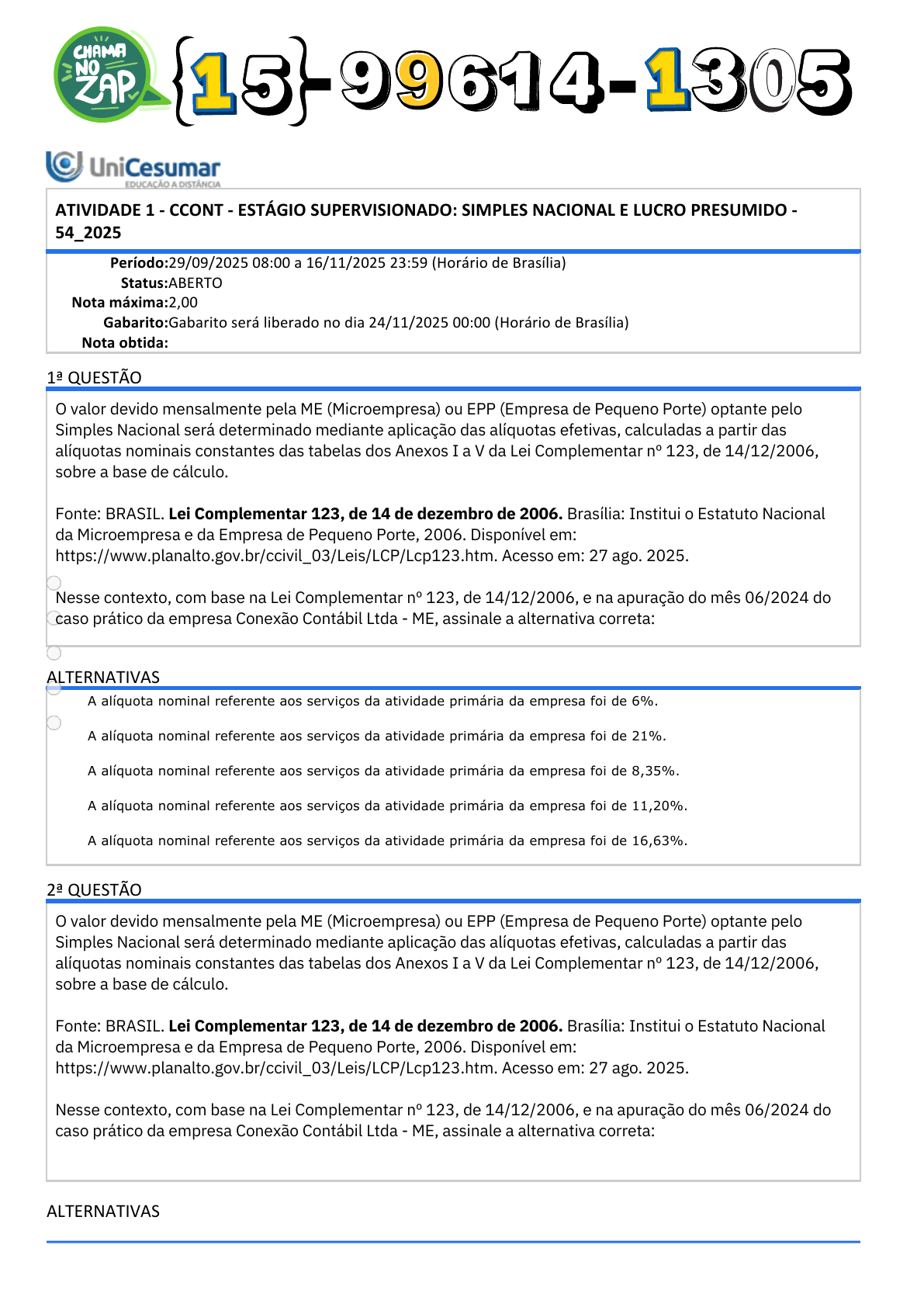 1ª QUESTÃO 2ª QUESTÃO ALTERNATIVAS ALTERNATIVAS ATIVIDADE 1 - CCONT - ESTÁGIO SUPERVISIONADO: SIMPLES NACIONAL E LUCRO PRESUMIDO - 54_2025 Período:29/09/2025 08:00 a 16/11/2025 23:59 (Horário de Brasília) Status:ABERTO Nota máxima:2,00 Gabarito:Gabarito será liberado no dia 24/11/2025 00:00 (Horário de Brasília) Nota obtida: O valor devido mensalmente pela ME (Microempresa) ou EPP (Empresa de Pequeno Porte) optante pelo Simples Nacional será determinado mediante aplicação das alíquotas efetivas, calculadas a partir das alíquotas nominais constantes das tabelas dos Anexos I a V da Lei Complementar nº 123, de 14/12/2006, sobre a base de cálculo. Fonte: BRASIL. Lei Complementar 123, de 14 de dezembro de 2006. Brasília: Institui o Estatuto Nacional da Microempresa e da Empresa de Pequeno Porte, 2006. Disponível em: https://www.planalto.gov.br/ccivil_03/Leis/LCP/Lcp123.htm. Acesso em: 27 ago. 2025. Nesse contexto, com base na Lei Complementar nº 123, de 14/12/2006, e na apuração do mês 06/2024 do caso prático da empresa Conexão Contábil Ltda - ME, assinale a alternativa correta: O valor devido mensalmente pela ME (Microempresa) ou EPP (Empresa de Pequeno Porte) optante pelo Simples Nacional será determinado mediante aplicação das alíquotas efetivas, calculadas a partir das alíquotas nominais constantes das tabelas dos Anexos I a V da Lei Complementar nº 123, de 14/12/2006, sobre a base de cálculo. Fonte: BRASIL. Lei Complementar 123, de 14 de dezembro de 2006. Brasília: Institui o Estatuto Nacional da Microempresa e da Empresa de Pequeno Porte, 2006. Disponível em: https://www.planalto.gov.br/ccivil_03/Leis/LCP/Lcp123.htm. Acesso em: 27 ago. 2025. Nesse contexto, com base na Lei Complementar nº 123, de 14/12/2006, e na apuração do mês 06/2024 do caso prático da empresa Conexão Contábil Ltda - ME, assinale a alternativa correta: A alíquota nominal referente aos serviços da atividade primária da empresa foi de 6%. A alíquota nominal referente aos serviços da atividade primária da empresa foi de 21%. A alíquota nominal referente aos serviços da atividade primária da empresa foi de 8,35%. A alíquota nominal referente aos serviços da atividade primária da empresa foi de 11,20%. A alíquota nominal referente aos serviços da atividade primária da empresa foi de 16,63%. - - I, apenas. II, apenas. III, apenas. IV, apenas. I e III, apenas. A alíquota nominal referente aos serviços da atividade secundária da empresa foi de 11,20%. A alíquota nominal referente aos serviços da atividade secundária da empresa foi de 13,50%. A alíquota nominal referente aos serviços da atividade secundária da empresa foi de 15,50%. A alíquota nominal referente aos serviços da atividade secundária da empresa foi de 16,63%. A alíquota nominal referente aos serviços da atividade secundária da empresa foi de 18,00%. 3ª QUESTÃO 4ª QUESTÃO ALTERNATIVAS O valor devido mensalmente pela ME (Microempresa) ou EPP (Empresa de Pequeno Porte) optante pelo Simples Nacional será determinado mediante aplicação das alíquotas efetivas, calculadas a partir das alíquotas nominais constantes das tabelas dos Anexos I a V da Lei Complementar nº 123, de 14/12/2006, sobre a base de cálculo. Fonte: BRASIL, Lei Complementar 123, de 14 de dezembro de 2006. Brasília: Institui o Estatuto Nacional da Microempresa e da Empresa de Pequeno Porte, 2006. Disponível em: https://www.planalto.gov.br/ccivil_03/Leis/LCP/Lcp123.htm. Acesso em: 27 ago. 2025. Com base na Lei Complementar nº 123, de 14/12/2006, e na apuração do mês 06/2024 do caso prático da empresa Conexão Contábil Ltda - ME, analise as afirmativas a seguir: I. A alíquota efetiva a ser aplicada sobre a base de cálculo dos serviços da atividade primária foi de aproximadamente 16,63%. II. A alíquota efetiva a ser aplicada sobre a base de cálculo dos serviços da atividade primária e secundária foi de aproximadamente 8,35%. III. A alíquota efetiva a ser aplicada sobre a base de cálculo dos serviços da atividade secundária foi de aproximadamente 16,63%. IV. A alíquota efetiva a ser aplicada sobre a base de cálculo dos serviços da atividade primária e secundária foi de aproximadamente 11,20%. É correto o que se afirma em: O fator “r” é a razão entre a folha de salários e a receita bruta da pessoa jurídica enquadrada no regime de tributação do Simples Nacional, cujas atividades estejam listadas entre as sujeitas ao cálculo do fator “r” para identificação do anexo a ser utilizado para cálculo do tributo devido. Fonte: BRASIL. Lei Complementar 123, de 14 de dezembro de 2006. Brasília: Institui o Estatuto Nacional da Microempresa e da Empresa de Pequeno Porte, 2006. Disponível em: https://www.planalto.gov.br/ccivil_03/Leis/LCP/Lcp123.htm. Acesso em: 27 ago. 2025. Nesse contexto, considerando as particularidades sobre o fator “r”, dispostas na Lei Complementar nº 123, de 14/12/2006 e o caso prático da empresa Conexão Contábil Ltda - ME, avalie as asserções a seguir e a relação proposta entre elas. I. O fator “r” da empresa Conexão Contábil Ltda – ME no mês 06/2024 foi de aproximadamente 45%. PORQUE II. O fator “r” para empresas com início de atividade no mês de apuração é calculado pelo valor da folha de salário do período de apuração dividido pelo valor da receita do período de apuração. A respeito dessas asserções, assinale a alternativa correta: Para cálculo do valor devido pela empresa a título de Simples Nacional, é preciso segregar as receitas, pois dependendo do tipo de serviço prestado, por exemplo, haverá uma tabela a ser aplicada. A segregação das receitas e o consequente enquadramento em cada tabela é fundamental para que se chegue no valor correto do tributo a pagar. Fonte: BRASIL. Lei Complementar 123, de 14 de dezembro de 2006. Brasília: Institui o Estatuto Nacional da Microempresa e da Empresa de Pequeno Porte, 2006. Dis