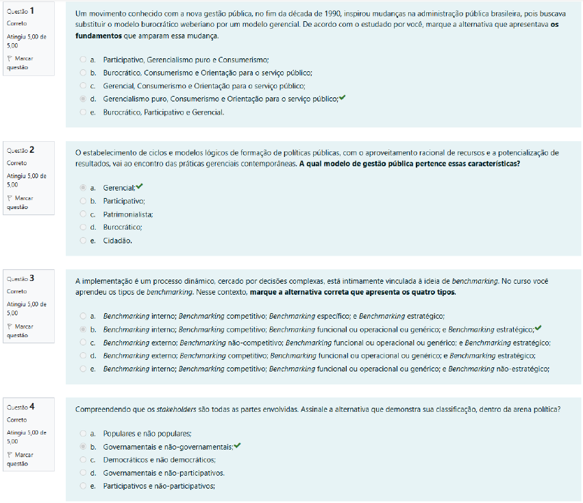 Questão 1 Um movimento conhecido com a nova gestão pública, no fim da década de 1990, inspirou mudanças na administração pública brasileira, pois buscava Correto substituir modelo burocrático weberiano por um modelo gerencial. De acordo com estudado por você, marque a alternativa que apresentava os Atingiu 5,00 de fundamentos que amparam essa mudança. 5,00 P Marcar a. Participativo, Gerencialismo puro e Consumerismo; questão b. Burocrático, Consumerismo e Orientação para serviço público; C. Gerencial, Consumerismo e Orientação para serviço público; d. Gerencialismo puro, Consumerismo e Orientação para serviço e. Burocrático, Participativo e Gerencial. Questão 2 estabelecimento de ciclos e modelos lógicos de formação de políticas públicas, com aproveitamento racional de recursos e a potencialização de Correto resultados, vai ao encontro das práticas gerenciais contemporâneas. A qual modelo de gestão pública pertence essas características? Atingiu 5.00 de 5,00 a. Gerencial; P Marcar b. Participativo; questão C. Patrimonialista; d. Burocrático; e. Cidadão. Questão 3 A implementação é um processo dinâmico, cercado por decisões complexas, está intimamente vinculada à ideia de benchmarking. No curso você Correto aprendeu os tipos de benchmarking. Nesse contexto, marque a alternativa correta que apresenta os quatro tipos. Atingiu 5.00 de 5,00 a. Benchmarking interno; Benchmarking competitivo; Benchmarking específico; e Benchmarking estratégico; P Marcar b. Benchmarking interno; Benchmarking competitivo; Benchmarking funcional ou operacional ou genérico; e Benchmarking estratégico; questão C. Benchmarking externo; Benchmarking não-competitivo; Benchmarking funcional ou operacional ou genérico; e Benchmarking estratégico; d. Benchmarking externo; Benchmarking competitivo; Benchmarking funcional ou operacional ou genérico; e Benchmarking estratégico; e. Benchmarking interno; Benchmarking competitivo; Benchmarking funcional ou operacional ou genérico; e Benchmarking não-estratégico; Questão 4 Compreendendo que os stakeholders são todas as partes envolvidas. Assinale a alternativa que demonstra sua classificação, dentro da arena política? Correto Atingiu 5,00 de a. Populares e não populares; 5,00 b. Governamentais e P Marcar Democráticos e não democráticos; questão d. Governamentais e não-participativos. e. Participativos e não-participativos;Questão 5 objetivo principal de qualquer ação pública é, portanto, atender de maneira efetiva a demanda envolvida em um problema identificado. Conforme Correto estudado no curso, marque a alternativa que apresenta as etapas de caracterização da política pública. Atingiu 5,00 de 5,00 a. Avaliação de Diagnóstico e Avaliação de Resultados; P Marcar b. Diagnóstico, incremental e da garbage can (lata de lixo). questão C. Diagnóstico (SWOT), benchmarking, brainstorming, redesenho incremental e nudge; d. Diagnóstico do problema (causas), objetivo (para quê?), público-alvo (para quem?), meios e instrumentos (como?), atores e arranjos institucionais (quem?), definição de e. Análise ex-ante; Análise ex-post; Avaliação in itinere; e Avaliação de resultados; Questão 6 Stakeholders ou Atores Políticos (policy actors), são definidos, pelos estudiosos, como as partes interessadas ou intervenientes. Sobre esse assunto Correto julgue os itens abaixo como VERDADE ou FALSO: Atingiu 5,00 de 5,00 No âmbito da segurança pública, stakeholders são todas as partes envolvidas, como as polícias, os bombeiros, as guardas municipais, os P Marcar agentes de trânsito, a vigilância privada, as associações de moradores, poder público nos três níveis (União, Estados e Municípios), questão representantes de grupos diversos (comerciais, industriais, associações, representantes de segmentos da sociedade), órgãos públicos em geral; II. ) Existem várias partes envolvidas que não apenas aquelas atingidas diretamente; III. Às vezes, até mesmo concorrentes são contados como stakerholders; Considera-se stakerholders se seu status não tem capacidade de afetar a empresa ou outros projetos que tenham interesse; Marque a sequência CORRETA: a. F,F,V,F. b. C. d. V,F,V,F; Questão 7 investimento no capital intelectual das organizações, mediante preparo dos gestores públicos, diminui o risco da não realização da política pública. Correto Assinale a opção que apresenta os benefícios do investimento na capacitação de servidores e seus efeitos na formulação da política pública. Atingiu 5,00 de 5,00 a. Não contribui para sustentabilidade da política pública; P Marcar b. Conhecimento científico, mas não contribuir para a longevidade das opções escolhidas pelo tomador de decisão. questão C. Não possibilita maior profissionalismo, accountability e legitimação; d. Conhecimento científico e essenciais na formulação de políticas públicas, além de contribuir para a longevidade das opções escolhidas pelo tomador de decisão; e. Não passa a ser veículo de estímulo à pesquisa; Questão 8 Considerando elementos conceituais trazidos por Tinbergen, Bobrow e suas 10 "máximas" ou mandamentos, que precisam ser pensados ao se Correto desenhar uma política pública, julgue os itens em VERDADEIRO ou FALSO: Atingiu 5,00 de 5,00 1.( ) Abordagem interdisciplinar: Ao buscar informações em outros segmentos, é possível preencher as lacunas; P Marcar II. ( ) Condições mínimas que as políticas devem proporcionar: Se não ocorrerem, a política provavelmente não vai funcionar. questão III. Salvaguardas: às vezes as repercussões são mais localizadas, que exigirá salvaguardas contra impactos às partes afetadas. IV. Contextualização: possibilitam uma melhor compreensão de mundo, e um melhor ponto de partida para novas formulações de políticas. Análise de oposições: deve-se levar em consideração vários atores e pensar na cadeia; VI. ) Ajuste fino: