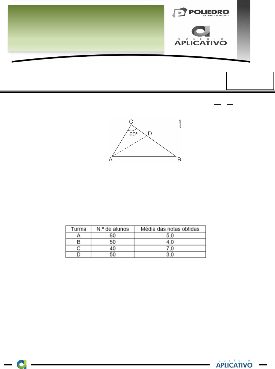 PTT13– 1º ano – Ensino Médio – 24/julho/2020 1) No triângulo ABC exibido na figura a seguir, AD é a bissetriz do ângulo interno em A, e AD DB.= O ângulo interno em A é igual a a) 60° b) 70° c) 80° d) 90° 2) A tabela acima se refere a uma prova aplicada a 200 alunos, distribuídos em 4 turmas A, B, C e D. A média aritmética das notas dessa prova é a) 4,65 b) 4,25 c) 4,45 d) 4,55 e) 4,35 3) As misturas gasosas são muito comuns no cotidiano. É possível descobrir sua pressão e volume total através das pressões e volumes parciais dos gases componentes da mistura. Estamos cercados mais por misturas de gases do que por gases isolados. Em um recipiente cuja capacidade é de 6,0 litros, misturam-se 0,1 mol de nitrogênio e 0,05 mol de oxigênio. A pressão total da mistura a 27°C é: PTT1 2º ano EM 22/02/2019 Nome: ______________________________________________ 24/07/2020 PROVA DE TESTE DE TAREFA 1º ano Ensino Médio PTT13 NOTA PTT13– 1º ano – Ensino Médio – 24/julho/2020 Dados: R = 0,082 atm·L/mol·K. a) 0,05 atm b) 0,25 atm c) 0,49 atm d) 0,62 atm e) 0,74 atm. 4) Uma solução aquosa de H2SO4 é definida como ácida de Arrhenius devido à presença de: a) Água b) Enxofre c) H3O+ d) Sulfato e) OH- 5) "O anúncio do vencedor do Prêmio Nobel de Literatura de 2016 surpreendeu muitas pessoas. No dia 13 de outubro, a Academia Sueca anunciou que o astro norte-americano da música pop, Bob Dylan, era o premiado. A escolha foi recebida com pouca receptividade por alguns e com alegria e reconhecimento por muitos. Estes consideram que a escolha inusitada reflete um avanço na forma de entender a arte literária. As manifestações negativas giram justamente pelo fato de Dylan ser músico e, apesar de poeta, não ser escritor de ofício. A Academia Sueca, a responsável pela seleção do escritor, declarou que a escolha levou em conta a criação de novas expressões poéticas." No texto, três substantivos comuns são: a) pessoas, astro, músico b) surpreendeu, escolha, manifestações c) negativas, giram, poeta d) ofício, declarou, criação e) Prêmio Nobel de Literatura, Bob Dylan, Academia Sueca 6) Segundo os gêneros dos substantivos eles são classificados em dois tipos: substantivos biformes e substantivos uniformes. A alternativa que contém somente substantivos biformes é a) criança – gênio b) anjo – cônjuge c) testemunha – vítima d) professor – amigo e) artista - chefe 7) Por volta do século XVI, associa-se à formação das monarquias nacionais europeias: a) a demanda de protecionismo por parte da burguesia mercantil emergente e a circulação de um ideário político absolutista. b) a afirmação político-econômica da aristocracia feudal e a sustentação ideológica liberal para a centralização do Estado. c) as navegações e conquistas ultramarinas e o desejo de implantação de uma economia mundial de livre mercado. PTT13– 1º ano – Ensino Médio – 24/julho/2020 d) o crescimento do contingente de mão de obra camponesa e a presença da concepção burguesa de ditadura do proletariado. e) o surgimento de uma vanguarda cultural religiosa e a forte influência do ceticismo francês defensor do direito divino dos reis. 8) Os Estados Nacionais Português e Espanhol só se consolidaram efetivamente a partir do século XV. A formação desses dois Estados, que se localizam na Península Ibérica, está relacionada diretamente: a) à aliança com holandeses, que venderam os seus domínios para ambos os Estados. b) à expulsão dos muçulmanos da Península Ibérica. c) ao acordo com o califado de Córdoba, que cedeu territórios para a criação desses Estados. d) ao acordo com o Império Romano, que até então dominava a região. e) à Reforma Protestante, que mudou completamente os hábitos religiosos da Península Ibérica. 9) Ora, em todas as coisas ordenadas a algum fim, é preciso haver algum dirigente, pelo qual se atinja diretamente o devido fim. Com efeito, um navio, que se move para diversos lados pelo impulso dos ventos contrários, não chegaria ao fim de destino, se por indústria do piloto não fosse dirigido ao porto; ora, tem o homem um fim, para o qual se ordenam toda a sua vida e ação. Acontece, porém, agirem os homens de modos diversos em vista do fim, o que a própria diversidade dos esforços e ações humanas comprova. Portanto, precisa o homem de um dirigente para o fim. AQUINO. T. Do reino ou do governo dos homens: ao rei do Chipre. Escritos políticos de São Tomás de Aquino. Petrópolis: Vozes, 1995 (adaptado). No trecho citado, Tomás de Aquino justifica a monarquia como o regime de governo capaz de a) refrear os movimentos religiosos contestatórios. b) promover a atuação da sociedade civil na vida política. c) unir a sociedade tendo em vista a realização do bem comum. d) reformar a religião por meio do retorno à tradição helenística. e) dissociar a relação política entre os poderes temporal e espiritual. 10) Seu principal objetivo era demonstrar, por um raciocínio lógico formal, a autenticidade dos dogmas cristãos. A filosofia devia desempenhar um papel auxiliar na realização deste objetivo. Por isso a tese de que a filosofia está a serviço da teologia. (Antonio Carlos Wolkmer – Introdução à História do Pensamento Político) O texto deve ser relacionado com: a) a filosofia epicurista. b) a filosofia escolástica. c) a filosofia iluminista. d) o socialismo. e) o positivismo.