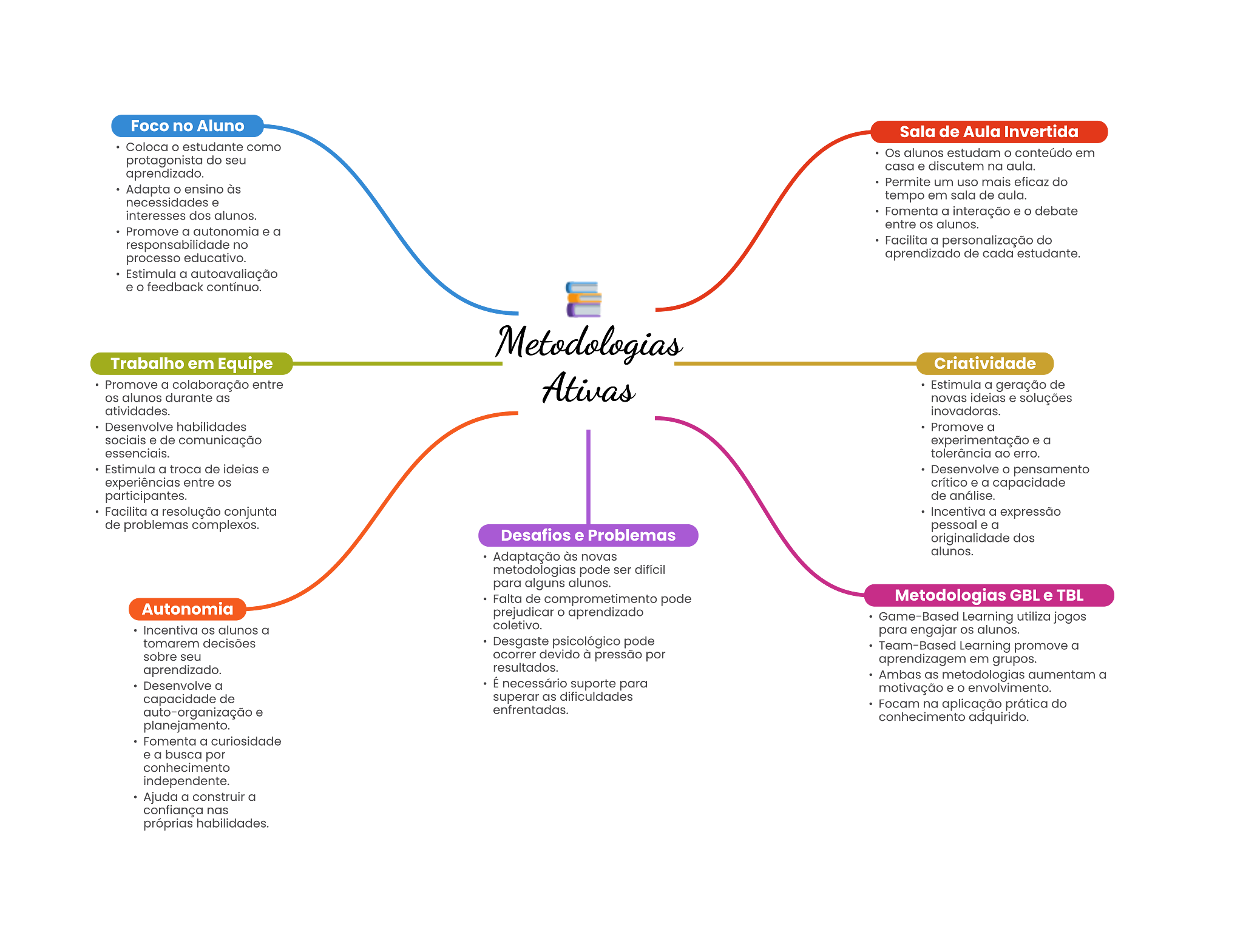Foco no Aluno Sala de Aula Invertida Coloca o estudante como alunos conteúdo em protagonista do seu casa discutem na aprendizado. Permite um uso mais eficaz do Adapta ensino de necessidades tempo em sala de Interesses alunos. a interação o debate entre Promove a autonomia a responsabilidade no Facilita a personalização do processo educativo. aprendizado de oada Estimula a feedback continuo. Trabalho em Equipe Criatividade Promove a colaboração entre Estimula a geração de alunos durante as novas soluções atividades. habilidades Promove a sociale de comunicação experimentação a erro. Estimula troca de experiências entre critico a capacidade participantes. de análise. Facilita a resolução conjunta a de pessoal a Desafios e Problemas originalidade dos Adaptação novas metodologias pode ser para alunos. Falta de comprometimento pode Metodologias GBL e TBL Autonomia prejudicar Learning utiliza jogos os alunos a para engajar decisões pode Team-Based Learning promove a sobre seu ocorrer devido por aprendizagem em grupos. aprendizado. resultados. necessário suporte para Ambas as metodologias a a motivação envolvimento. capacidade de auto-organização Focam na aplicação do conhecimento adquirido. Fornenta a curiosidade a busca por conhecimento Ajuda a construir a confiança nos próprias habilidades.