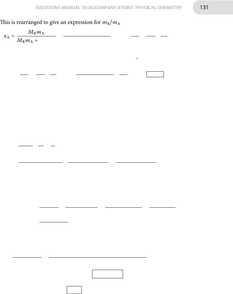 SOLUTIONSMANUAL TO ACCOMPANY ATKINS' PHYSICAL CHEMISTRY 131 �is is rearranged to give an expression for mB/mA xA = MBmA MBmA +MAmB = MB MB +MA(mB/mA) hence mB mA = MB MA ( 1 xA − 1) �e molar mass of A (ethylbenzene, C8H10) is 106.159 gmol−1, and that of B (benzene) is 78.1074 gmol−1. With these values and xA = 1 2 mB mA = MB MA ( 1 xA − 1) = 78.1074 gmol −1 106.159 gmol−1 ( 1 1/2 − 1) = 0.7358 More simply, if equal amounts in moles of A and B are required, the ratio of the corresponding masses of A and B must be equal to the ratio of their molar masses: mB/mA = MB/MA. E5B.8(b) �e ideal solubility of solute B at temperature T is given by [5B.14–162], ln xB = (∆fusH/R)(1/Tf − 1/T), where ∆fusH is the enthalpy of fusion of the solute, and Tf is the freezing point of the pure solute. ln xB = ∆fusH R ( 1 Tf − 1 T ) = 5.2 × 103 Jmol−1 8.3145 JK−1mol−1 ( 1 (327 + 273.15) K − 1 (280 + 273.15) K ) = −0.0885... hence xB = 0.915.... �e mole fraction is expressed in terms of the molality, bB = nB/mA, wheremA is the mass of the solvent in kg, in the following way xB = nB nA + nB = nB mA/MA + nB = nB/mA 1/MA + nB/mA = bB 1/MA + bB hence bB = xB (1 − xB)MA where MA is the molar mass of A, expressed in kg mol−1. �e molar mass of solvent bismuth is 208.98 gmol−1 or 208.98 × 10−3 kgmol−1, therefore bB = xB (1 − xB)MA = 0.915... (1 − 0.915...) × (208.98 × 10−3 kgmol−1) = 51.6... mol kg−1 �emolality of the solution is therefore 52 mol kg−1 .�emolarmass of solute Pb is 207.2 gmol−1, so themass of Pbwhich is dissolved per kg is (51.6... mol kg−1) ×(1 kg)×(207.2 gmol−1) = 11 kg . With somuchmore solute Pb than solvent Bi, the solution cannot really be described as Pb dissolved in Bi. E5B.9(b) �e vapour pressure of the solute in an ideal dilute solution obeys Henry’s law, [5A.24–152], pB = KBxB, and the vapour pressure of the solvent obeys Raoult’s law, [5A.22–151], pA = p∗AxA. pB = KBxB = (73 kPa) × 0.066 = 4.81... kPa pA = p∗AxA = (23 kPa) × (1 − 0.066) = 21.4... kPa ptot = pA + pA = (4.81... kPa) + (21.4... kPa) = 26.3... kPa