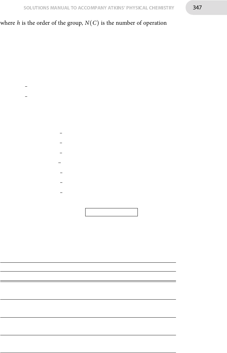 SOLUTIONSMANUAL TO ACCOMPANY ATKINS' PHYSICAL CHEMISTRY 347 where h is the order of the group, N(C) is the number of operations in class C, χ(Γ) is the character of class C in the irreducible representation Γ, and χ(C) is the character of class C in the representation being reduced. For the point group D2h, h = 8. Because the representation to be reduced has characters of zero for all classes except E and σ x y , only these latter two classes will make a non-zero contribution to the sum.�e number of times that the irreducible representation Ag occurs is n(Ag) = 1 8 (N(E)×χ(Ag)(E)×χ(E) + N(σ x y)×χ(Ag)(σ x y)×χ(σ x y)) = 1 8 (1×1×4 + 1×1×(−4)) = 0 Similarly n(B1g) = 1 8 (1×1×4 + 1×1×(−4)) = 0 n(B2g) = 1 8 (1×1×4 + 1×(−1)×(−4)) = 1 n(B3g) = 1 8 (1×1×4 + 1×(−1)×(−4)) = 1 n(Au) = 1 8 (1×1×4 + 1×(−1)×(−4)) = 1 n(B1u) = 1 8 (1×1×4 + 1×(−1)×(−4)) = 1 n(B2u) = 1 8 (1×1×4 + 1×1×(−4)) = 0 n(B3u) = 1 8 (1×1×4 + 1×1×(−4)) = 0 �e four pz orbitals therefore span B2g + B3g +Au + B1u . (b) �e SALCs of B2g, B3g, Au and B1u symmetries are generated by applying the projection operator to the pA orbital using the method described in Section 10C.2(b) on page 409. Row E Cz2 C y2 Cx2 i σ x y σ yz σ zx 1 e�ect on pA pA pC −pB −pD −pC −pA pB pD 2 characters for B2g 1 −1 1 −1 1 −1 1 −1 3 row 1 × row 2 pA −pC −pB pD −pC pA −pB pD 4 characters for B3g 1 −1 −1 1 1 −1 1 −1 5 row 1 × row 4 pA −pC pB −pD −pC pA pB −pD 6 characters for Au 1 1 1 1 −1 −1 −1 −1 7 row 1 × row 6 pA pC −pB −pD pC pA −pB −pD 8 characters for B1u 1 1 −1 −1 −1 −1 1 1 9 row 1 × row 8 pA pC pB pD pC pA pB pD �e SALCs are formed by summing rows 3, 5, 7, and 9 and dividing each