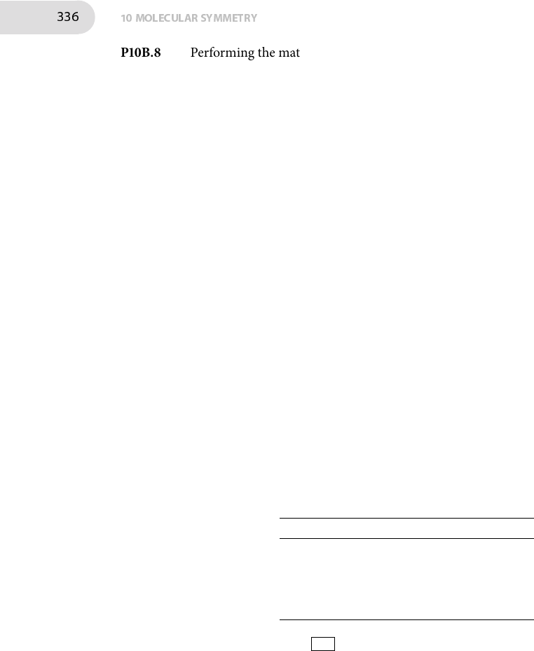 336 10MOLECULAR SYMMETRY P10B.8 Performing the matrix multiplications gives σxσx = (0 11 0)(0 11 0) = (1 00 1) = σ0 σxσy = (0 11 0)(0 −ii 0 ) = ( i 00 −i) = iσz σxσz = (0 11 0)(1 00 −1) = (0 −11 0 ) = −iσy σxσ0 = (0 11 0)(1 00 1) = (0 11 0) = σx σyσx = (0 −ii 0 )(0 11 0) = (−i 00 i ) = −iσz σyσy = (0 −ii 0 )(0 −ii 0 ) = (1 00 1) = σ0 σyσz = (0 −ii 0 )(1 00 −1) = (0 ii 0) = iσx σyσ0 = (0 −ii 0 )(1 00 1) = (0 −ii 0 ) = σy σzσx = (1 00 −1)(0 11 0) = ( 0 1−1 0) = iσy σzσy = (1 00 −1)(0 −ii 0 ) = ( 0 −i−i 0 ) = −iσx σzσz = (1 00 −1)(1 00 −1) = (1 00 1) = σ0 σzσ0 = (1 00 −1)(1 00 1) = (1 00 −1) = σz σ0σx = (1 00 1)(0 11 0) = (0 11 0) = σx σ0σy = (1 00 1)(0 −ii 0 ) = (0 −ii 0 ) = σy σ0σz = (1 00 1)(1 00 −1) = (1 00 −1) = σz σ0σ0 = (1 00 1)(1 00 1) = (1 00 1) = σ0 �e RR′ multiplication table is therefore R ↓ R′ → σx σy σz σ0 σx σ0 iσz −iσy σx σy −iσz σ0 iσx σy σz iσy −iσx σ0 σz σ0 σx σy σz σ0 �e four matrices do not form a group under multiplication. �is is because they do not satisfy criterion 3 in Section 10B.1 on page 397, that the combination RR′ must be equivalent to a single member of the collection. For example, σxσy = iσz , but iσz is not one of the four matrices. P10B.10 �e twowavefunctions are shown schematically in Fig. 10.16, where the shading indicates the sign of the wavefunction. It is clear from Fig. 10.16 that a C+4 rotation, taken to be 90○ anticlockwise, converts ψ2,3 into ψ3,2 and ψ3,2 into −ψ2,3: (ψ3,2 −ψ2,3 )← (ψ2,3 ψ3,2 ). Sim- ilarly C−4 transforms (−ψ3,2 ψ2,3 )← (ψ2,3 ψ3,2 ), C2 changes the sign of both wavefunctions, while E leaves both unchanged. Writing these using matrix multiplication gives