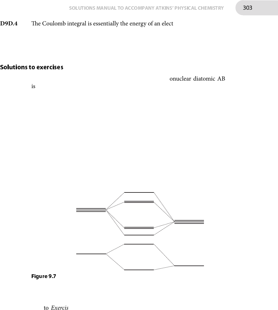 SOLUTIONSMANUAL TO ACCOMPANY ATKINS' PHYSICAL CHEMISTRY 303 D9D.4 �e Coulomb integral is essentially the energy of an electron when it occupies an atomic orbital in the molecule. �e resonance integral is a contribution to the energy of a molecule that can be associated with an electron interacting with more than one nucleus at once. Solutions to exercises E9D.1(b) �e molecular orbital energy level diagram for a heteronuclear diatomic AB is similar to that for a homonuclear diatomic A2 (Fig. 9C.11 on page 361 or Fig. 9C.12 on page 361) except that the atomic orbitals on A and B are no longer at the same energies. As a result the molecular orbitals no longer have equal contributions from the orbitals on A and B; furthermore, it is more likely that the s and p orbitals will mix. From simple considerations it it not possible to predict the exact ordering of the resulting molecular orbitals, so the diagram shown Fig. 9.7 is simply one possibility. Note that because the heteronuclear diatomic no longer has a centre of symmetry the g/u labels are not applicable. �e electronic con�gurations are: (i) XeF (15 valence electrons) 1σ2 2σ2 3σ2 1π4 2π4 4σ1; (ii) PN (10 valence elec- trons) 1σ2 2σ2 3σ2 1π4; (iii) SO– (13 valence electrons) 1σ2 2σ2 3σ2 1π4 2π3. A BMolecule 3s or 5s 3p of 5p 3σ 2σ 4σ 1σ 1π 2π 2s 2p Figure 9.7 E9D.2(b) �e molecular orbital diagram of IF is similar to the one shown in the solu- tion to Exercise E9D.1(b) where the orbitals on atom A are 5s and 5p. It is not possible to predict the precise energy ordering of the orbitals from simple considerations, so this diagram is simply a plausible suggestion. IF has 7+7 = 14 valence electrons, therefore the ground state electron con�gu- ration is 1σ2 2σ2 3σ2 1π4 2π4. IF+ has one fewer electron than IF, therefore it has one fewer electron on the antibonding 2π orbital. IF– has one more electron than IF, therefore it has one more electron accommodated on the antibonding 4σ orbital. Hence the order of decreasing bond order is IF+, IF, IF– , which is expected to be the same as the order of increasing bond length.