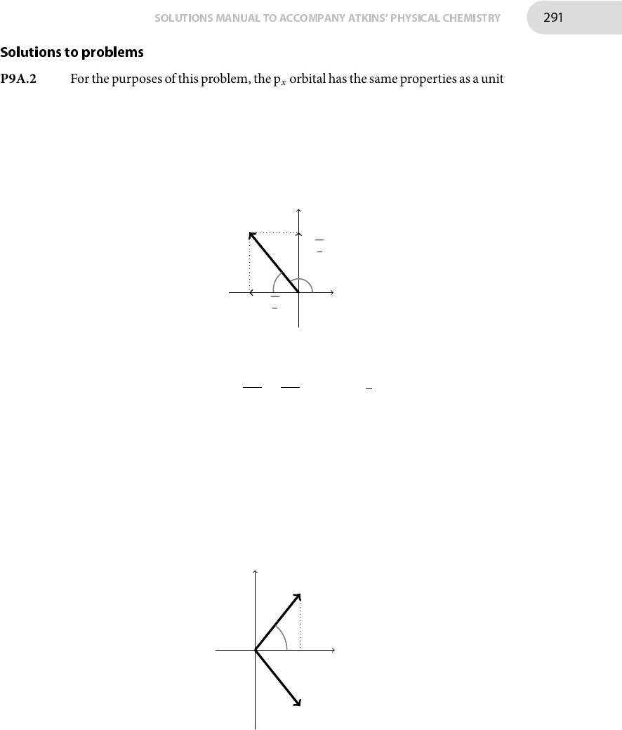 SOLUTIONSMANUAL TO ACCOMPANY ATKINS' PHYSICAL CHEMISTRY 291 Solutions to problems P9A.2 For the purposes of this problem, the px orbital has the same properties as a unit vector along the x-axis and the py orbital is likewise a unit vector along the y- axis.�e hybrid orbital ψ is represented by a vector resulting from the addition of the vectors representing the px and py orbitals. �e s orbital is spherically symmetric about the origin, therefore it has no e�ect on the direction of the hybrid. x y √ 3 2py − √ 1 2px ψ βα �e angle α is calculated as α = tan−1 ( √ 3/2/ √ 1/2) = tan−1 √ 3 = 60○ �erefore the vector representingψmakes and angle β = 180○−α = 180○−60○ = 120○ to the x-axis. P9A.4 Following the same logic as in Problem P9A.2 and Problem P9A.2, the vector representation of the two hybrid atomic orbitals is as shown below. h1 h2 x y θ/2 It follows from the diagram that for h1 the contribution from px is proportional to cos θ/2, and the contribution from py is proportional to sin θ/2; for h2 all that is di�erent is that the sign of the contribution from py is reversed. Both hybrids will have a contribution from the s orbital, and so can be written h1 = s+λ (cos(θ/2)px + sin(θ/2)py) h2 = s+λ (cos(θ/2)px − sin(θ/2)py)