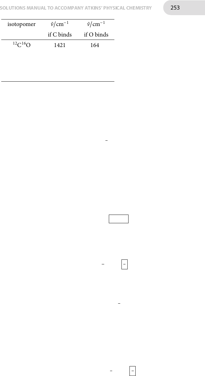 SOLUTIONSMANUAL TO ACCOMPANY ATKINS' PHYSICAL CHEMISTRY 253 isotopomer ν̃/cm−1 ν̃/cm−1 if C binds if O binds 12C16O 1421 1640 13C16O 1421 1576 12C18O 1339 1640 13C18O 1339 1576 �e force constant is found using ν̃ = (1/2πc) (kf/µ)1/2, rearranged to kf = µ(2πν̃c)2. P7E.10 �e ground-state wavefunction is found from [7E.7–275] as ψ0(y) = N0e−y 2/2. �e normalization constant is found by evaluating N20 ∫ +∞ −∞ e−y 2 dy = 2N20 ∫ +∞ 0 e−y 2 dy = 2N20 × ( 12π1/2) = 1 where required integral is of the formof IntegralG.1with k = 1.�e normalized wavefunction is therefore ψ0(y) = π−1/4e−y 2/2. (a) For the expectation value of y, the integral to evaluate is ⟨y⟩ = ∫ ∞ −∞ ψ∗0 yψ0 dy = π−1/2 ∫ ∞ −∞ y e−y 2 dy �e integrand is an odd function, meaning that its value at −y′ is the negative of its value at y′, and so when integrated over a symmetrical range about y = 0 the result is necessarily zero. Hence ⟨y⟩ = 0 . (b) To calculate ⟨y2⟩ the required integral is of the form of Integral G.3 with k = 1 ⟨y2⟩ = ∫ ∞ −∞ ψ∗0 y 2ψ0 dy = π−1/2 ∫ ∞ −∞ y2e−y 2 dy = 2π−1/2 ∫ ∞ 0 y2e−y 2 dy = 2π−1/2 × 1 4π1/2 = 1 2 (c) �e �rst excited state is ψ1(y) = N1 ye−y 2/2. �e normalization constant is found by evaluating N21 ∫ +∞ −∞ y2e−y 2 dy = 2N21 ∫ +∞ 0 y2e−y 2 dy = 2N21 × ( 14π1/2) = 1 where required integral is of the form of Integral G.3 with k = 1. �e normalized wavefunction is therefore ψ1(y) = (4/π)1/4 y e−y 2/2. �e expectation value of y is zero for the same reason as in (a). To calcu- late ⟨y2⟩ the required integral is of the form of Integral G.5 with k = 1 ⟨y2⟩ = ∫ ∞ −∞ ψ∗1 y 2ψ1 dy = (4/π)1/2 ∫ ∞ −∞ y4e−y 2 dy = 2(4/π)1/2 ∫ ∞ 0 y4e−y 2 dy = 2(4/π)1/2 × 3 8π1/2 = 3 2
