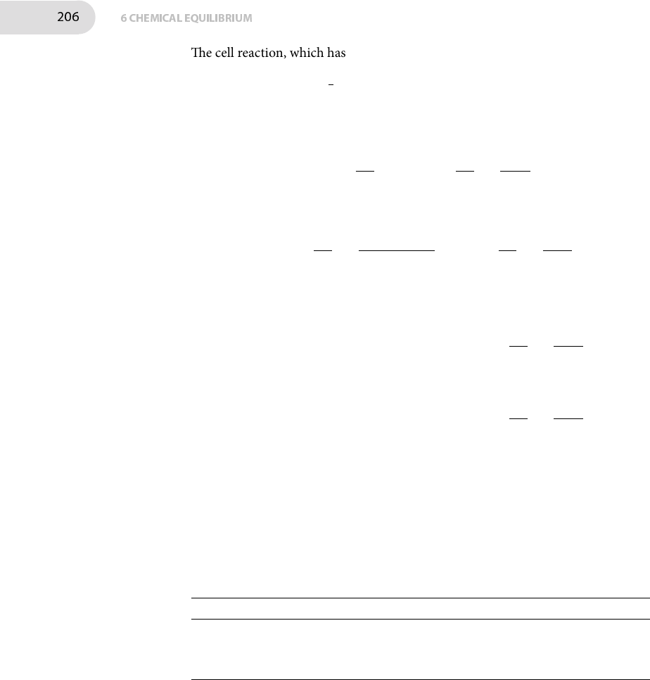 206 6 CHEMICAL EQUILIBRIUM �e cell reaction, which has ν = 1, is AgCl(s) + 1 2H2(g) +OH −(aq)→ Ag(s) +Cl−(aq) Noting that aJ = 1 for pure solids, and that in this cell aH2 = 1 because the hydrogen is at standard pressure, the Nernst equation for the cell is Ecell = E−○cell − RT νF lnQ = E−○cell − RT F ln( aCl − aOH− ) Writing the activities as a = γ±(b/b−○), the Nernst equation becomes Ecell = E−○cell − RT F ln( γ±(bCl−/b−○) γ±(bOH−/b−○) ) = E−○cell − RT F ln( bCl − bOH− ) �e standard cell potential is split into contributions from the two electrodes using [6D.3–224], E−○cell = E−○(R) − E−○(L) Ecell = E−○(AgCl/Ag, Cl−) − E−○(H2O/H2 , OH−) − RT F ln( bCl − bOH− ) Hence E−○(H2O/H2 , OH−) = E−○(AgCl/Ag, Cl−) − Ecell − RT F ln( bCl − bOH− ) �is equation is used with bCl− = 0.01125 mol kg−1, bOH− = 0.0100 mol kg−1, and the values of Ecell and E−○(AgCl/Ag, Cl−) to calculate E−○(H2O/H2 , OH−) at each temperature.�e relation derived earlier pKw = −(F/RT ln 10)E−○(H2O/H2 , OH−) is then used to calculate pKw.�e results are given in the following table. θ/○C T/K Ecell/V E−○(AgCl/Ag, Cl−)/V E−○(H2O/H2 , OH−)/V pKw 20.0 293.15 1.047 74 0.225 02 −0.825 70 14.20 25.0 298.15 1.048 64 0.222 30 −0.829 37 14.02 30.0 303.15 1.049 42 0.219 59 −0.832 91 13.85 To �nd ∆rS−○ for the autoprotolysis, the relationship between E−○cell and temper- ature [6C.6–222], dE−○cell/dT = ∆rS−○/νF is used. If ∆rS−○ is constant over the temperature range this equation implies that a plot of E−○cell against T should be a straight line of slope ∆rS−○/νF. In this case E−○cell for the autoprotolysis reaction is equal to E−○(H2O/H2 , OH−) as explained earlier.�e plot is shown in Fig. 6.4. �e data fall on a good straight line, the equation of which is E−○(H2O/H2 , OH−)/V = −7.229 × 10−4 × (T/K) − 0.6137