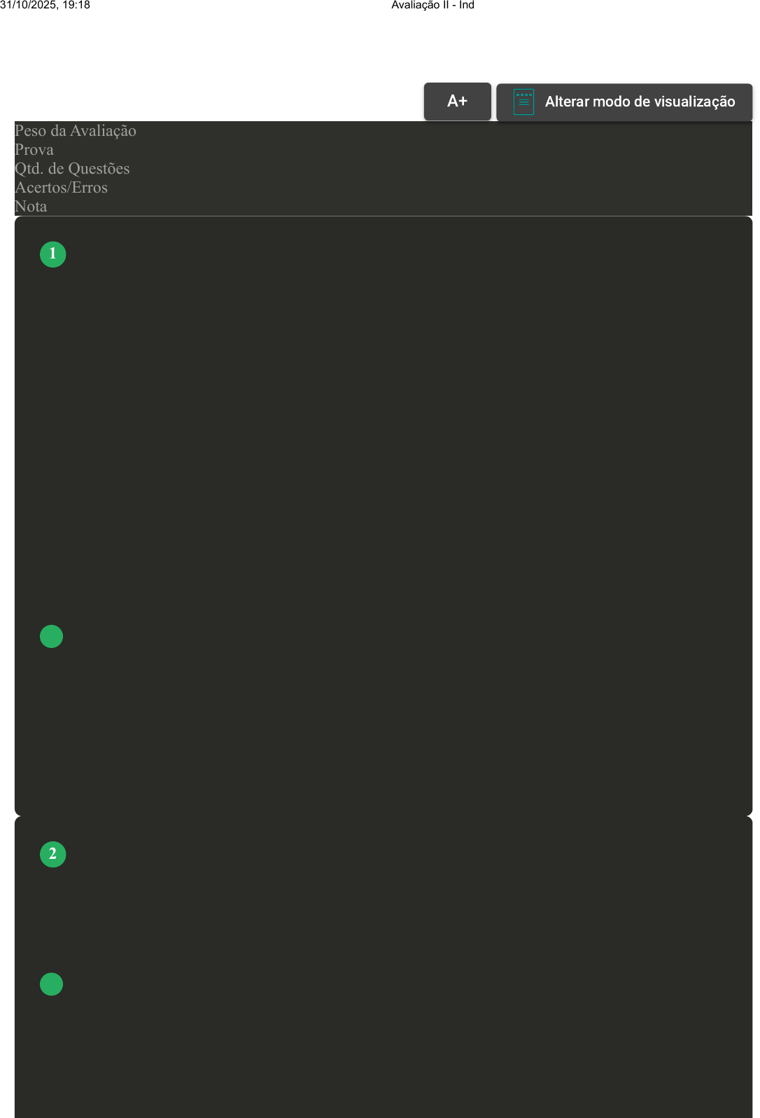 Prova Impressa GABARITO | Avaliação II - Individual (Cod.:1523341) Peso da Avaliação 2,00 Prova 108767464 Qtd. de Questões 10 Acertos/Erros 8/2 Nota 8,00 O conhecimento da composição química das sementes e grãos é essencial para determinar seu uso mais apropriado em diferentes setores, como a alimentação humana e animal, a indústria de óleos e biocombustíveis, a produção de medicamentos, cosméticos e bebidas. As sementes podem ser classificadas de acordo com o tipo de reserva nutritiva predominante, que influencia diretamente em sua destinação tecnológica e nutricional. Assim, identificam-se sementes amiláceas, oleaginosas ou proteicas, conforme apresentem maior acúmulo de amido, lipídios ou proteínas, respectivamente, em seus tecidos de reserva. Essa classificação é fundamental para o aproveitamento racional dos recursos agrícolas. Fonte: FILHO, J. M. Fisiologia de sementes de plantas cultivadas. Londrina: Abrates, 2015. De acordo com o tipo de reservas nutritivas predominante as sementes, analise as afirmativas a seguir: I. Amiláceas: quando a principal reserva nutritiva é o amido. II. Oleaginosas: quando a reserva predominante são os lipídios. III. Córneas: quando a principal reserva nutritiva são as proteínas. IV. Fibrosas: quando a reserva predominante é a celulose, utilizada como principal fonte de energia para a plântula. É correto o que se afirma em: A III e IV, apenas. B I, II e III, apenas. C I, II, III e IV. D II e IV, apenas. E III, apenas. A silvicultura é uma parte integrante das ciências florestais, abrangendo tecnologia que assegure a produção, reprodução, estabelecimento, manutenção, recuperação e vitalidade das árvores e das florestas. Essa ciência pode ser dividida em silvicultura extensiva e intensiva. Fonte: FLOR, H. M. Silvicultura extensiva nos empreendimentos rurais. São Paulo: Cone, 2014. Assinale a alternativa correta que compreende uma característica da silvicultura extensiva: A Praticada sob baixo custo operacional por hectare. B Necessidade de grandes investimentos. C Adoção de alta tecnologia. VOLTAR A+ Alterar modo de visualização 1 2 31/10/2025, 19:18 Avaliação II - Individual about:blank 1/6 D Tem a necessidade de atender a grandes mercados consumidores. E Proporciona a obtenção de elevadas produtividades. A palavra hortaliça é abrangente e refere-se a um grupo de plantas que apresentam consistência tenra, não lenhosa, ciclo biológico curto e tratos culturais intensivos. Popularmente, as hortaliças ou suas partes comestíveis são denominadas impropriamente de legumes. Os legumes são espécies vegetais que pertencem à família Fabaceae e apresentam um tipo de fruto seco com as sementes protegidas por uma vagem. Fonte: FILGUEIRA, F. A. R. Novo Manual de olericultura: agrotecnologia moderna na produção e comercialização de hortaliças. 3. ed. Viçosa: UFV, 2013. Neste sentido, assinale a alternativa que compreende a leguminosa: A Phaseolus lunatus (fava). B Capsicum annuum (pimentão). C Cucumis anguria (maxixe). D Cucurbita moschata (abóbora). E Abelmoschus esculentus (quiabo). A classificação técnica das hortaliças, desenvolvida por pesquisadores e professores da Universidade Federal de Viçosa e posteriormente adotada pelas Centrais de Abastecimento (CEASAs) em todo o país, organiza esses alimentos com base na parte utilizável que é comestível da planta. Essa sistematização busca facilitar a comercialização, o estudo agronômico e o consumo, agrupando as hortaliças em três grandes categorias. Fonte: FILGUEIRA, F. A. R. Novo Manual de olericultura: agrotecnologia moderna na produção e comercialização de hortaliças. 3. ed. Viçosa: UFV, 2013. Assinale a alternativa que compreende exemplos de hortaliças-fruto: A Tomate, feijão e quiabo. B Alface, repolho e aspargo. C Couve-flor, melancia e melão. D Melão, quiabo e alho. E Rabanete, morango e tomate. 3 4 Revisar Conteúdo do Livro 31/10/2025, 19:18 Avaliação II - Individual about:blank 2/6 A produção de frutas representa um dos segmentos mais relevantes do agronegócio brasileiro, tanto pela sua contribuição econômica quanto pelo papel social que desempenha na geração de emprego e renda. Esse setor é responsável por abastecer o mercado interno com uma ampla diversidade de frutas frescas, além de impulsionar as exportações, consolidando o Brasil como um dos maiores produtores mundiais. A fruticultura pode ser compreendida como o conjunto de conhecimentos, técnicas e práticas agrícolas voltadas para o cultivo, manejo e aproveitamento das plantas frutíferas, de forma a garantir a produção de frutos comestíveis de qualidade. Fonte: adaptado de: FACHINELLO, J. C.; NACHTIGAL, J. C.; KERSTEN, E. Fruticultura Fundamentos e Práticas. Pelotas: Embrapa, 2009. Sobre a caracterização do cultivo de espécies frutíferas, analise as afirmativas a seguir: I. Contribui para importações. II. Apresenta mão de obra intensiva. III. Promove o desenvolvimento de agroindústrias. IV. Necessita de mão de obra intensiva durante o manejo.É correto o que se afirma em: A II, III e IV, apenas. B II e IV, apenas. C III, apenas. D III e IV, apenas. E I, II, III e IV. As plantas daninhas são caracterizadas pela sua indesejabilidade e interferência negativa em um cultivo agrícola. As espécies daninhas altamente competitivas apresentam habilidades de produzir grande número de propágulos e diásporos por planta, apresentam dormência e são resistentes a insetos pragas e doenças. Fonte: SILVA, A. A.; SILVA, J. F. Tópicos em manejo de plantas daninhas. Viçosa: UFV, 2014. De acordo com os prejuízos ocasionados por plantas daninhas, analise as afirmativas a seguir: I. Algumas espécies podem atuar como hospedeiras alternativas para insetos pragas e patógenos. II. A produtividade da espécie cultivada é reduzida devido à competição por água, luminosidade, CO2 e nutrientes. III. As espécies como Palicourea m
