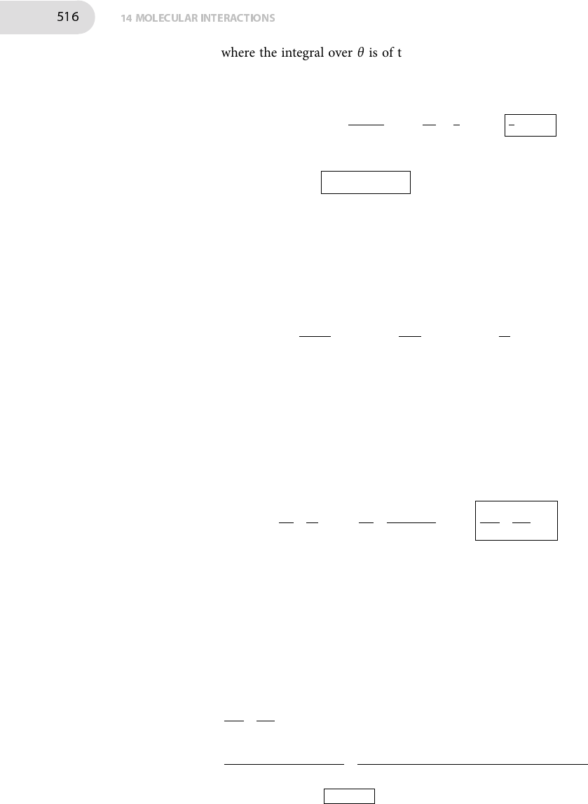 516 14MOLECULAR INTERACTIONS where the integral over θ is of the form of Integral T.3 with k = 1 and a = π.�e total mass of the sphere is mtot = ρV = (4/3)ρπa3, hence the moment of inertia can be expressed as I = mtot × 3 4ρπa3 × ρ × a 5 5 × 4 3 × 2π = 2 5mtota 2 A rigid rotor with the same mass as the sphere has moment of inertia I = mtotR2g , hence Rg = (2/5)1/2a . Note that this is the radius of gyration associated with rotation about this axis. P14D.6 �e radius of gyrationRg is foundby equatingmtotalR2g to themoment of inertia I, hence R2g = I/mtotal.�e moment of inertia is given by I = ∑ N j m jR2j , where m j is the mass of unit j and R j is its distance from the centre of mass. If all N units have the same mass m then I = m∑ j R2j and mtotal = Nm. Hence Rg = 1 mtotal ∑ j m jR2j = 1 Nm ×m∑ j R2j = 1 N ∑ j R2j P14D.8 As explained in�e chemist’s toolkit 18 in Topic 7E on page 273, the frequency of a harmonic oscillatorwithmassm and force constant kf is ν = (1/2π)(kf/m)1/2. �e force constant is given by [14D.12c–621], kf = kT/Nl 2. �e mass is taken as the mass of one monomer, which is given by m = M/NNA where M is the molar mass of the macromolecule and N is the number of monomers in the chain. Combining these expressions gives ν = 1 2π ( kf m ) 1/2 = 1 2π ( kT/Nl 2 M/NNA ) 1/2 = 1 2πl (RT M ) 1/2 where R = kNA is used. �emonomer of polyethene –[CH2CH2]n– is taken to be CH2CH2.�e length of each CH2CH2 unit is estimated as the length of a two C–C bonds: one C–C bond in the centre and half a bond length either side where the unit connects to carbons in adjacent units. From Table 9C.2 on page 362 a C–C bond length is approximately 154 pm, so the monomer length l is taken as 2 × (154 pm) = 308 pm. Noting that 1 J = 1 kgm2 s−2 and 1Hz = 1 s−1, the vibration frequency is therefore ν = 1 2πl (RT M ) 1/2 = 1 2π × (308 × 10−12 m) ((8.3145 JK−1mol−1) × ([20 + 273.15] K) 65 kgmol−1 ) 1/2 = 3.16... × 109 Hz = 3.2 GHz �e expression shows that the frequency increases with temperature and de- creases with increasing molar mass.�e T1/2 dependence re�ects the thermal