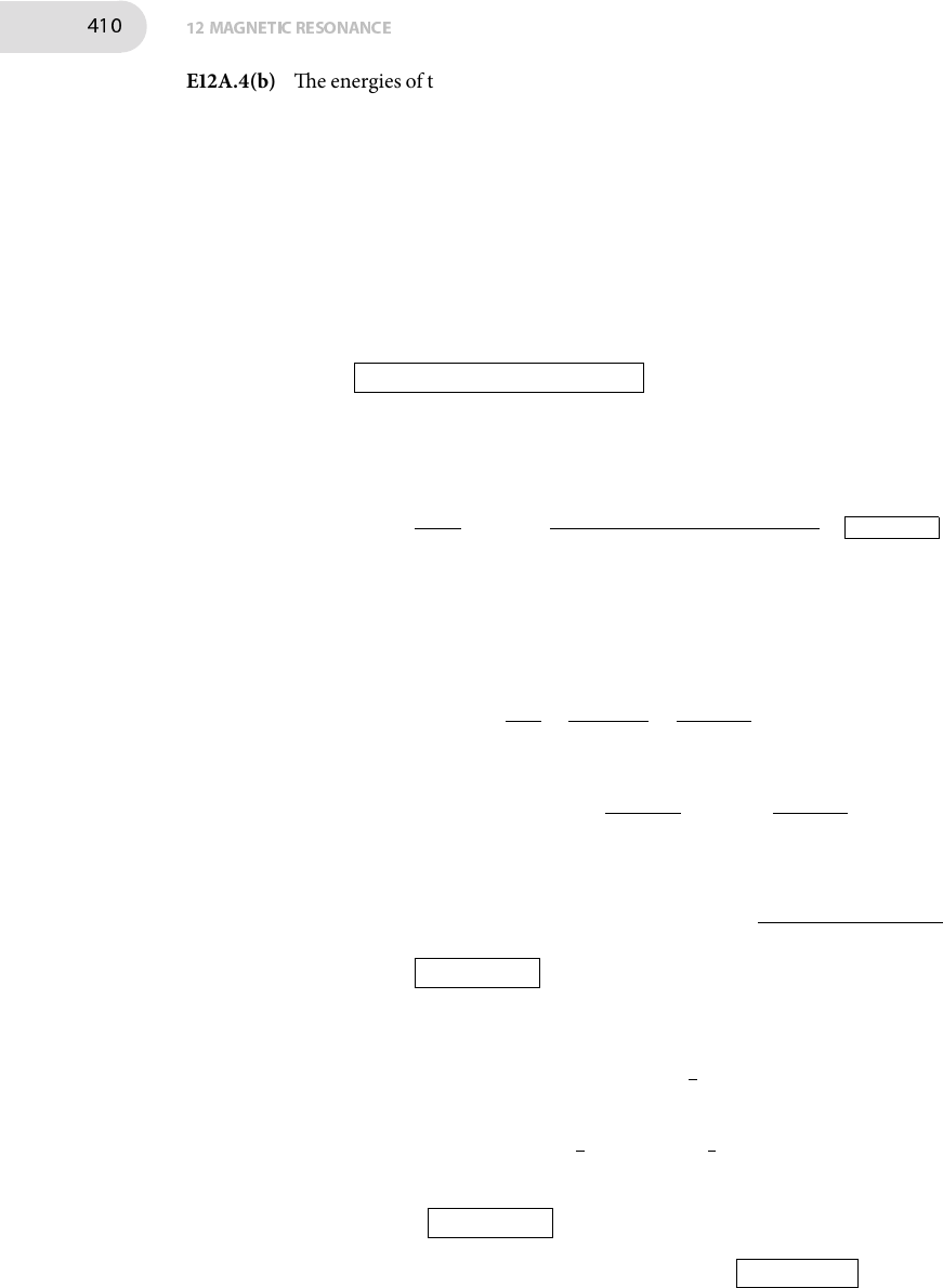 410 12MAGNETIC RESONANCE E12A.4(b) �e energies of the nuclear spin states in a magnetic �eld are given by [12A.4d– 489], EmI = −gIµNB0mI where gI is the nuclear g-factor, µN is the nuclear magneton, B0 is the magnitude of the magnetic �eld, and the component of the angular momentum on a speci�ed axis is mIħ where mI = I, I − 1, ...,−I. �erefore, since the possible values ofmI are 0,±1, the energies of nuclear spin states are EmI = −gIµNB0mI = −(0.404) × (5.0508 × 10−27 J T−1) × (10.50 T) ×mI = (−2.14... × 10−26 J) ×mI Hence E0 = 0 and E±1 = ∓2.14 × 10−26 J . E12A.5(b) �e energy level separation is ∆E = hν where ν = γNB0/2π, [12A.6–489]. Hence, in megahertz, the frequency separation is ν = 10−6 × γNB0 2π = 10−6 × (1.93 × 107 T−1 s−1) × (14.4 T) 2π = 44.2 MHz E12A.6(b) For nuclei the energy level separation is ∆E = hν where ν = γNB0/2π, [12A.6– 489]. For the samemagnetic �eld the Larmor frequencies, andhence the energy separations, of the two nuclei are in the ratio of their magnetogyric ratios ν14N ν1H = ∆E( 14N) ∆E(1H) = γN(14N) γN(1H) hence ∆E(14N) = ∆E(1H) × γN(14N) γN(1H) = hν1H × γN(14N) γN(1H) With the values given ∆E(14N) = (6.6261 × 10−34 J s) × (600 × 106 Hz) × (1.93 × 107 T−1 s−1) (26.75 × 107 T−1 s−1) = 2.87 × 10−26 J �e energies of the electron spin states in amagnetic �eld are given by [12A.11c– 492], Ems = geµBB0ms where ge = 2.0023 is the g-value of the free electron, B0 is the magnitude of the magnetic �eld,ms = ± 12 , and µB is the Bohr magneton. �e energy separation is therefore ∆E = E+1/2 − E−1/2 = ( 12 geµBB0) − (− 12 geµBB0) = geµBB0 = (2.0023) × (9.2740 × 10−24 J T−1) × (0.300 T) = 5.57 × 10−24 J Hence the energy level separation of the electron is much greater than that of the 14N nucleus under the conditions given.