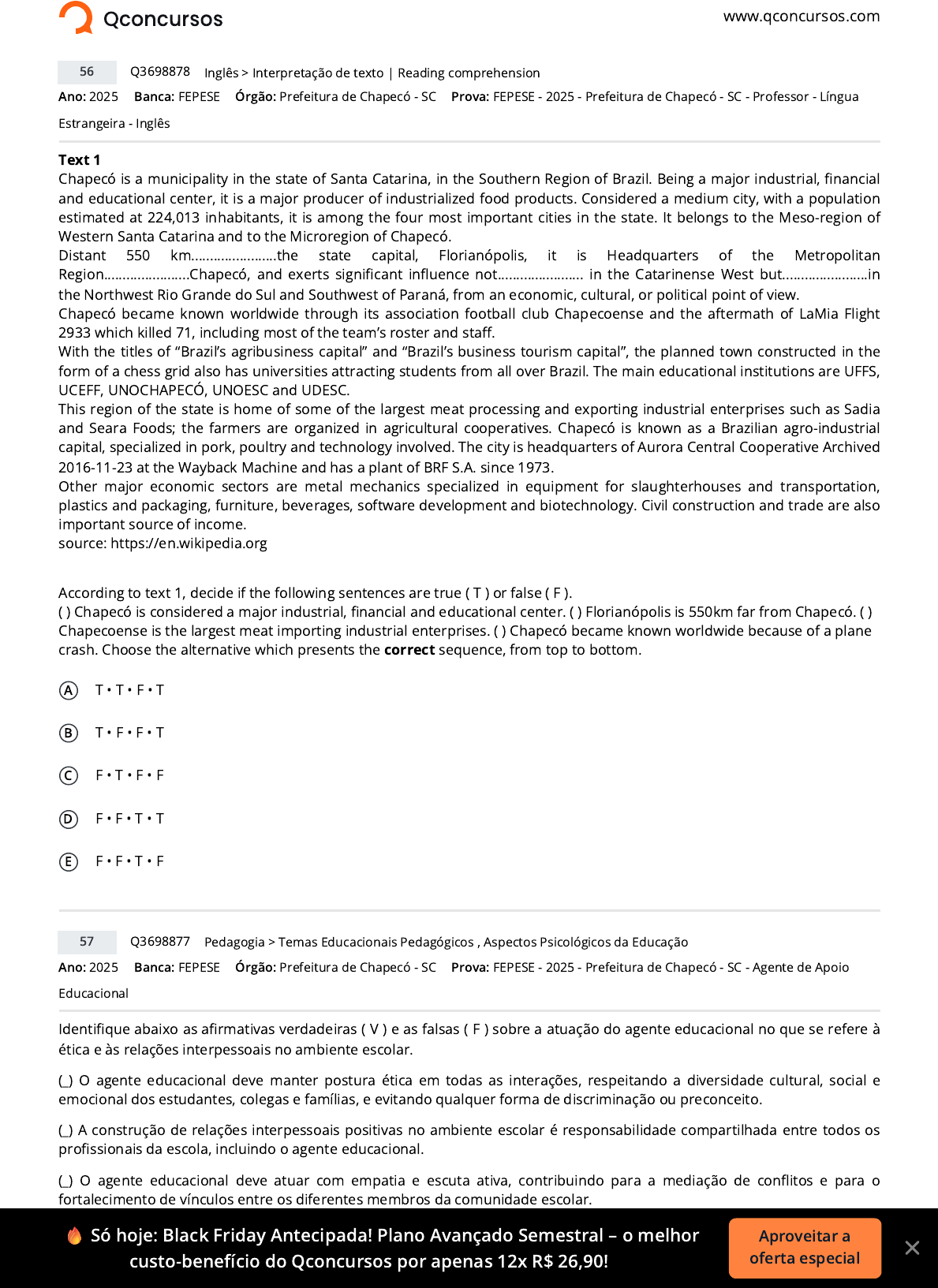 www.qconcursos.com Ano: 2025 Banca: FEPESE Órgão: Prefeitura de Chapecó - SC Text 1 Chapecó is a municipality in the state of Santa Catarina, in the Southern Region of Brazil. Being a major industrial, financial and educational center, it is a major producer of industrialized food products. Considered a medium city, with a population estimated at 224,013 inhabitants, it is among the four most important cities in the state. It belongs to the Meso-region of Western Santa Catarina and to the Microregion of Chapecó. Distant 550 km.......................the state capital, Florianópolis, it is Headquarters of the Metropolitan Region.......................Chapecó, and exerts significant influence not....................... in the Catarinense West but.......................in the Northwest Rio Grande do Sul and Southwest of Paraná, from an economic, cultural, or political point of view. Chapecó became known worldwide through its association football club Chapecoense and the aftermath of LaMia Flight 2933 which killed 71, including most of the team’s roster and staff. With the titles of “Brazil’s agribusiness capital” and “Brazil’s business tourism capital”, the planned town constructed in the form of a chess grid also has universities attracting students from all over Brazil. The main educational institutions are UFFS, UCEFF, UNOCHAPECÓ, UNOESC and UDESC. This region of the state is home of some of the largest meat processing and exporting industrial enterprises such as Sadia and Seara Foods; the farmers are organized in agricultural cooperatives. Chapecó is known as a Brazilian agro-industrial capital, specialized in pork, poultry and technology involved. The city is headquarters of Aurora Central Cooperative Archived 2016-11-23 at the Wayback Machine and has a plant of BRF S.A. since 1973. Other major economic sectors are metal mechanics specialized in equipment for slaughterhouses and transportation, plastics and packaging, furniture, beverages, software development and biotechnology. Civil construction and trade are also important source of income. source: https://en.wikipedia.org According to text 1, decide if the following sentences are true ( T ) or false ( F ). ( ) Chapecó is considered a major industrial, financial and educational center. ( ) Florianópolis is 550km far from Chapecó. ( ) Chapecoense is the largest meat importing industrial enterprises. ( ) Chapecó became known worldwide because of a plane crash. Choose the alternative which presents the correct sequence, from top to bottom. A T • T • F • T B T • F • F • T C F • T • F • F D F • F • T • T E F • F • T • F Ano: 2025 Banca: FEPESE Órgão: Prefeitura de Chapecó - SC Identifique abaixo as afirmativas verdadeiras ( V ) e as falsas ( F ) sobre a atuação do agente educacional no que se refere à ética e às relações interpessoais no ambiente escolar. (_) O agente educacional deve manter postura ética em todas as interações, respeitando a diversidade cultural, social e emocional dos estudantes, colegas e famílias, e evitando qualquer forma de discriminação ou preconceito. (_) A construção de relações interpessoais positivas no ambiente escolar é responsabilidade compartilhada entre todos os profissionais da escola, incluindo o agente educacional. (_) O agente educacional deve atuar com empatia e escuta ativa, contribuindo para a mediação de conflitos e para o fortalecimento de vínculos entre os diferentes membros da comunidade escolar. (_) A ética profissional do agente educacional permite o compartilhamento de informações sensíveis sobre os estudantes com qualquer membro da comunidade escolar, desde que a intenção seja o auxílio ao mediado. 56 Q3698878 >Inglês Interpretação de texto | Reading comprehension Prova: FEPESE - 2025 - Prefeitura de Chapecó - SC - Professor - Língua Estrangeira - Inglês 57 Q3698877 >Pedagogia Temas Educacionais Pedagógicos , Aspectos Psicológicos da Educação Prova: FEPESE - 2025 - Prefeitura de Chapecó - SC - Agente de Apoio Educacional 🔥 Só hoje: Black Friday Antecipada! Plano Avançado Semestral – o melhor custo-benefício do Qconcursos por apenas 12x R$ 26,90! Aproveitar a oferta especial https://www.qconcursos.com/ https://www.qconcursos.com/questoes-de-concursos/bancas/fepese https://www.qconcursos.com/questoes-de-concursos/institutos/prefeitura-de-chapeco-sc https://www.qconcursos.com/questoes-de-concursos/bancas/fepese https://www.qconcursos.com/questoes-de-concursos/institutos/prefeitura-de-chapeco-sc https://www.qconcursos.com/questoes-de-concursos/questoes/da03dc65-b6 https://www.qconcursos.com/questoes-de-concursos/disciplinas/letras-ingles https://www.qconcursos.com/questoes-de-concursos/disciplinas/letras-ingles/interpretacao-de-texto-reading-comprehension https://www.qconcursos.com/questoes-de-concursos/provas/fepese-2025-prefeitura-de-chapeco-sc-professor-lingua-estrangeira-ingles https://www.qconcursos.com/questoes-de-concursos/provas/fepese-2025-prefeitura-de-chapeco-sc-professor-lingua-estrangeira-ingles https://www.qconcursos.com/questoes-de-concursos/questoes/86aacef2-b6 https://www.qconcursos.com/questoes-de-concursos/disciplinas/pedagogia-pedagogia https://www.qconcursos.com/questoes-de-concursos/disciplinas/pedagogia-pedagogia/temas-educacionais-pedagogicos https://www.qconcursos.com/questoes-de-concursos/disciplinas/pedagogia-pedagogia/aspectos-psicologicos-da-educacao https://www.qconcursos.com/questoes-de-concursos/provas/fepese-2025-prefeitura-de-chapeco-sc-agente-de-apoio-educacional https://www.qconcursos.com/questoes-de-concursos/provas/fepese-2025-prefeitura-de-chapeco-sc-agente-de-apoio-educacional Assinale a alternativa que indica a sequência correta, de cima para baixo. A V • V • V • F B V • V • F • V C V • F • V • F D F • F • V • F E F • F • F • V Ano: 2025 Banca: FEPESE Órgão: Prefeitura de Chapecó - SC Na Educação Infantil, o agen