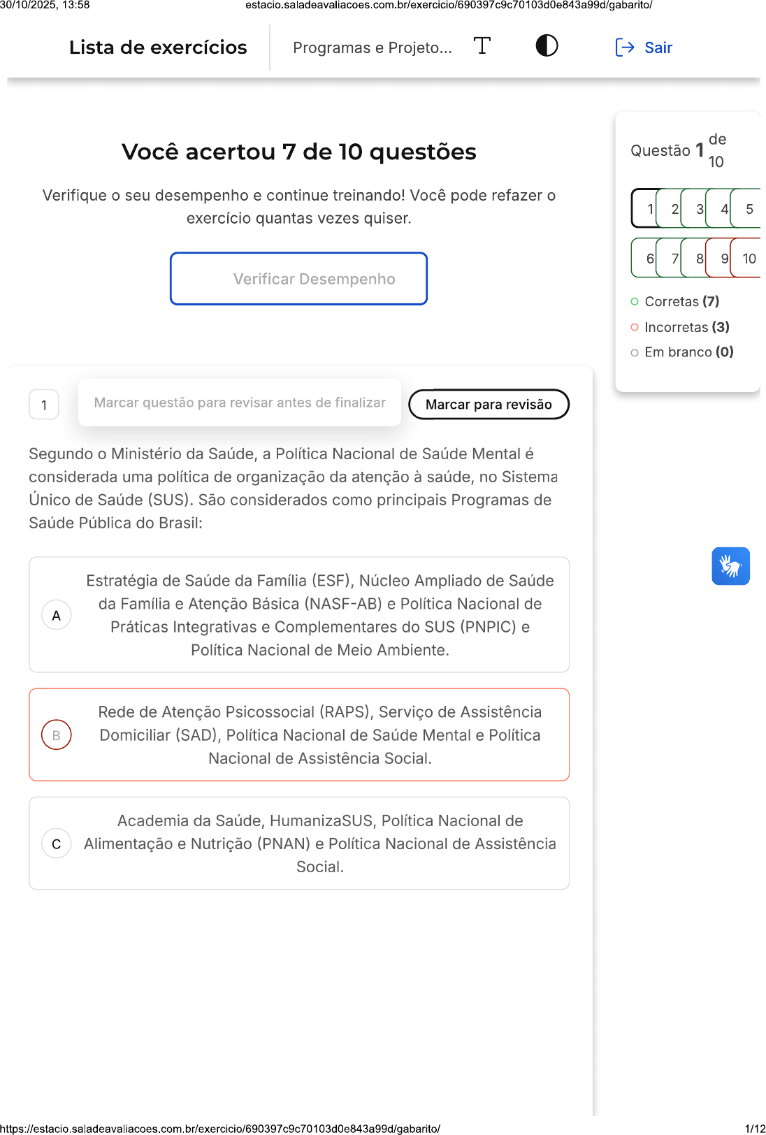 30/10/2025, 13:58 estacio.saladeavaliacoes.com.br/exercicio/690397c9c70103d0e843a99d/gabarito/ Lista de exercícios Programas e Projeto... T Sair de Você acertou 7 de 10 questões Questão 1 10 Verifique o seu desempenho e continue treinando! Você pode refazer 1 2 3 4 5 exercício quantas vezes quiser. 6 7 8 9 10 Verificar Desempenho Corretas (7) Incorretas (3) Em branco (0) 1 Marcar questão para revisar antes de finalizar Marcar para revisão Segundo Ministério da Saúde, a Política Nacional de Saúde Mental é considerada uma política de organização da atenção à saúde, no Sistema Único de Saúde (SUS). São considerados como principais Programas de Saúde Pública do Brasil: Estratégia de Saúde da Família (ESF), Núcleo Ampliado de Saúde da Família e Atenção Básica (NASF-AB) e Política Nacional de A Práticas Integrativas e Complementares do SUS (PNPIC) e Política Nacional de Meio Ambiente. Rede de Atenção Psicossocial (RAPS), Serviço de Assistência Domiciliar (SAD), Política Nacional de Saúde Mental e Política Nacional de Assistência Social. Academia da Saúde, HumanizaSUS, Política Nacional de c Alimentação e Nutrição (PNAN) e Política Nacional de Assistência Social. 1/1230/10/2025, 13:58 Rede Cegonha, Programa Saúde na Escola (PSE), Política D Nacional de Alimentação e Nutrição (PNAN) e Política Nacional de Práticas Integrativas e Complementares do SUS (PNPIC). Estratégia de Saúde da Família (ESF), Serviço de Assistência E Domiciliar (SAD), Política Nacional de Saúde Mental e Política Nacional de Assistência Social. X Resposta incorreta Opa! A alternativa correta é a letra D. Confira gabarito comentado! Gabarito Comentado A alternativa correta é a letra D. A Rede Cegonha, Programa Saúde na Escola (PSE), a Política Nacional de Alimentação e Nutrição (PNAN) e a Política Nacional de Práticas Integrativas e Complementares do SUS (PNPIC) são considerados como principais Programas de Saúde Pública do Brasil. Esses programas são parte integrante da Política Nacional de Saúde Mental, que é uma política de organização da atenção à saúde no Sistema Único de Saúde (SUS). Cada um desses programas tem um papel específico na promoção da saúde e no cuidado com a população, contribuindo para a melhoria da qualidade de vida e para a prevenção de doenças. 2 Marcar para revisão De acordo com Instituto Brasileiro de Geografia e Estatística (IBGE), no ano de 2015 os dados apontaram que 53,9% da população brasileira se reconhecia de cor ou raça preta ou parda. Para melhorar a assistência à saúde da população negra, Ministério da Saúde, em conjunto com ParticipaSUS, criou em 2009 a Política Nacional de Saúde Integral da População Negra. Sobre essa política, analise as afirmativas a seguir: I. Essa política inclui ações de cuidado, atenção, promoção à saúde e prevenção de doenças, bem como de gestão participativa. II. A população negra apresenta maior vulnerabilidade quando comparada às outras raças apenas em relação às condicionantes saúde-doença. III. Cabe aos gestores e profissionais da saúde garantir e ampliar acesso da população negra às ações e serviços de saúde apenas nos grandes centros urbanos. 2/1230/10/2025, 13:58 estacio.saladeavaliacoes.com.br/exercicio/690397c9c70103d0e843a99d/gabarito/ Estão CORRETAS as alternativas: A le II, apenas. B e III, apenas. c I, apenas. D II, apenas. E III, apenas. Resposta correta Parabéns, você selecionou a alternativa correta. Confira gabarito comentado! Gabarito Comentado A afirmativa I está correta, pois a Política Nacional de Saúde Integral da População Negra realmente inclui ações de cuidado, atenção, promoção à saúde e prevenção de doenças, além de gestão participativa. No entanto, a afirmativa está incorreta, pois a população negra apresenta maior vulnerabilidade não apenas em relação às condicionantes saúde-doença, mas também em relação às desigualdades sociais. A afirmativa III também está incorreta, pois a responsabilidade de garantir e ampliar acesso da população negra às ações e serviços de saúde não se limita aos grandes centros urbanos, mas se estende a todas as cidades do país. 3 Marcar para revisão Escolha a alternativa que complementa texto sobre a Lei n° 8.080/90: "Dispõe sobre as condições para a e da saúde, a organização e funcionamento dos serviços correspondentes." 3/1230/10/2025, 13:58 A Prevenção, programas e recuperação. Promoção, proteção e recuperação. c Promoção, prevenção e educação. D Prevenção, prevenção e atenção básica. E Proteção, promoção e cuidados. Resposta correta Parabéns, você selecionou a alternativa correta. Confira gabarito comentado! Gabarito Comentado A alternativa correta é a letra B: "Promoção, proteção e recuperação". Essas palavras completam corretamente texto sobre a Lei n° 8.080/90, que estabelece as diretrizes e bases da saúde pública no Brasil. A lei dispõe sobre as condições para a promoção, proteção e recuperação da saúde, além de organizar e regular funcionamento dos serviços correspondentes. Portanto, a alternativa é a que melhor se encaixa no contexto da lei. 4 Marcar para revisão Conforme apontou levantamento realizado pelo Conselho Nacional de Secretários Estaduais de Saúde na década passada, mais de 50% dos brasileiros interrompem tratamento devido à falta de dinheiro para comprar os remédios. Programa Farmácia Popular do Brasil, desde 2004, alinha-se às outras ações governamentais, visando ao atendimento das necessidades da população brasileira. Em relação ao tema, assinale as afirmativas a seguir: I. A Farmácia Popular é uma política pública destinada, exclusivamente, ao atendimento dos usuários dos serviços públicos de saúde que têm dificuldades em adquirir medicamentos em estabelecimentos farmacêuticos comerciais. 4/1230/10/2025, 13:58 I