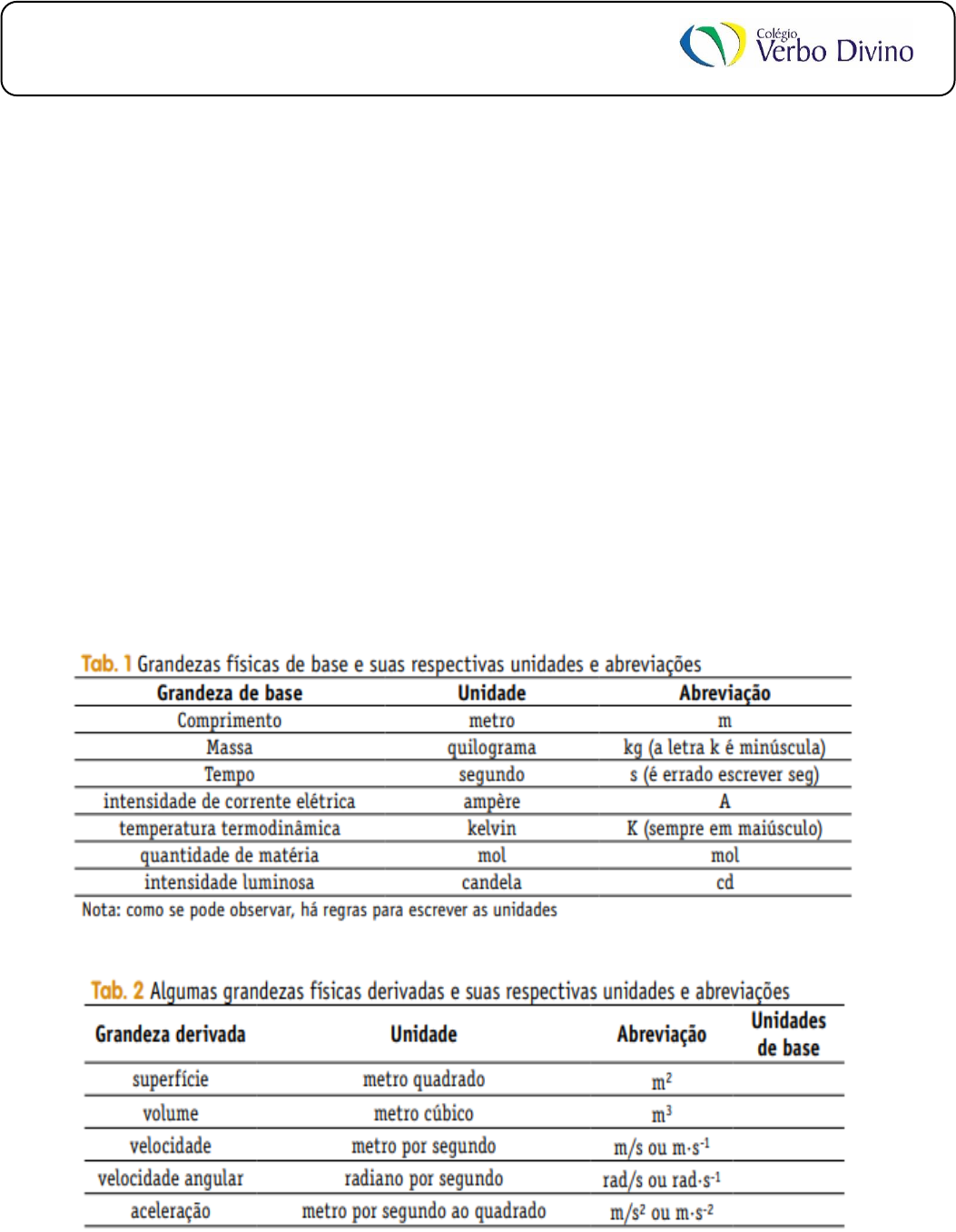 MATERIAL DE ESTUDO CIÊNCIAS/FÍSICA I 8º ANO EF I Prof. Rafael Pereira Atividade: 1 1) Grandezas físicas: Uma grandeza física é uma propriedade de um corpo, ou particularidade de um fenômeno, capaz de ser medida, ou seja, à qual se pode atribuir um valor numérico. Comprimento, tempo, massa, velocidade, aceleração, energia, trabalho e potência são algumas das grandezas físicas. Essas grandezas físicas podem ser medidas ou calculadas. Para dar o resultado de uma medida ou de um cálculo, temos que adotar uma unidade. Antigamente existia um sistema que, no caso do comprimento, baseava-se no tamanho de um pé, de um polegar e assim por diante. Como tanto o comprimento de um pé como o de um polegar variava de uma pessoa para outra, foi preciso adotar padrões. Hoje, para facilitar os cálculos e a comparação entre os resultados de medidas, quase todos os países do mundo adotam o Sistema Internacional (SI) de unidades. 2) Grandezas físicas fundamentais e derivadas: A partir de 1955, a Organização Internacional de Padronização (ISO) adotou um sistema de grandezas físicas baseado em sete grandezas fundamentais e suas unidades, mostradas na tabela 1. Todas as outras grandezas derivadas (tabela 2) são definidas a partir das grandezas de base. Na tabela 3 estão listados os prefixos de múltiplos e submúltiplos das unidades no SI, com suas abreviações. 3) Conversão de unidades: É um processo fundamental e bastante aplicado na resolução de problemas do dia a dia e na solução de muitos exercícios de Física. A conversão de unidades permite transformar as formas de representação de uma grandeza de acordo com a necessidade. Para tanto, é necessário que se conheçam as unidades estabelecidas pelo sistema internacional de unidades (SI) para cada tipo de grandeza física. 4) Exercícios: 1) Transforme: a) 2 km em m = e) 27 mm em cm = b) 1,5 m em mm = f) 126 mm em m = c) 5,8 km em cm = g) 12 m em km = d) 0,4 m em mm = h) 14,8 km em dm = 2) Agora converta as unidades de área: a) 8,37 dm2 em mm2 = e) 12,9 km² em m² = b) 3,1416 m2 em cm2 = f) 15,3 m² em mm² = c) 2,14 m2 em mm2 = g) 45,8 cm2 em m2 = d) 125,8 m² em km² = h) 23,87 mm2 em m2 = 3) Depois converta as de volume: a) a) 8,132 km3 em hm3 = e) 78,5 m³ em km³ = b) 180 hm3 em km³ = f) 12 m³ em cm³ = c) 1 m3 em mm3 = g) 139 mm³ em m³ d) 5 cm³ em m³ = h) 12 dm3 em m3 = 4) Uma melancia tem massa total de 4,6 kg. Determine, em unidades do SI (Sistema Internacional de Medidas), a massa de melancia que restará após a retirada de uma fatia de 200 g. 5) Uma mangueira plástica de jardim foi cortada em três pedaços com comprimentos iguais a 15 dm, 20 cm e 400 mm. Determine o comprimento inicial da magueira em unidades do Sistema Internacional de Medidas (SI). 6) Um frasco de iogurte informa que contém 320 g do produto. A quanto equivale essa massa, em quilograma? 7) Qual é a massa, em gramas, de um bebê de 4,756 kg? 8) Um pacote com 500 folhas de papel tem massa de 2,5 kg. Admitindo que a massa das folhas seja igual, qual é a massa, em gramas, de cada uma dela? 9) Durante um mês, um elefante jovem, em crescimento, sofreu um aumento de massa de 0,179 t. A quantos quilogramas corresponde essa aumento de massa? 10) Quantas xícaras de capacidade 50 mL podem ser preenchidas com um litro de chá preparado? 11) Em uma brincadeira, um amigo lança um desafio ao outro sobre três objetos que foram inseridos em uma caixa: – O objeto A tem massa de 0,4 kg. – O objeto B tem massa de 300 g. – O objeto C tem massa de 800.000 mg. Qual a massa total em kg contida na caixa? a) 0,438. b) 0,510. c) 1,200. d) 1,500. e) 5,100.