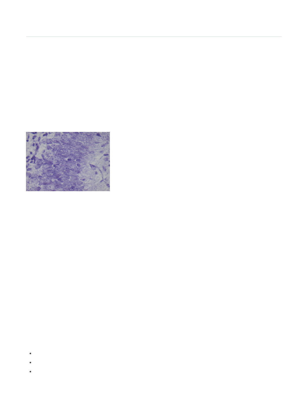 Docs » Histology » Cresyl Violet Staining (Nissl Staining) Cresyl Violet Staining (Nissl Staining) Contributed by Luke Hammond, QBI, The University of Queensland, Australia Cresyl Violet Staining for free floa�ng sec�ons, mounted and air-dried. Cresyl Violet Acetate solu�on is used to stain Nissl substance in the cytoplasm of neurons in paraformaldehyde or formalin-fixed �ssue. The neuropil will be stained a granular purple-blue. This stain is commonly used to iden�fy the neuronal structure in brain and spinal cord �ssue. The Cresyl Violet method uses basic aniline dye to stain RNA blue, and is used to highlight important structural features of neurons. The Nissl substance (rough endoplasmic re�culum) appears dark blue due to the staining of ribosomal RNA, giving the cytoplasm a mo�led appearance. Individual granules of extra-nuclear RNA are named Nissl granules (ribosomes). DNA present in the nucleus stains a similar color. The thicker sec�ons require exposure to each solu�on for longer to allow the diffusion of reagents. Requirements 95% Ethanol 70% Ethanol Differen�a�on solu�on: 2 drops glacial ace�c acid in 95% ethanol Cresyl Violet Acetate 0.2% in Acetate Buffer (Fronine, Cat No: HH155)-Filtered Method Wash slides briefly in tap water to remove any residual salts. Immerse slides through 2x3min changes of 100% ethanol. Defat the �ssue: 15min in 100% xylene(2-3 changes as directed), then 10min in 100% ethanol. https://theolb.readthedocs.io/en/latest/index.html https://theolb.readthedocs.io/en/latest/histology.html http://web.qbi.uq.edu.au/microscopy/ Rehydrate through alcohol (100% x2) 3min each. Wash in tap water. Stain in 0.1% Cresyl Violet 4-15min. Quick rinse in tap water to remove excess stain Wash in 70% ethanol (the stain will be removed by this method). If required immerse sec�ons for 2min in Differen�a�on solu�on – check staining on microscope. Dehydrate through 2x3min changes of absolute ethanol. Clear in xylene x2 and mount in DePeX. Allow dry in the fume hood. This method is based, with permission, on an original protocol available here. http://web.qbi.uq.edu.au/microscopy/?page_id=522
