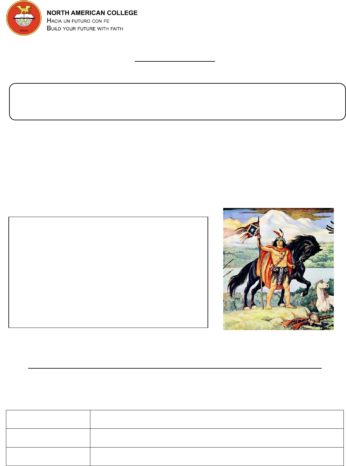 1 UNIDAD 0: EL PERIODO COLONIAL EN AMÉRICA Y EN CHILE. HISTORIA, GEOGRAFÍA Y CIENCIAS SOCIALES 6° BÁSCO GUÍA DE APRENDIZAJE LA COLONIA EN AMÉRICA Y CHILE ¿Sabías qué? Una colonia es un territorio que ha sido conquistado y dominado por otro más poderoso llamado metrópolis. Este Estado poderoso busca colonizar, es decir, ocupar y poblar el territorio conquistado de manera de poder sacar provecho de sus materias primas. El Estado dominado debe seguir cada una de las instrucciones de la metrópolis, esta última gobierna y toma todas las decisiones importantes, imponiendo un orden político y sometiendo a su población a las decisiones del gobernante extranjero. Lautaro, Oleo de Pedro Subercaseaux. La dependencia de las colonias americanas, instituciones y funcionarios coloniales. Las zonas conquistadas en América formaron parte del Imperio español. Así tras el proceso de conquista, los territorios americanos se organizaron de acuerdo con el modelo de administración establecido por la Corona española. Virreinatos División territorial, gobernada por un virrey, a quien, por nombramiento del rey, se le asigno la tarea de administrar y gobernar un país o provincia. Gobernaciones Territorios pacíficos o sin conflictos con la población indígena. Eran dirigidas por un gobernador. Capitanías Generales Zonas de especial importancia por su ubicación o por encontrarse en las zonas indígenas de difícil sometimiento. Las dirigía un jefe militar: un capitán general. Para administrar los territorios, fue necesario crear instituciones y cargos que aseguraban el cumplimiento de las órdenes del rey. Durante la colonia, el rey de España era el gobernante máximo, tanto en la península Ibérica como en América. En su persona se concentraba todos los poderes, ya que él era un monarca absoluto A continuación, se presenta un mapa con las unidades territoriales de América y otro con las autoridades e instituciones coloniales. La colonia en Chile Es el período de la Historia de Chile, que comienza luego de la batalla de Curalaba y la destrucción de las ciudades españolas al sur del río Bío-Bío por los mapuches los primeros años del siglo XVII, hasta el proceso de Independencia de Chile a comienzos del siglo XIX. Estos 200 años están marcados por la continuación de la guerra de Arauco y la formación del mestizaje, junto a la consolidación de una administración y al establecimiento de una economía monopólica dirigida por la metrópoli hispánica. Objetivo: Explicar aspectos centrales de la Colonia, como la dependencia de las colonias americanas, instituciones y funcionarios coloniales, actividades económicas y sistema de trabajo en América, a través de la lectura de guías de aprendizaje, texto escolar y guía de actividades. 2 3 La dependencia económica Las colonias americanas dependían de España en lo político y administrativo, en lo económico quedaron sometidas a un Monopolio comercial. - En América se definieron puertos específicos para ingresar los productos traídos de España y desde allí distribuirlos al resto de las colonias. - La Corona española definía lo que las colonias podían producir. - Para asegurar el cumplimiento del monopolio comercial se creó el sistema de flotas y galeones. - Debido a la necesidad de mano de obra, se introdujeron esclavos africanos en América. ACTIVIDADES PRODUCTIVAS EN AMÉRICA Minería Se centro en la explotación de plata y oro. En ambos casos, los indígenas y los esclavos fueron la mano de obra principal. Ganadería Era realizada en las estancias, grandes extensiones de terreno dedicadas a la crianza de vacunos, ovejas y mulas. Agricultura Se desarrolló principalmente en haciendas y en las plantaciones. En ella se usaba principalmente mano de obra indígena. SISTEMA DE TRABAJO EN AMÉRICA La encomienda La esclavitud El repartimiento Consistía en entregar un grupo de indígenas a un español, que se hacía cargo de ellos y pasaba a llamarse encomendero. Fue una forma d trabajo forzado. Los esclavos fueron principalmente africanos y sus descendientes, y trabajaban en las minas, en las plantaciones tropicales o del servicio doméstico. Fue una forma de trabajo impuesta a los indígenas, consistía en realizar tareas por temporadas en zonas agrícolas o en minas. Gay, C. (1854). Carretero (peón) y capataz. Productos de España Productos de América Mercurio Metales preciosos Sal Azúcar Pimienta Café Juegos de naipes Cacao Pólvora Tomate Telas Papa Papel Maíz Monopolio comercial: Es la prohibición de comerciar con otros Estados distintos a España. En Chile se distinguieron tres ciclos económicos durante la Colonia: la minería en el siglo XVI, la ganadería en el siglo XVII y la agricultura en el siglo XVIII. Un papel importante en las laborales de las haciendas fue el ejercicio por inquilinos y por peones. 4 UNIDAD 0: EL PERIODO COLONIAL EN AMÉRICA Y EN CHILE. HISTORIA, GEOGRAFÍA Y CIENCIAS SOCIALES 6° BÁSCO Guía de Aplicación LA COLONIA EN AMÉRICA Y CHILE Nombre: ________________________________________ Curso: __________ Fecha: ___________ I. Observa y colorea el mapa que se presenta a continuación, distinguiendo los territorios que constituyeron los cuatro virreinatos durante el siglo XVIII. No olvides realizar simbología, indicando el nombre de los países actuales que correspondía a cada virreinato. Responde las siguientes preguntas. a) ¿Cuántos virreinatos existieron en América a fines de la época colonial? ¿A qué virreinato pertenecía el territorio actual de Chile? __________________________________________________________________________________________ __________________________________________________________________________________________ __________________________________________________________________________________________ Simbología 5 b) ¿Qué países actuales integraban cada virreinato? Con ayuda de un atlas, identifícalos comparando un mapa político de hoy con el de 